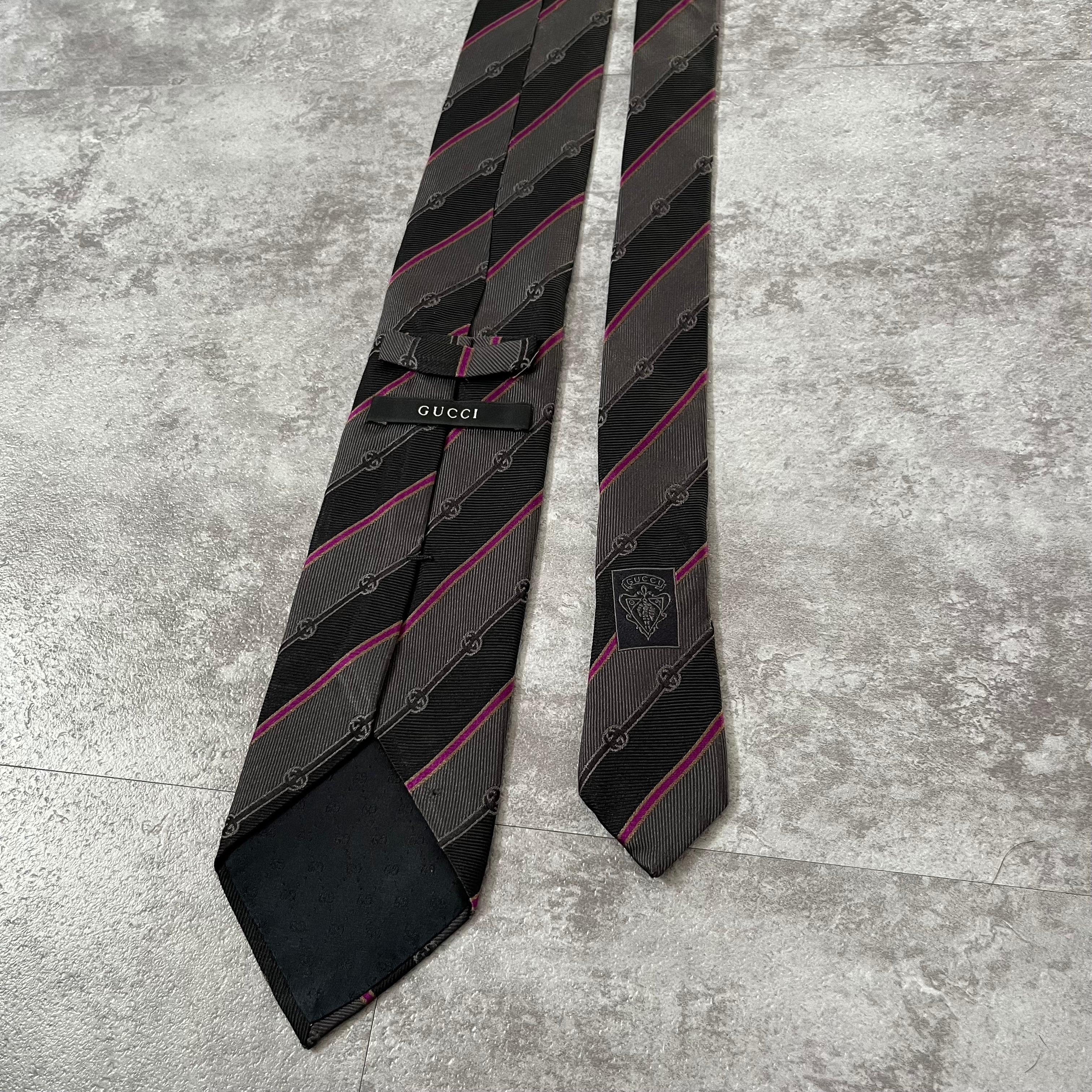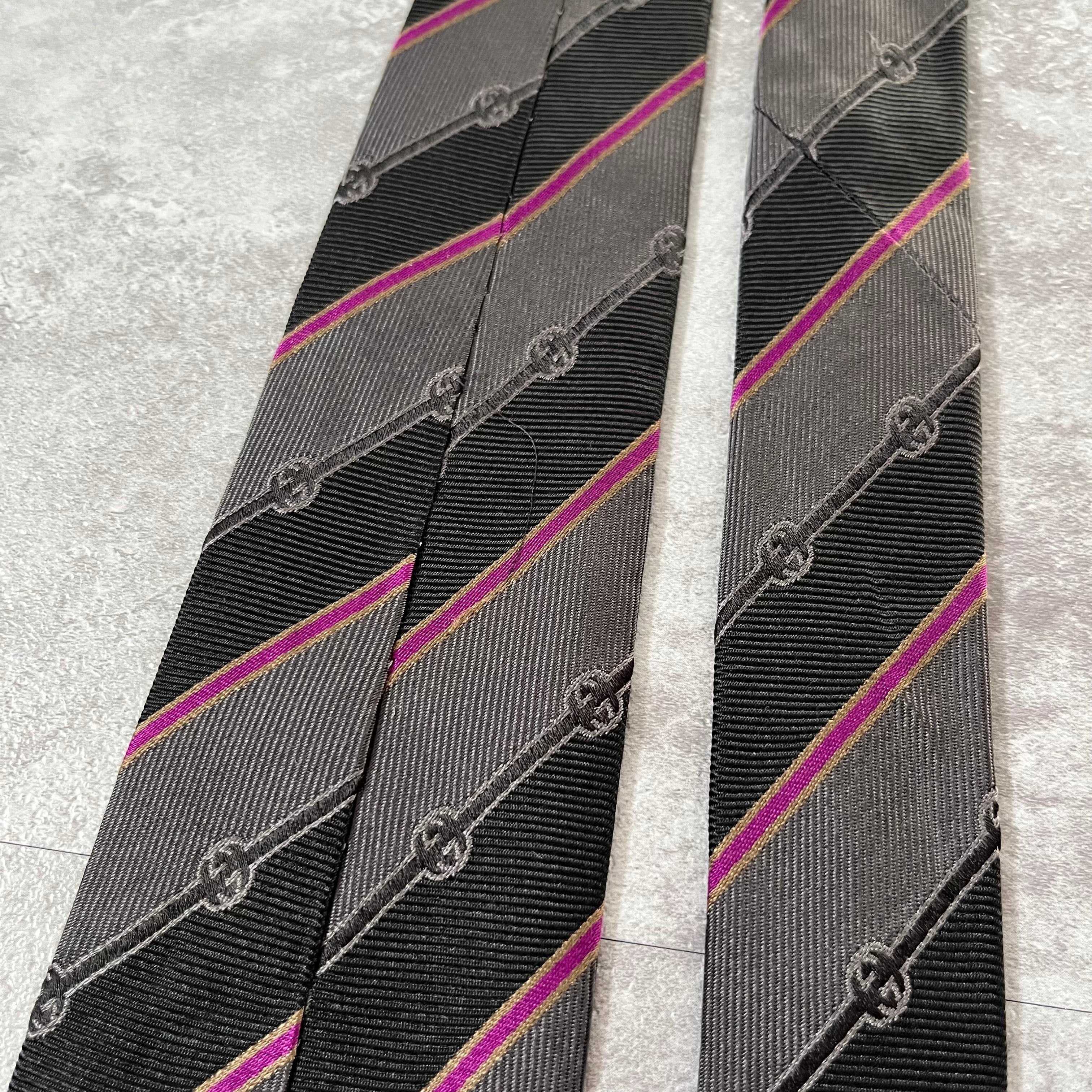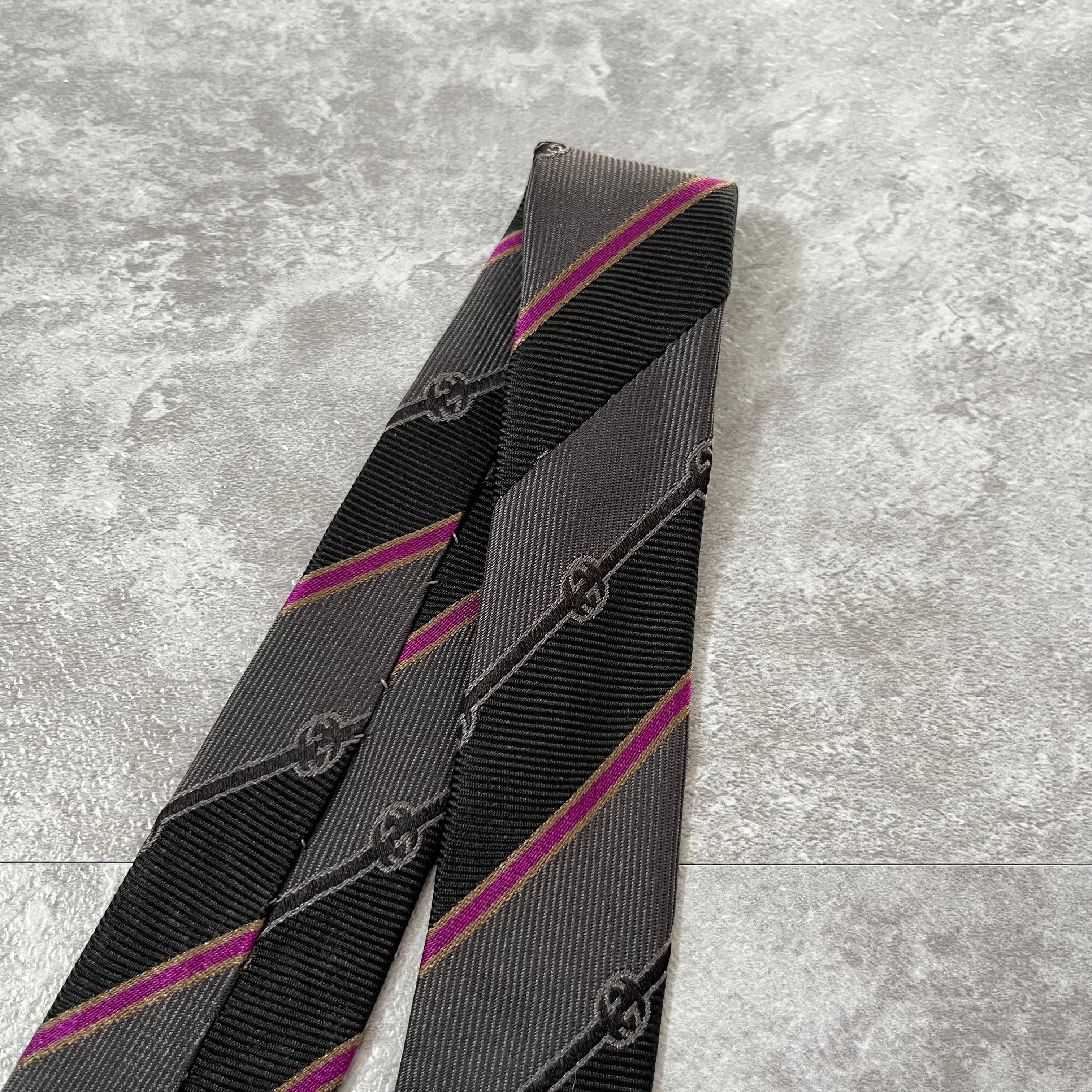 【GUCCI】ストライプ柄ネクタイ グレー×ブラック×ピンク ロゴ入り GG