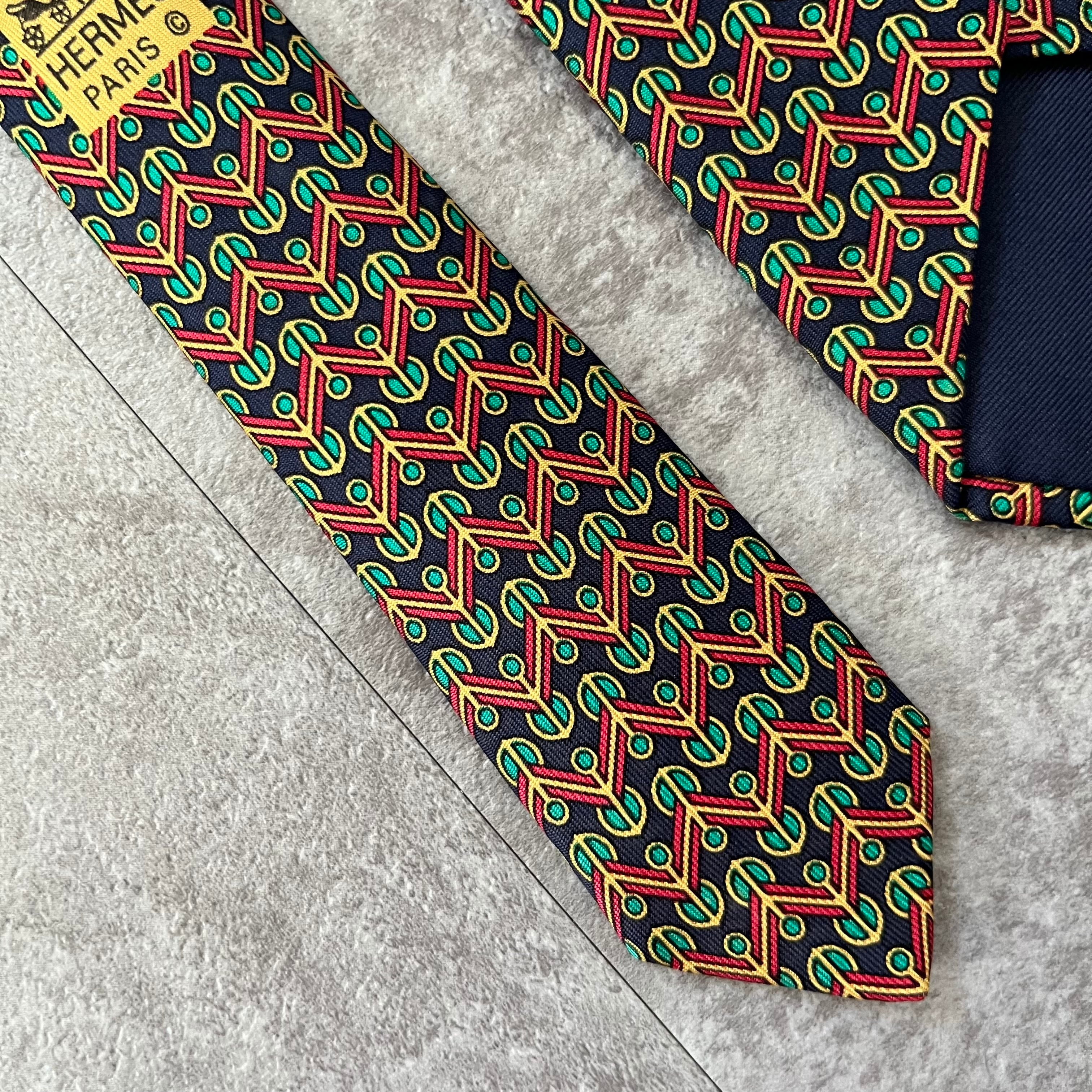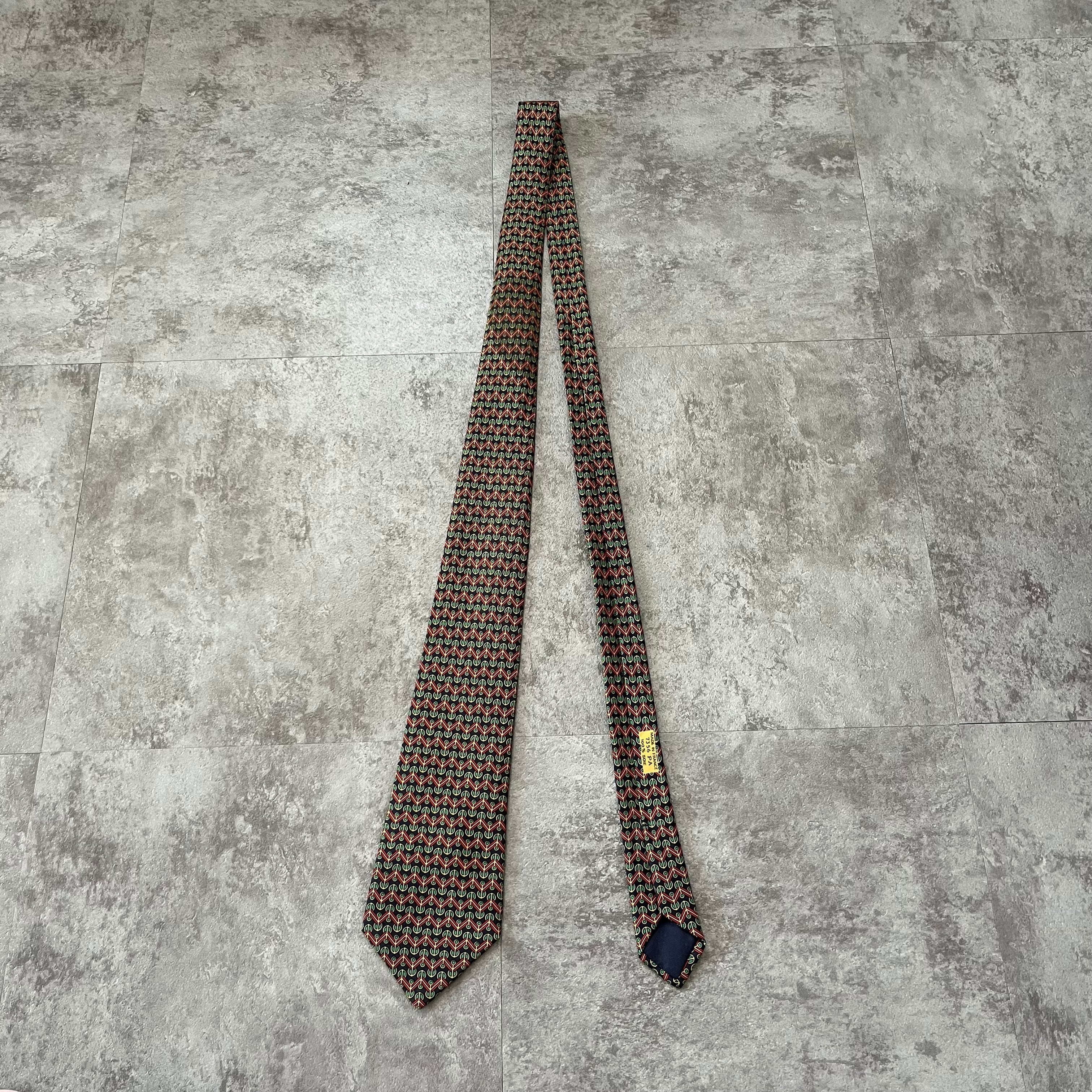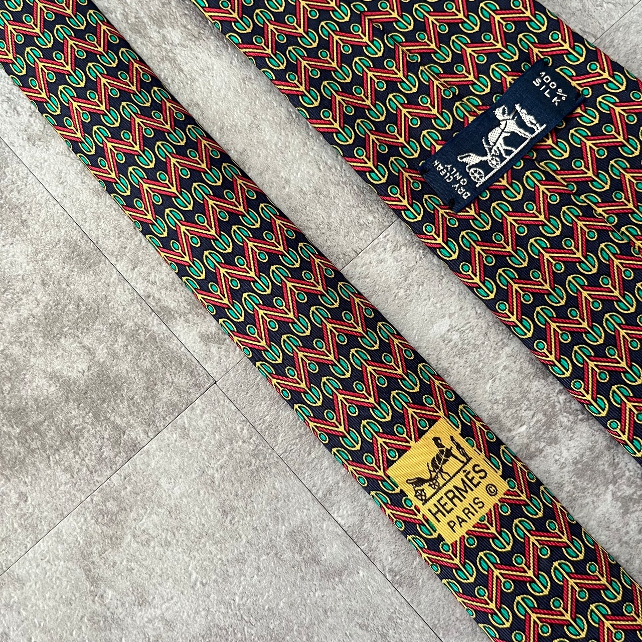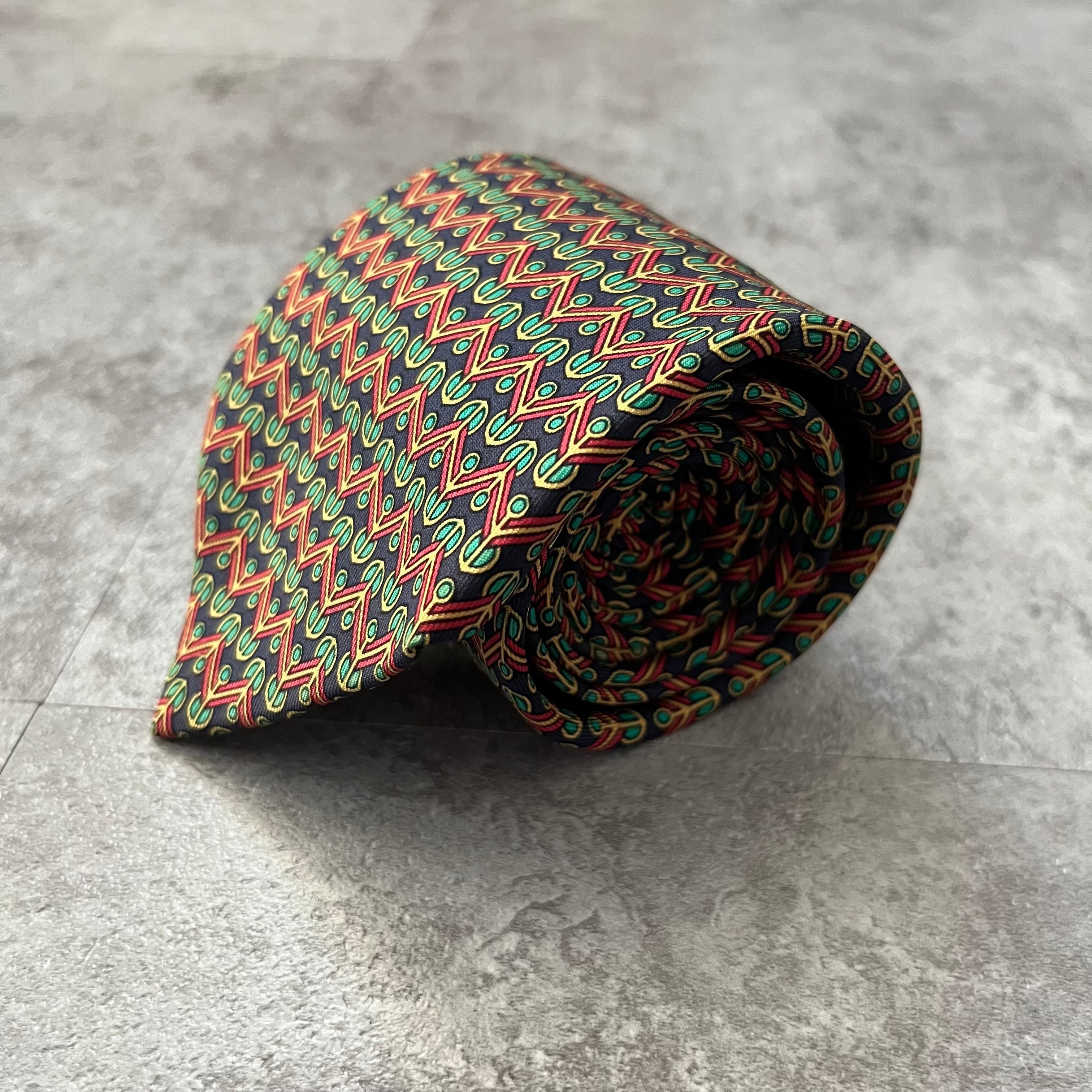 【HERMES】マルチカラーパターンネクタイ ネイビー グリーン レッド イエロー
