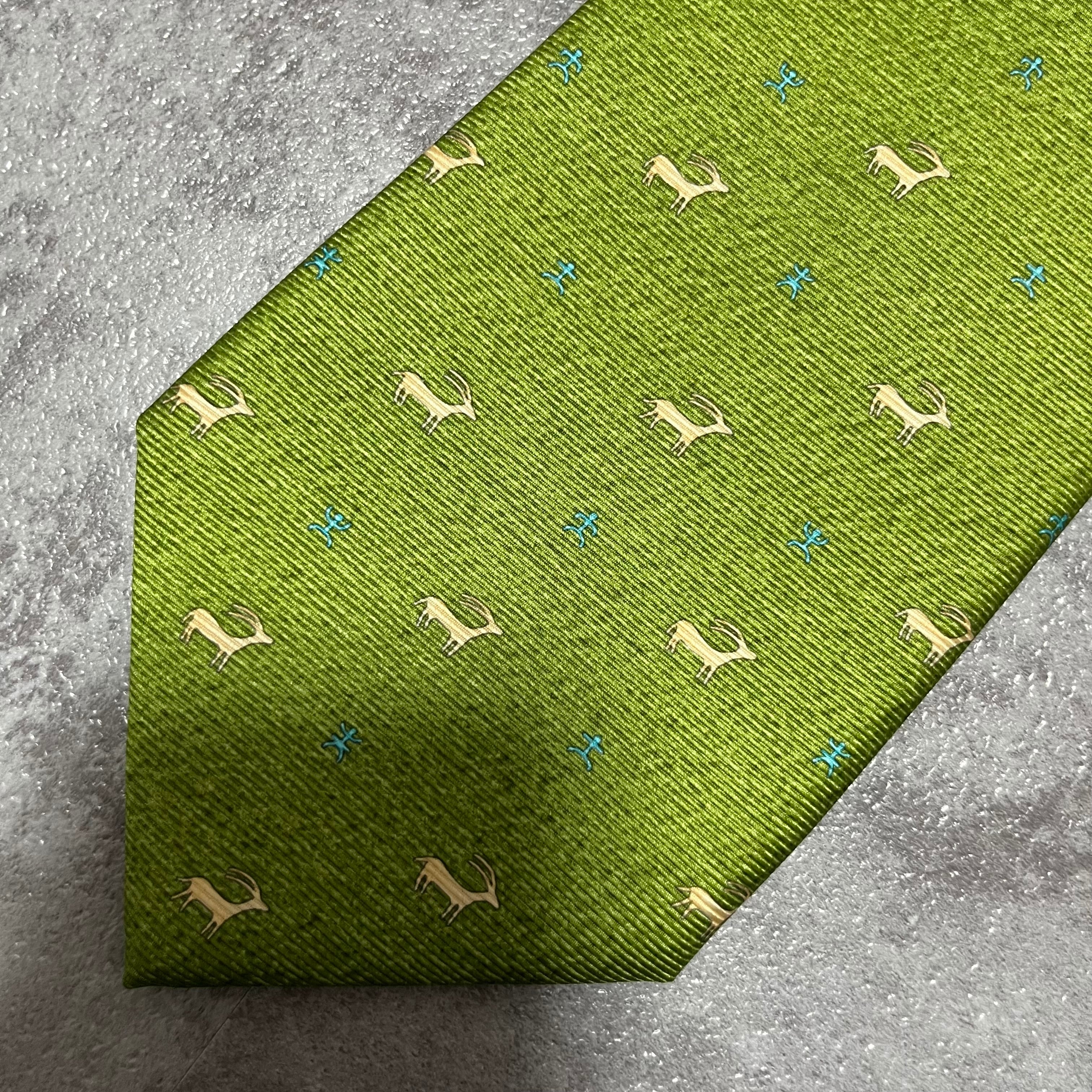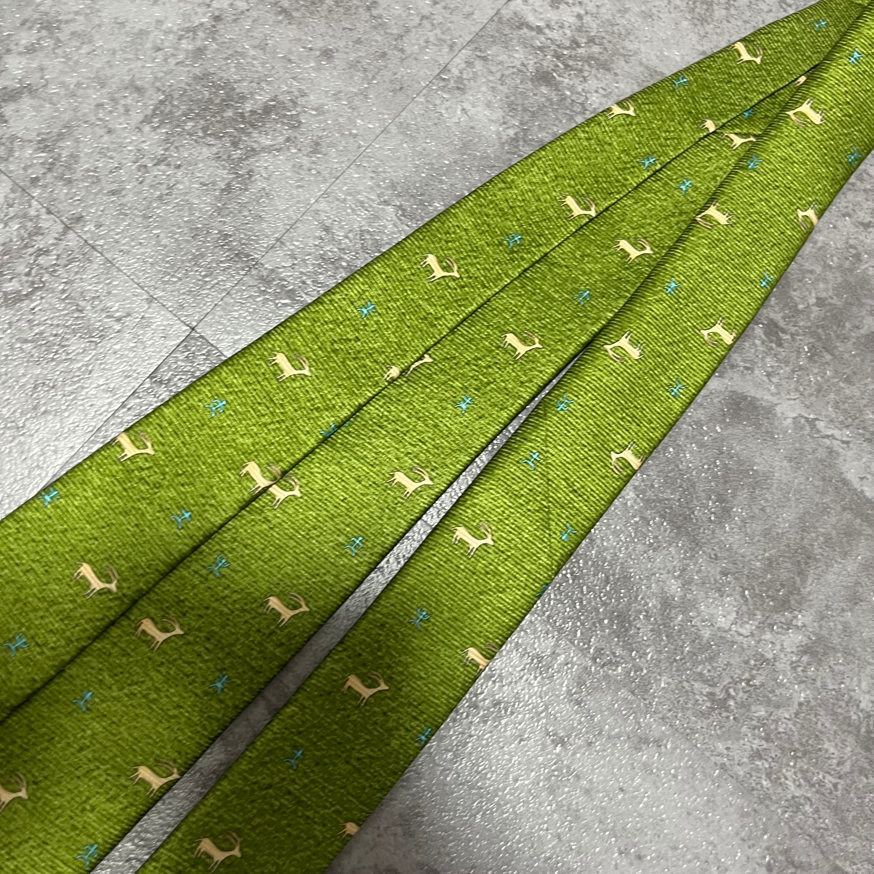 【BVLGARI】アニマル柄ネクタイ グリーン 鹿柄 鹿と人 最高級 セッテピエゲ