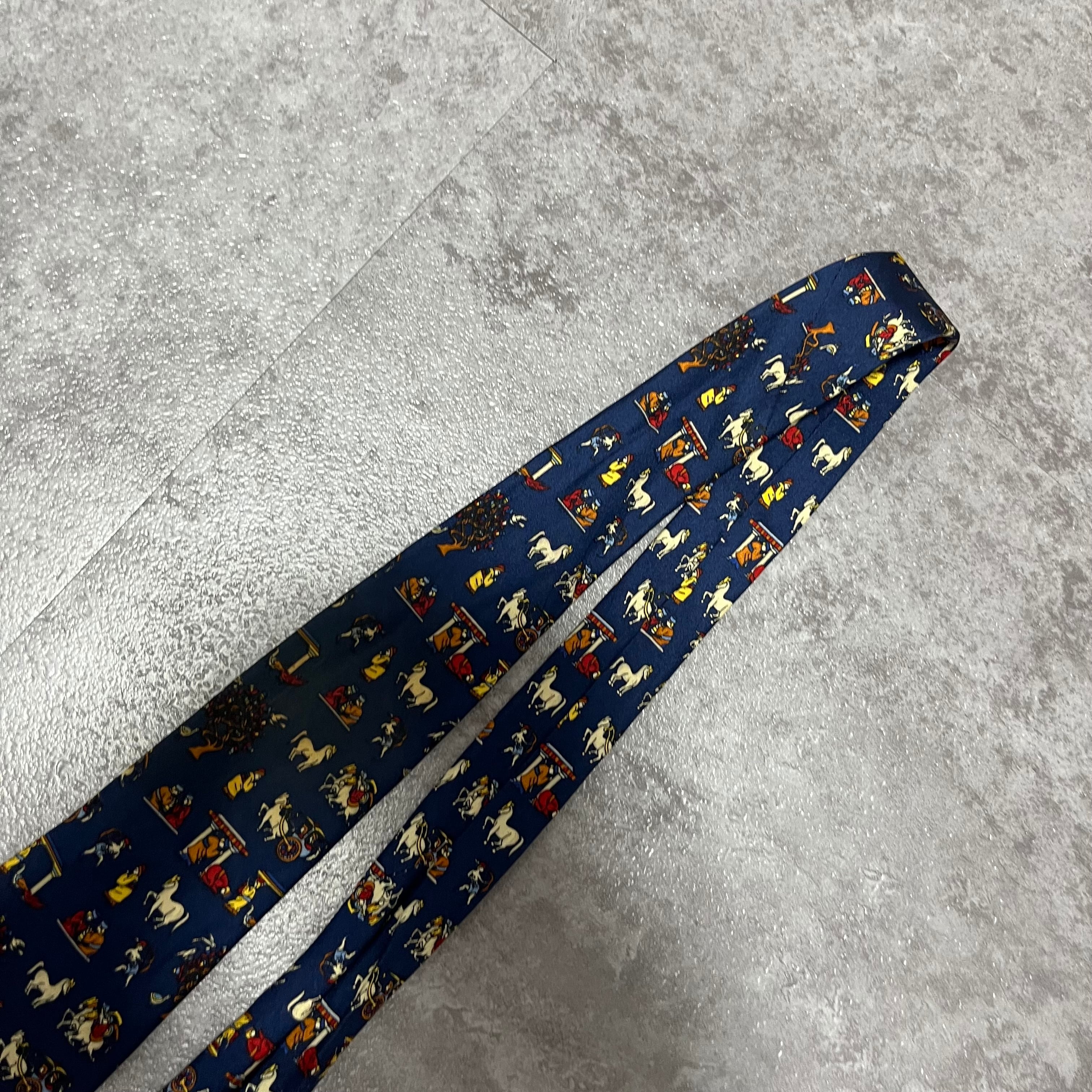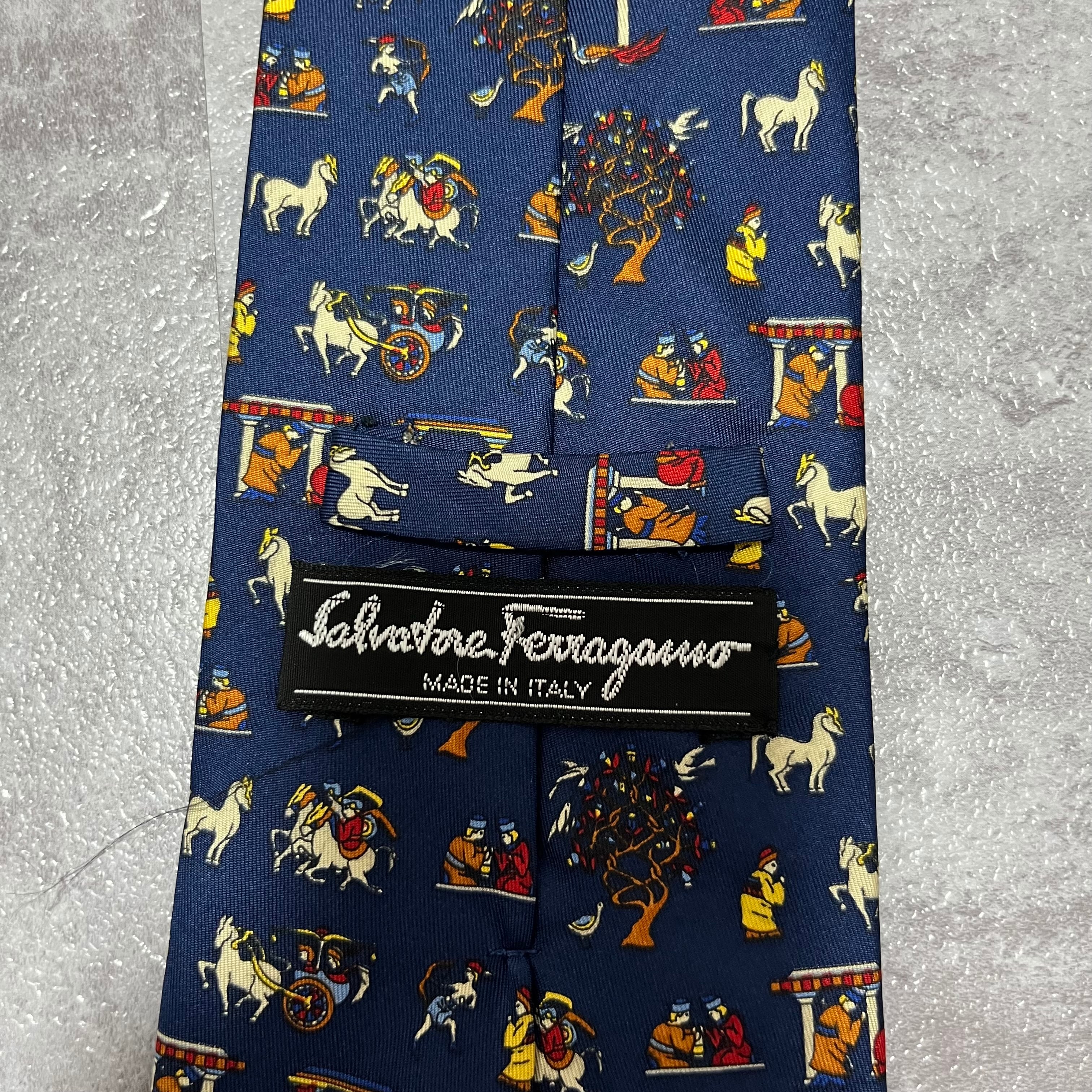 【Salvatore Ferragamo】アニマル柄ネクタイ 馬と人 馬車 参拝する人 ネイビー