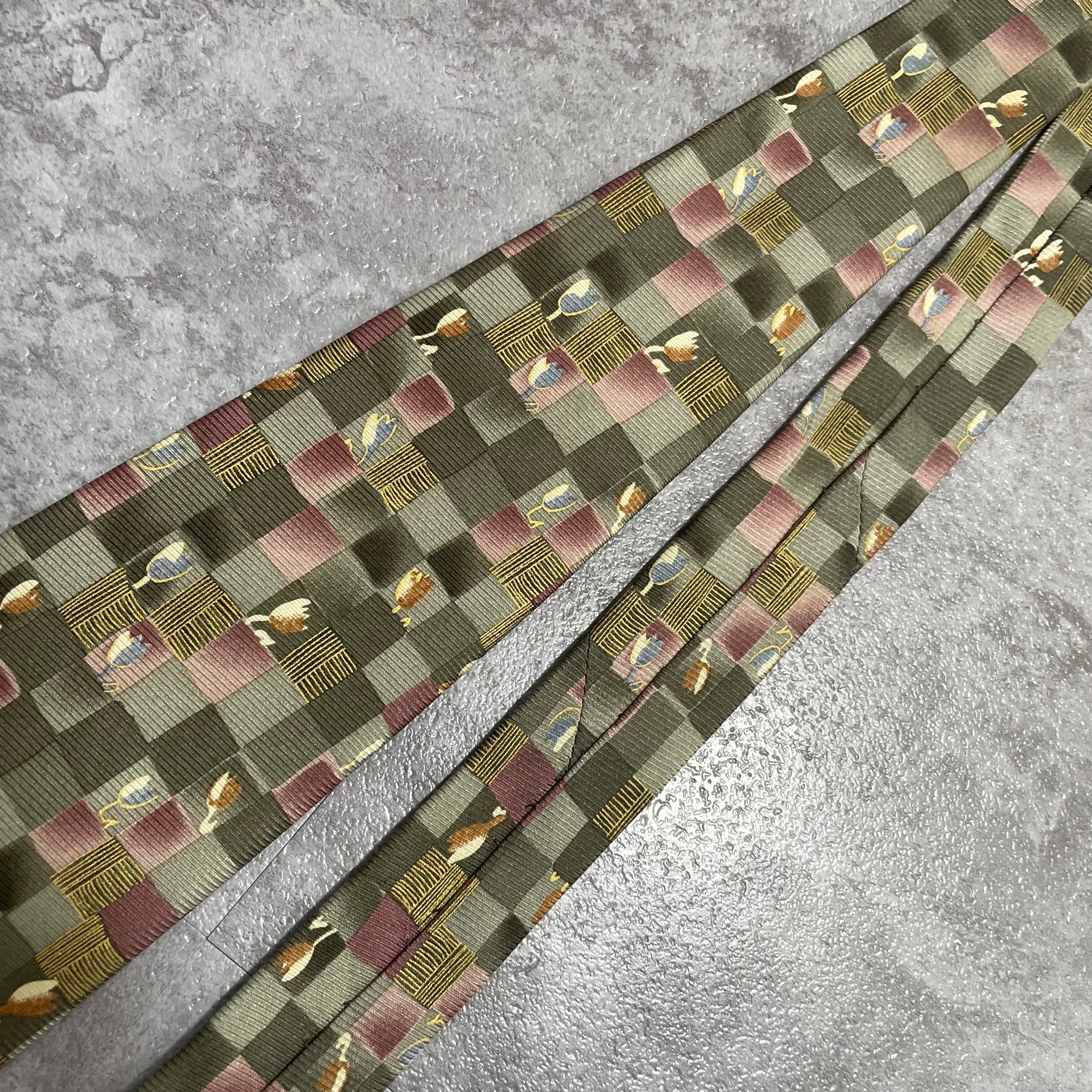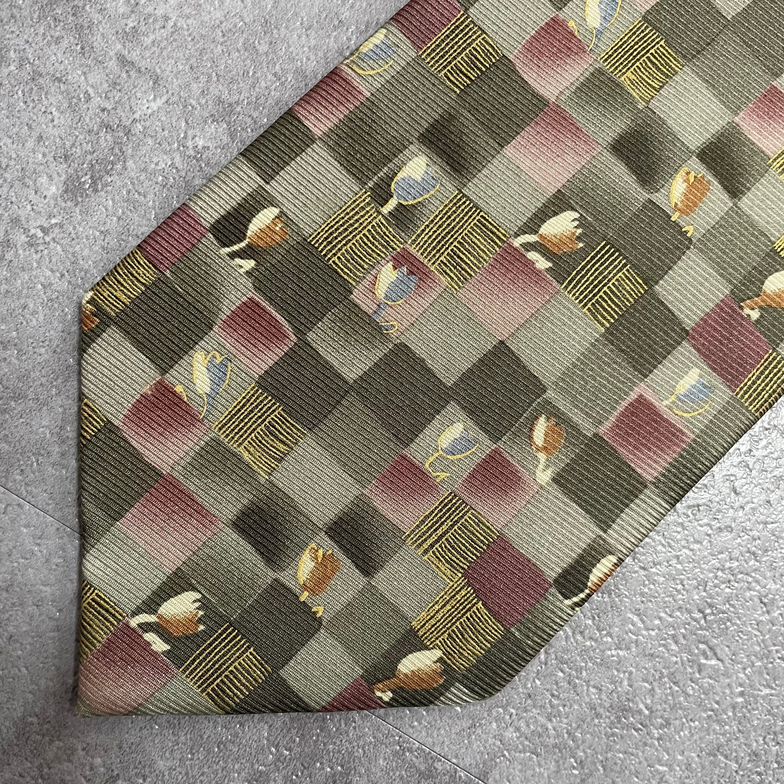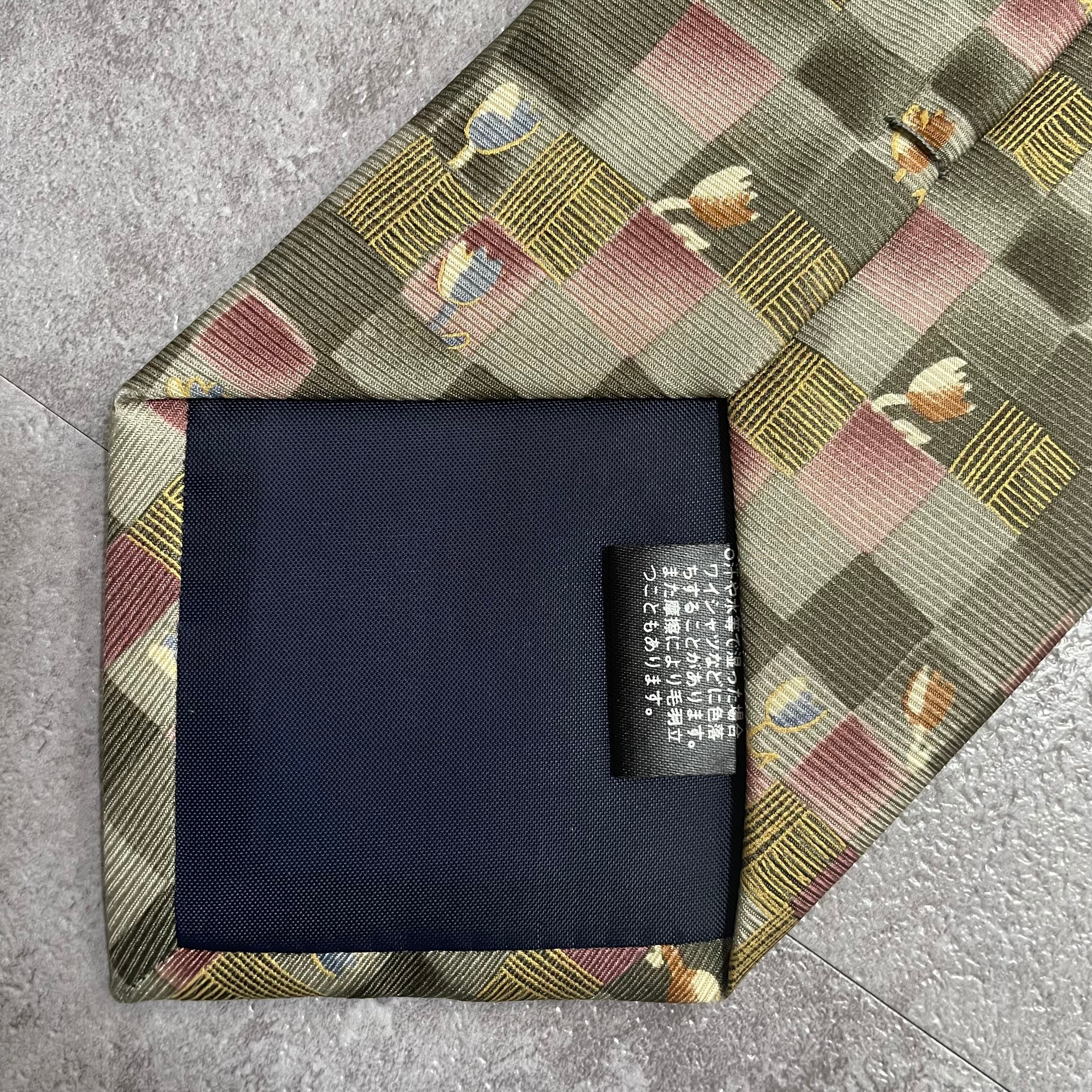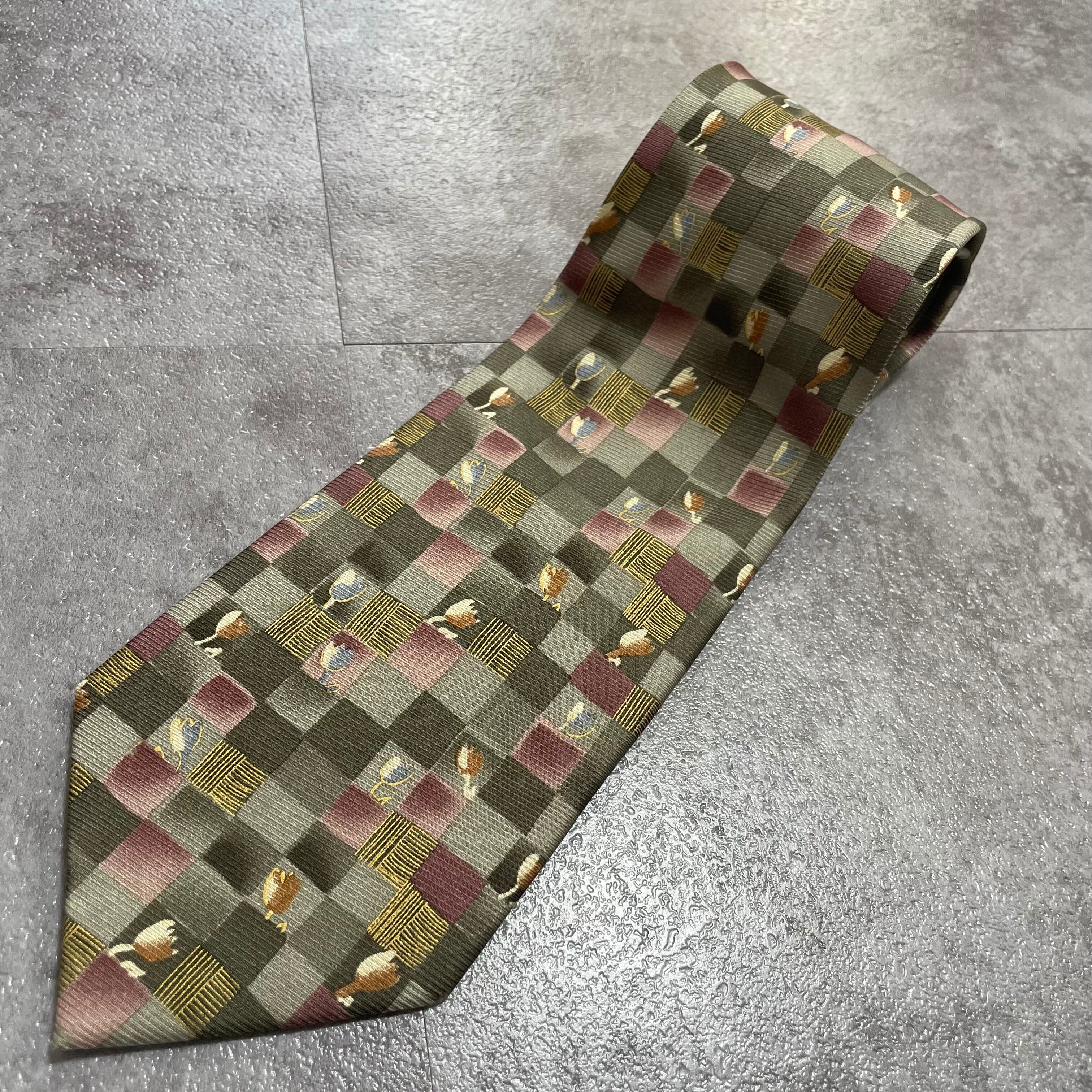 【花柄】ブロックチェック花柄ネクタイ グリーン チューリップ ピンク 植物柄 ボタニカル