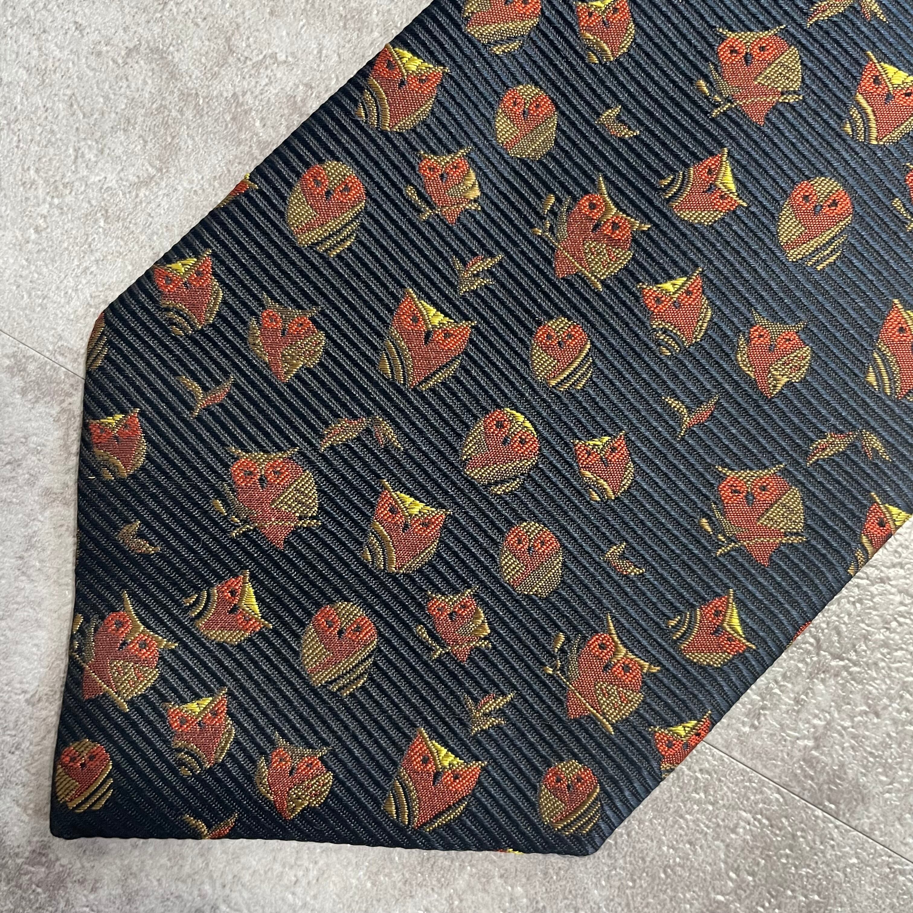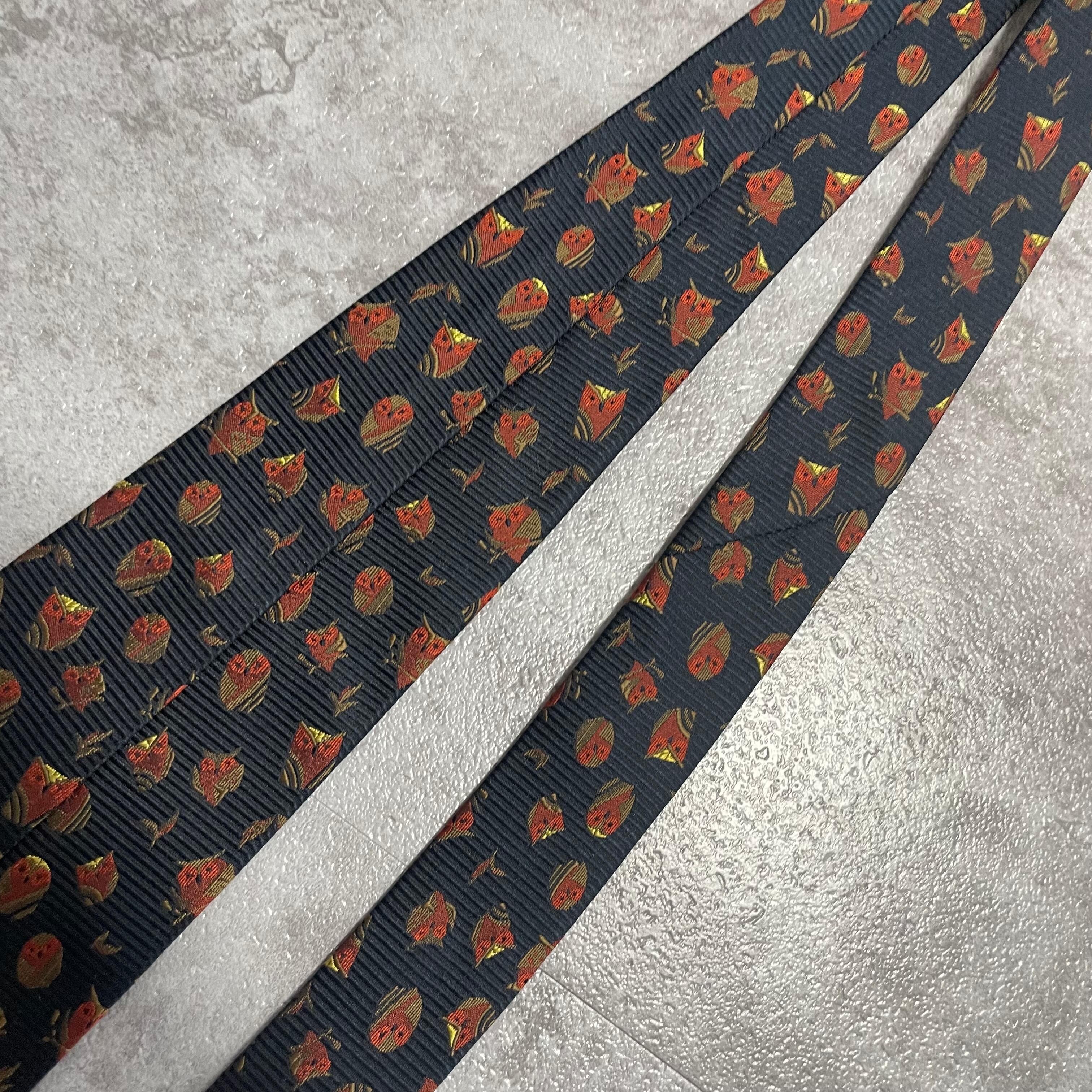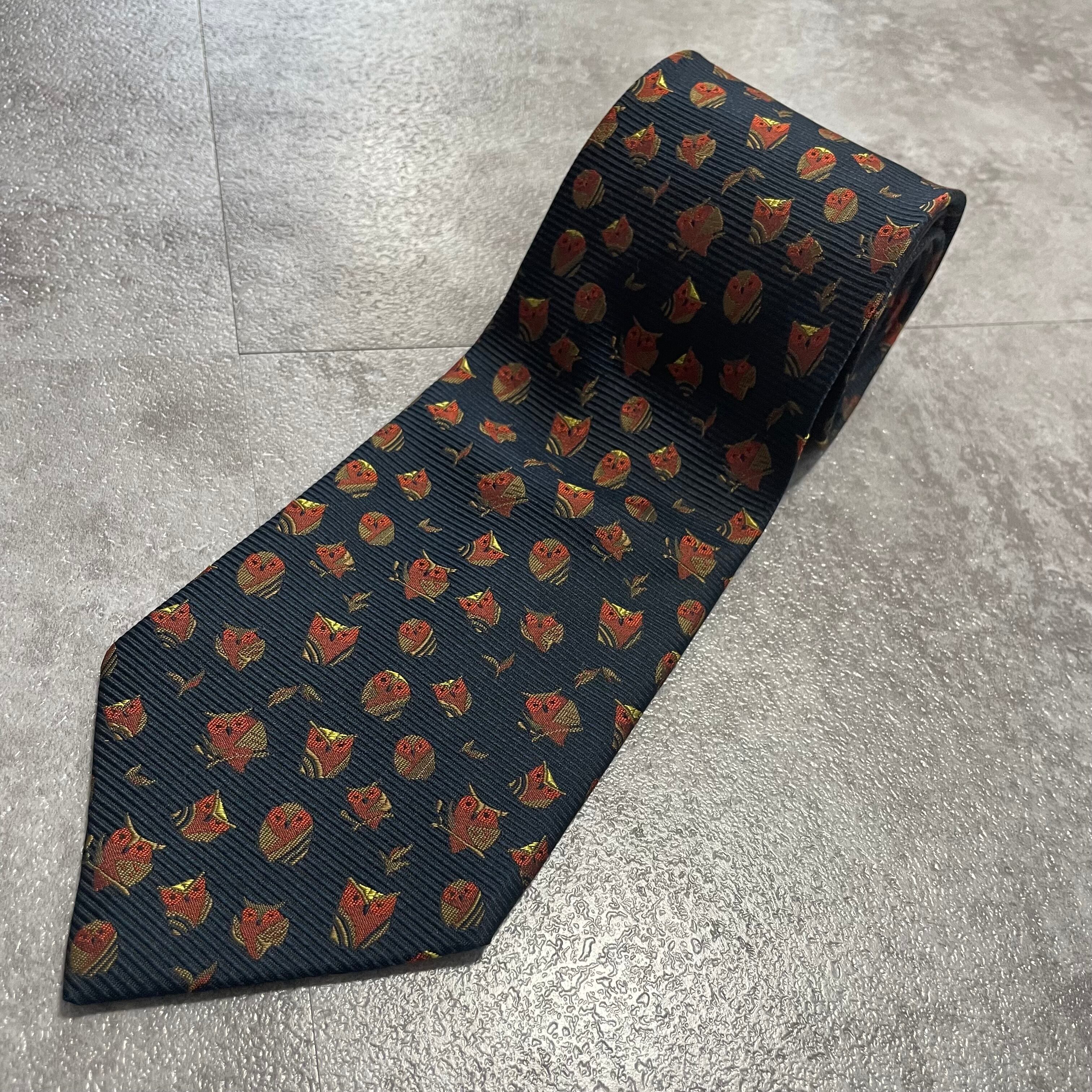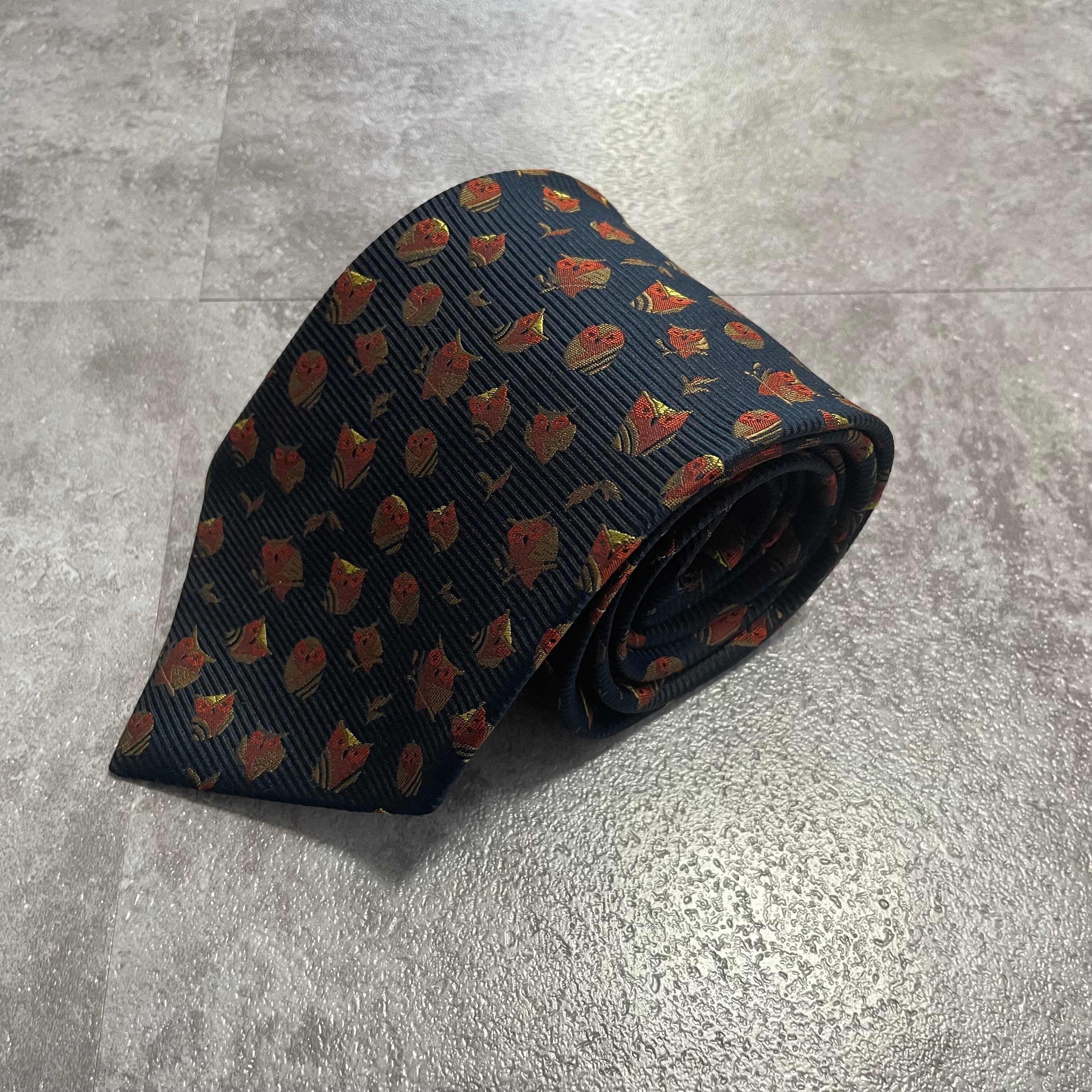 【アニマル柄】リーフモチーフ×フクロウネクタイ ネイビー ミミズク 猛禽 落ち葉 紅葉