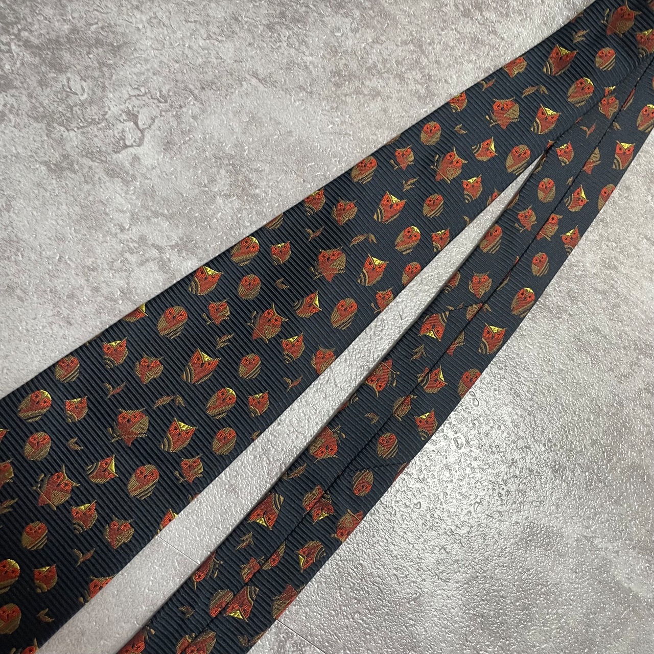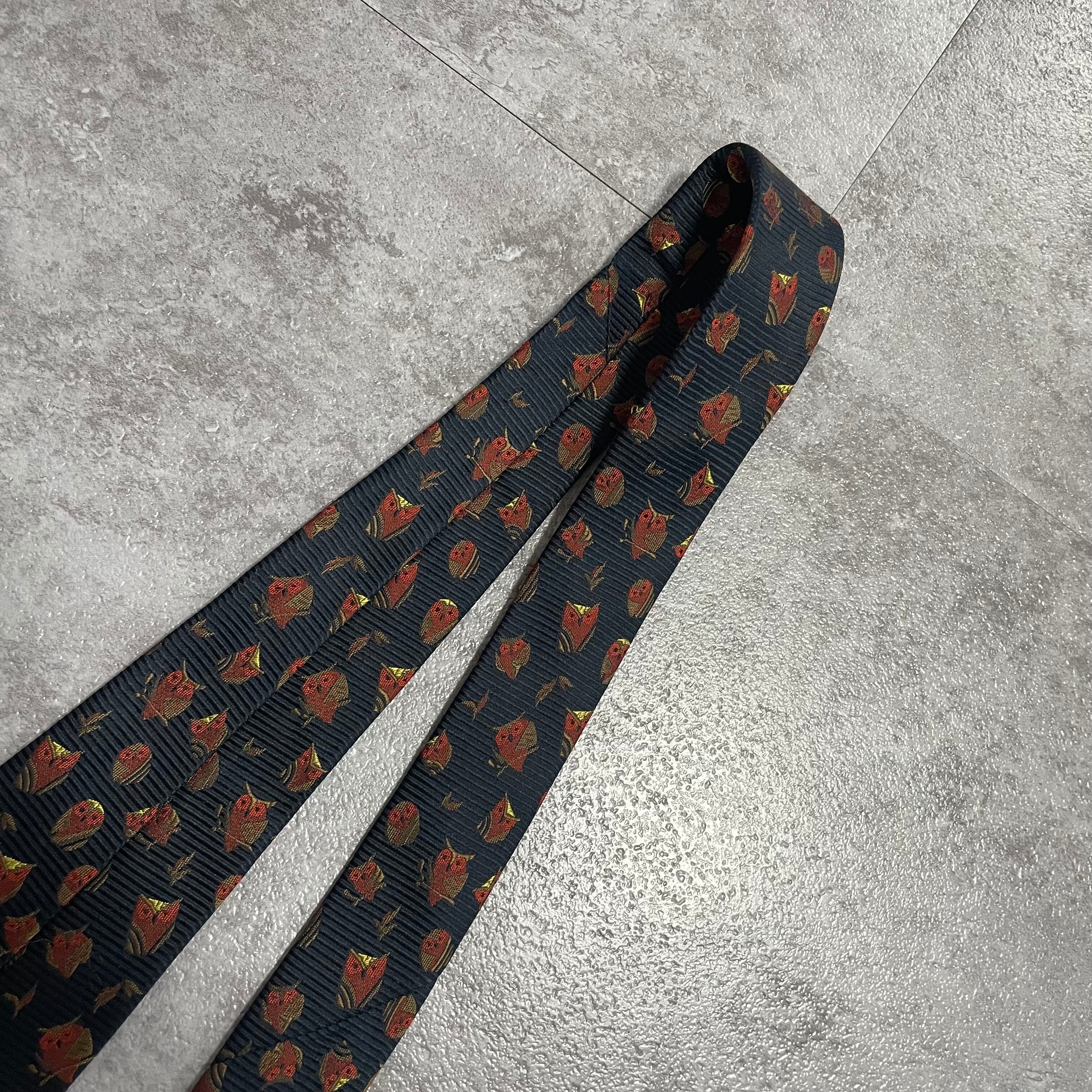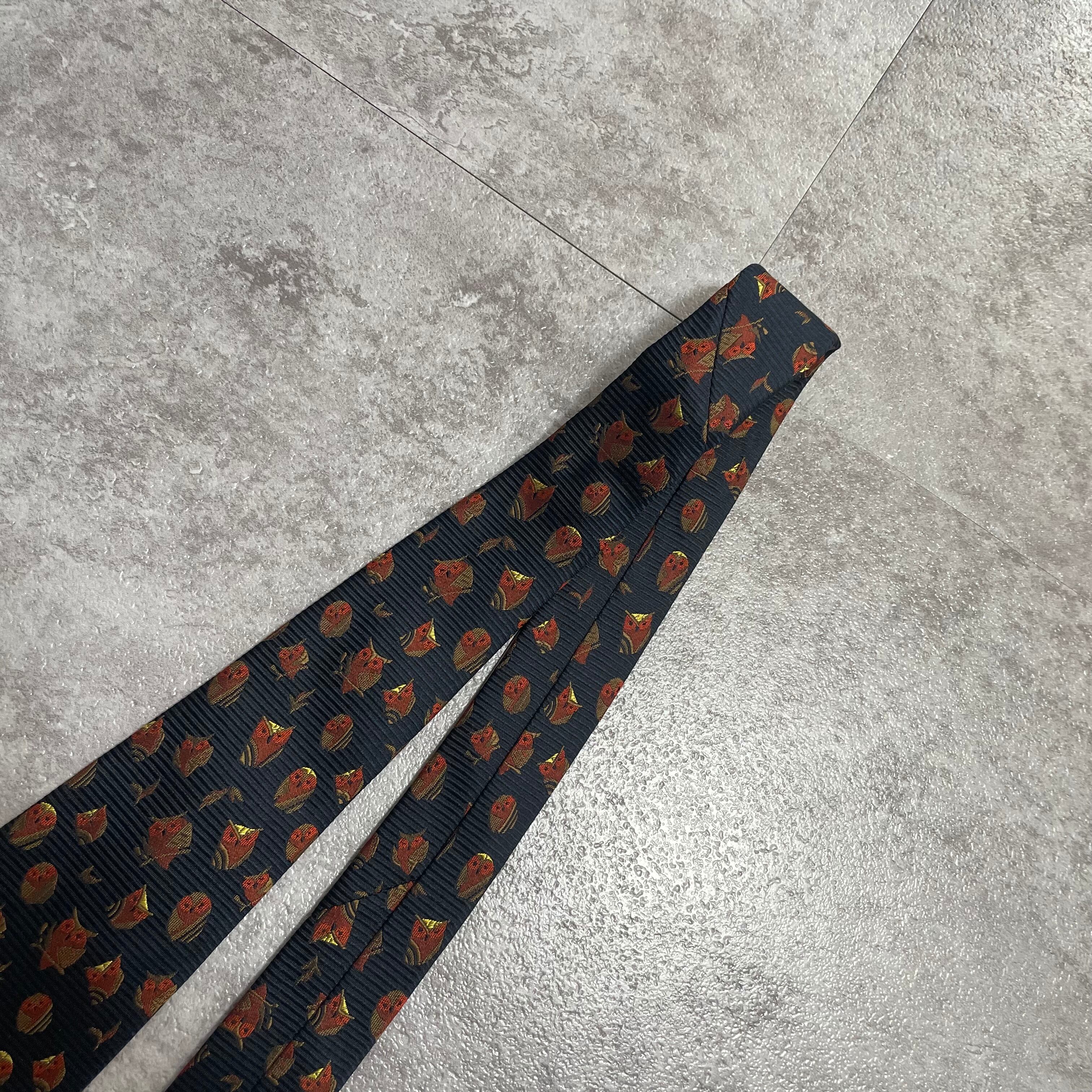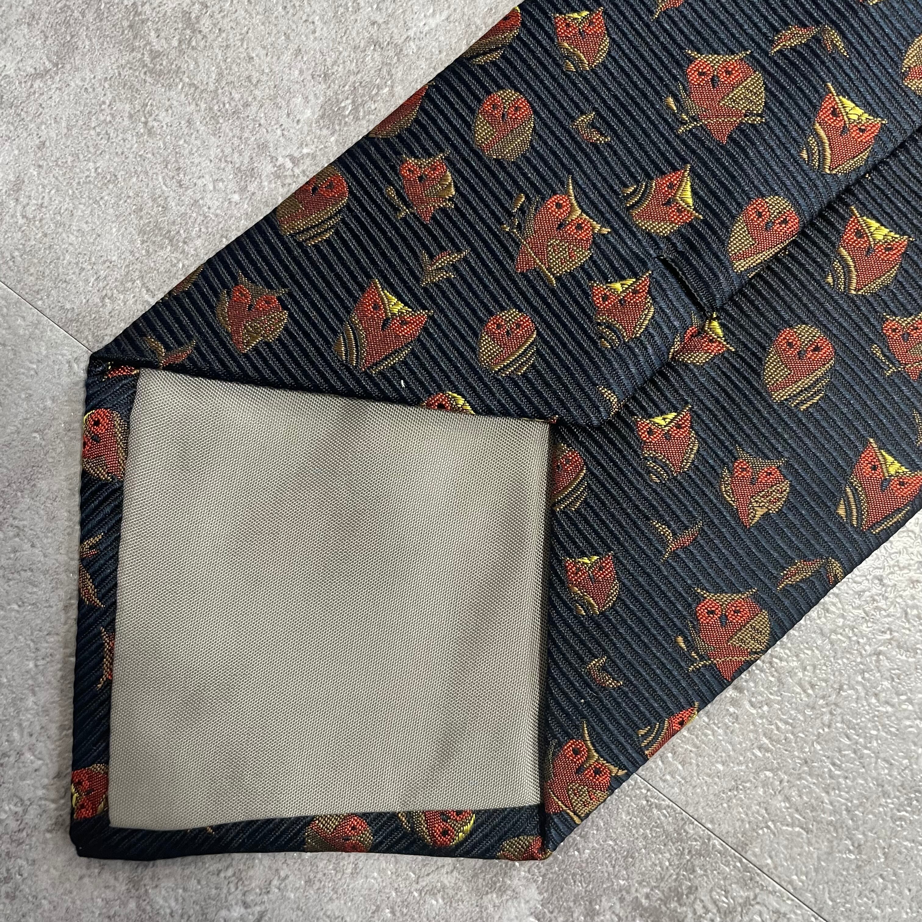 【アニマル柄】リーフモチーフ×フクロウネクタイ ネイビー ミミズク 猛禽 落ち葉 紅葉