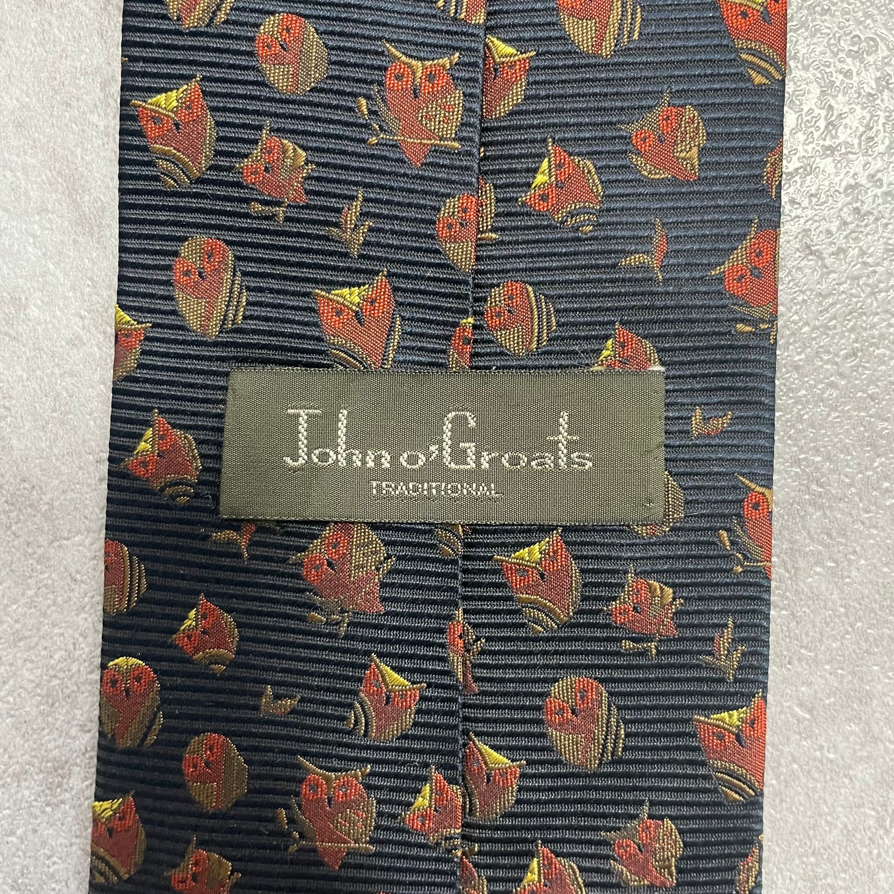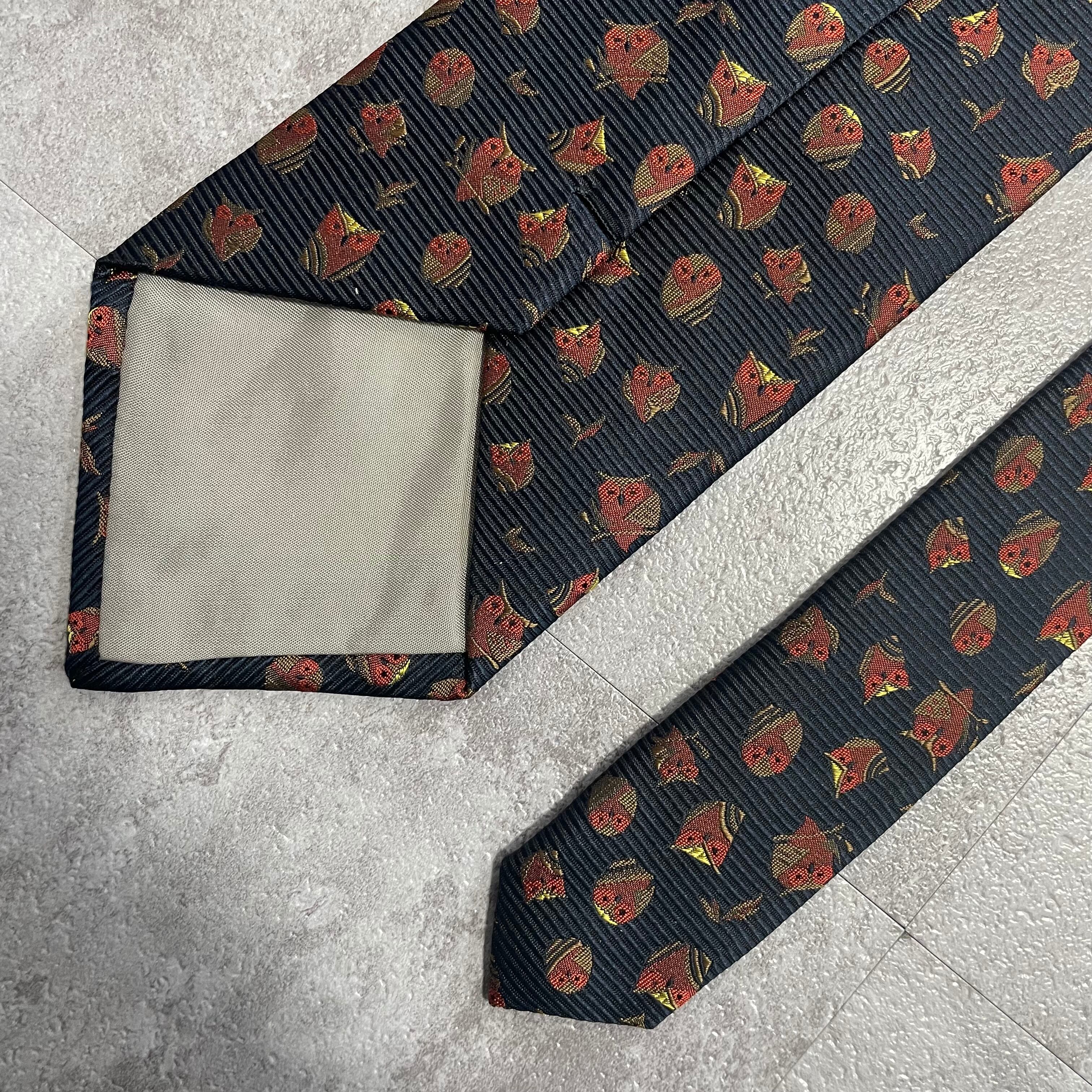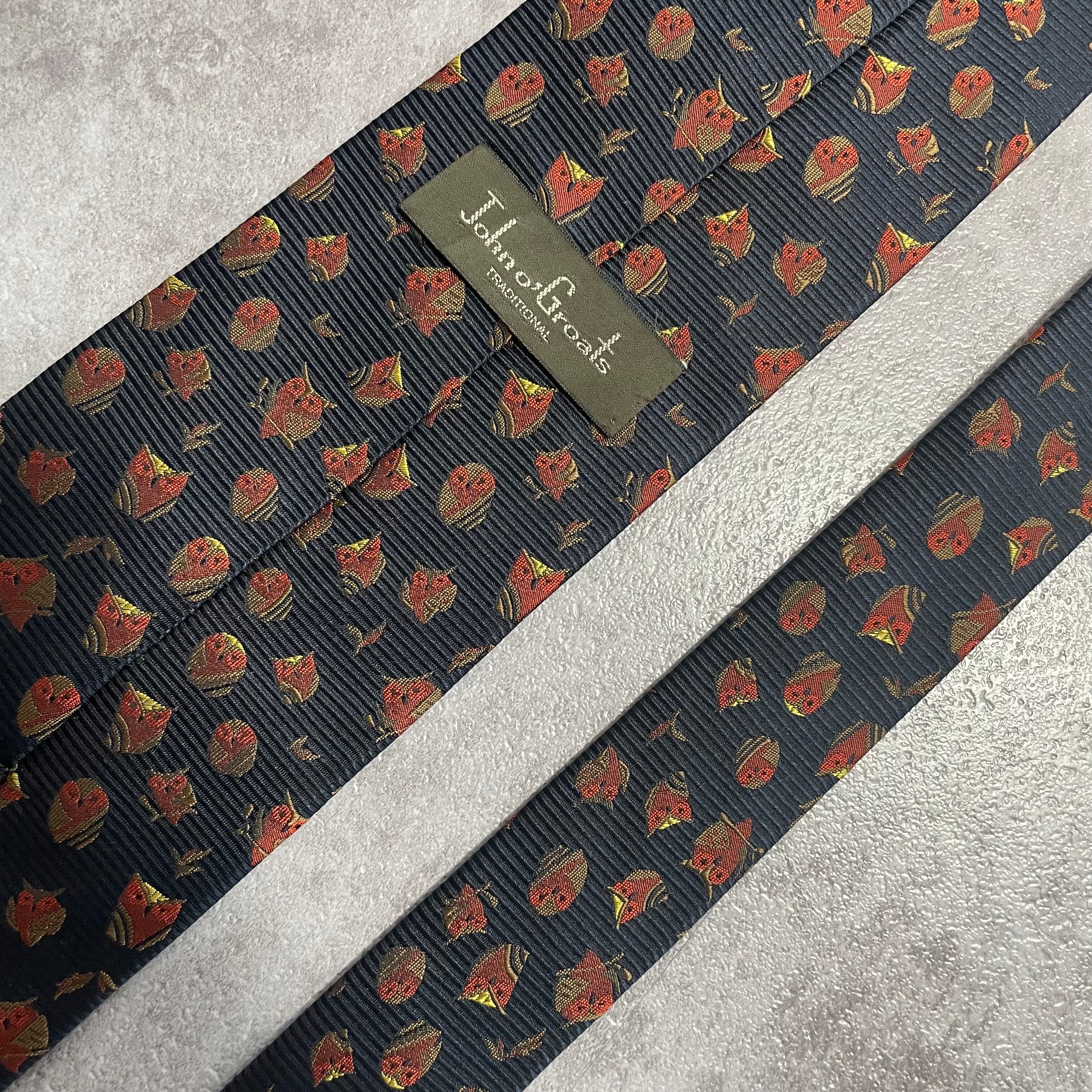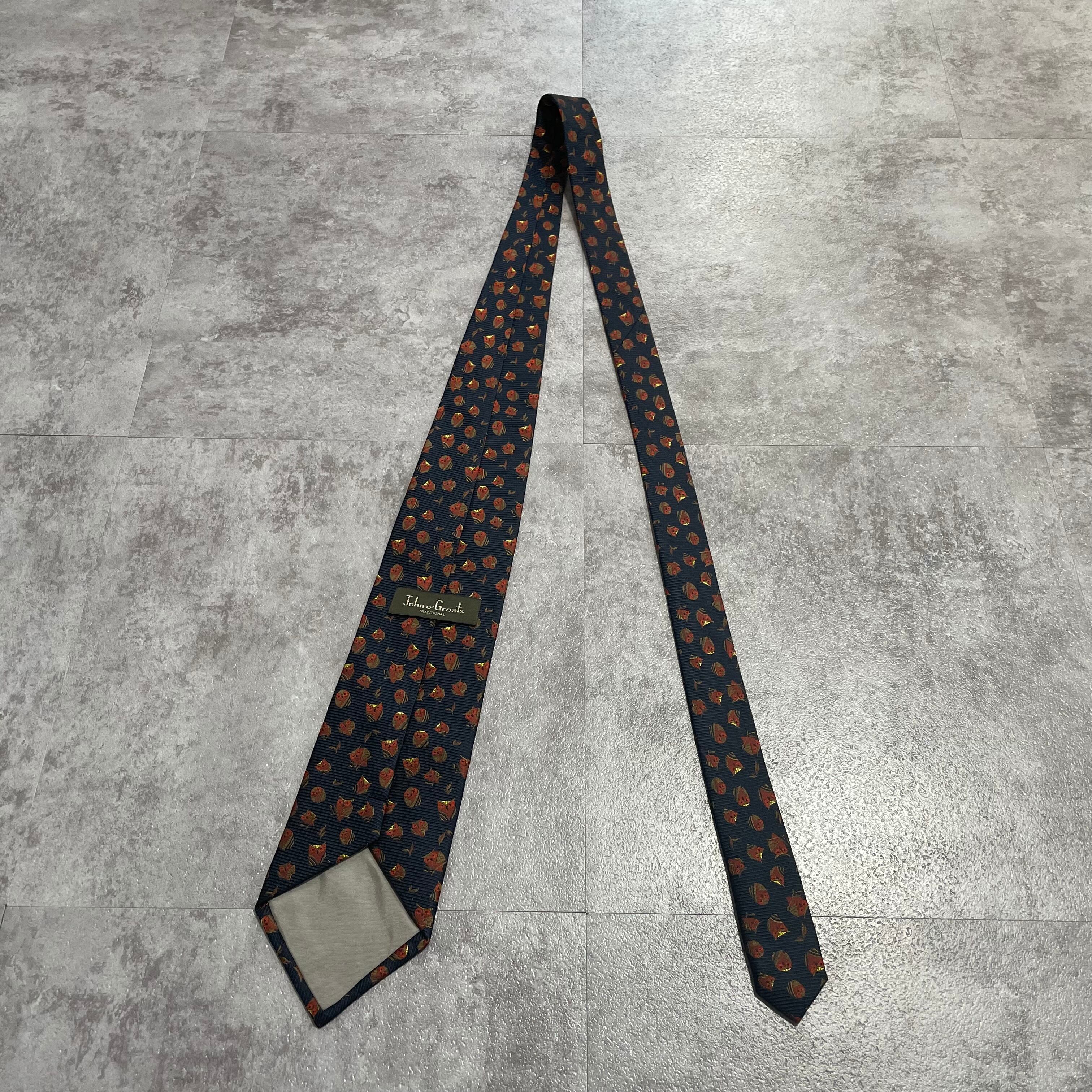 【アニマル柄】リーフモチーフ×フクロウネクタイ ネイビー ミミズク 猛禽 落ち葉 紅葉
