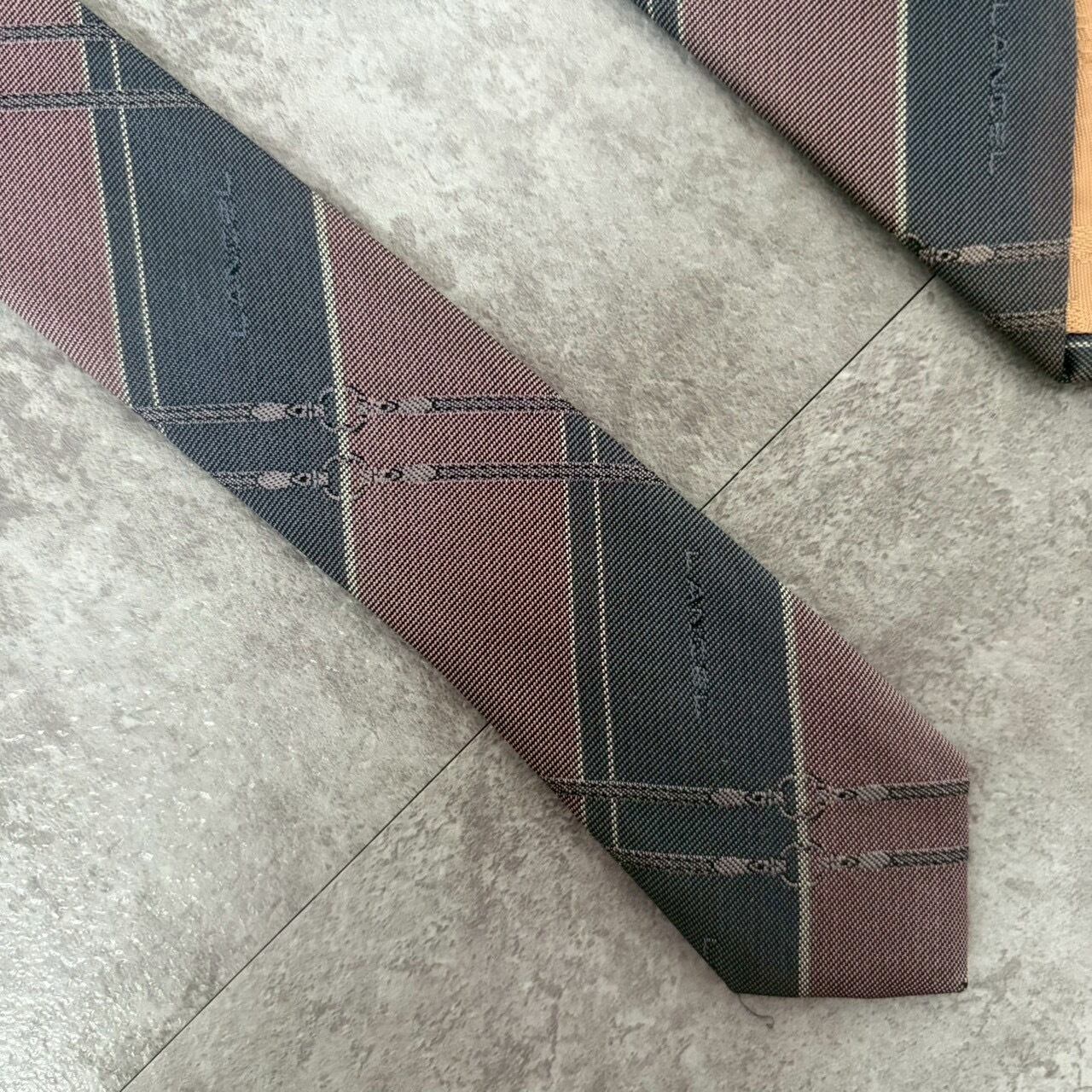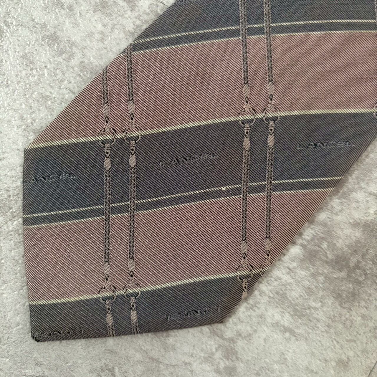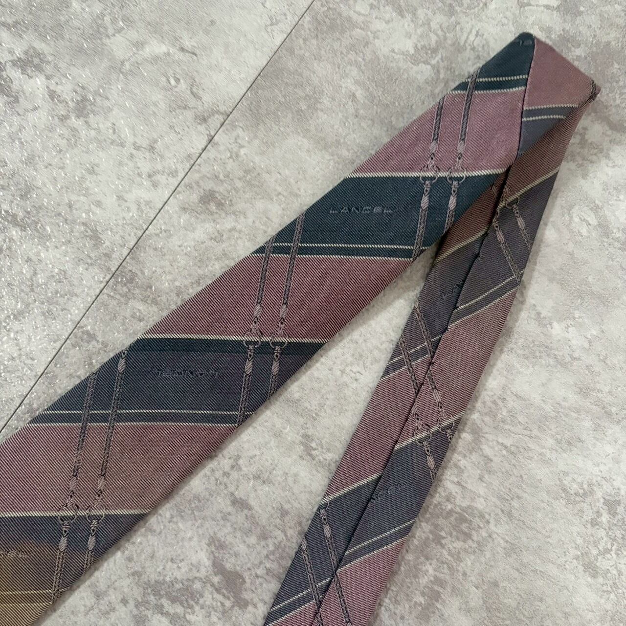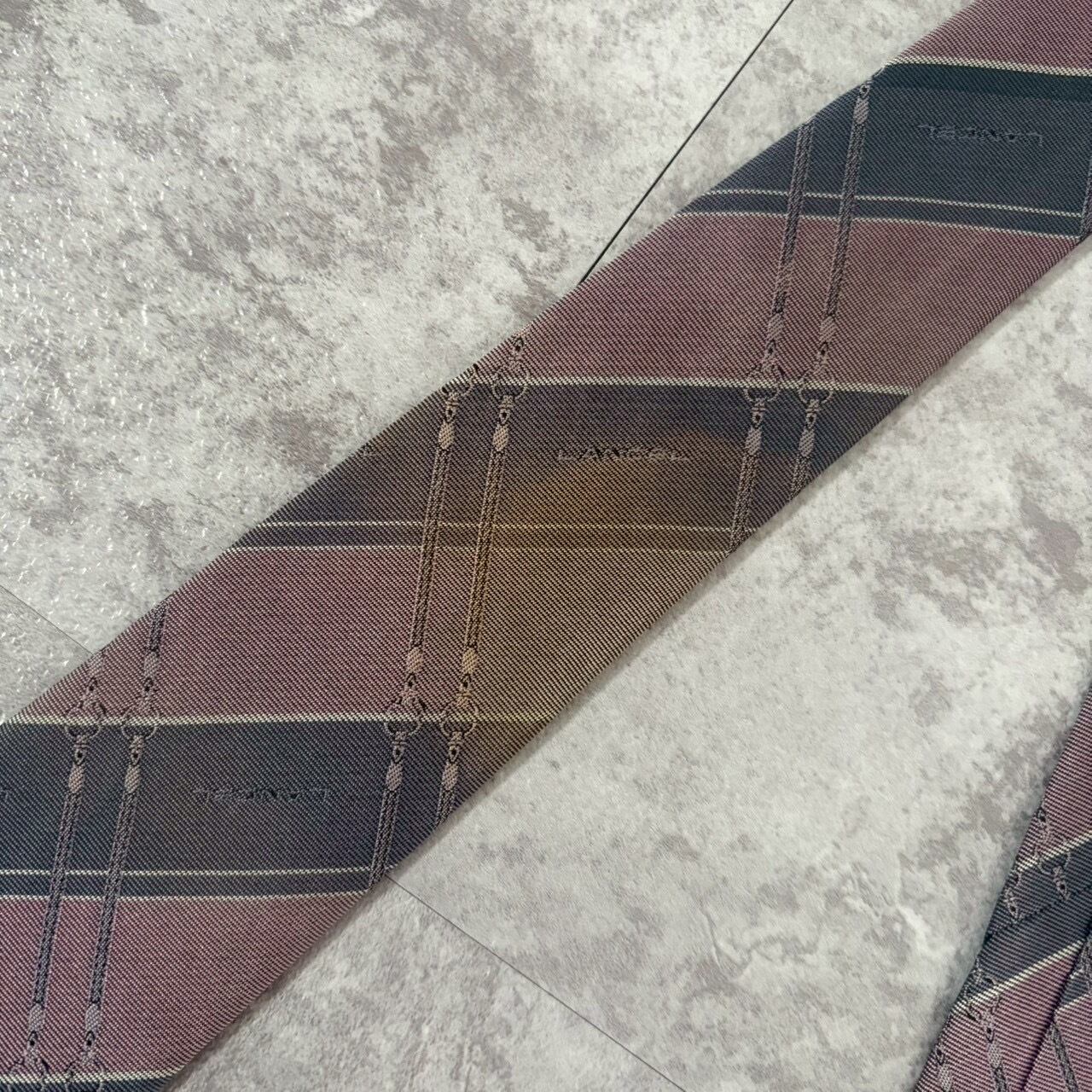 【LANCEL】バイカラーストライプネクタイ グレー ピンク シャドウロゴ チェーン柄