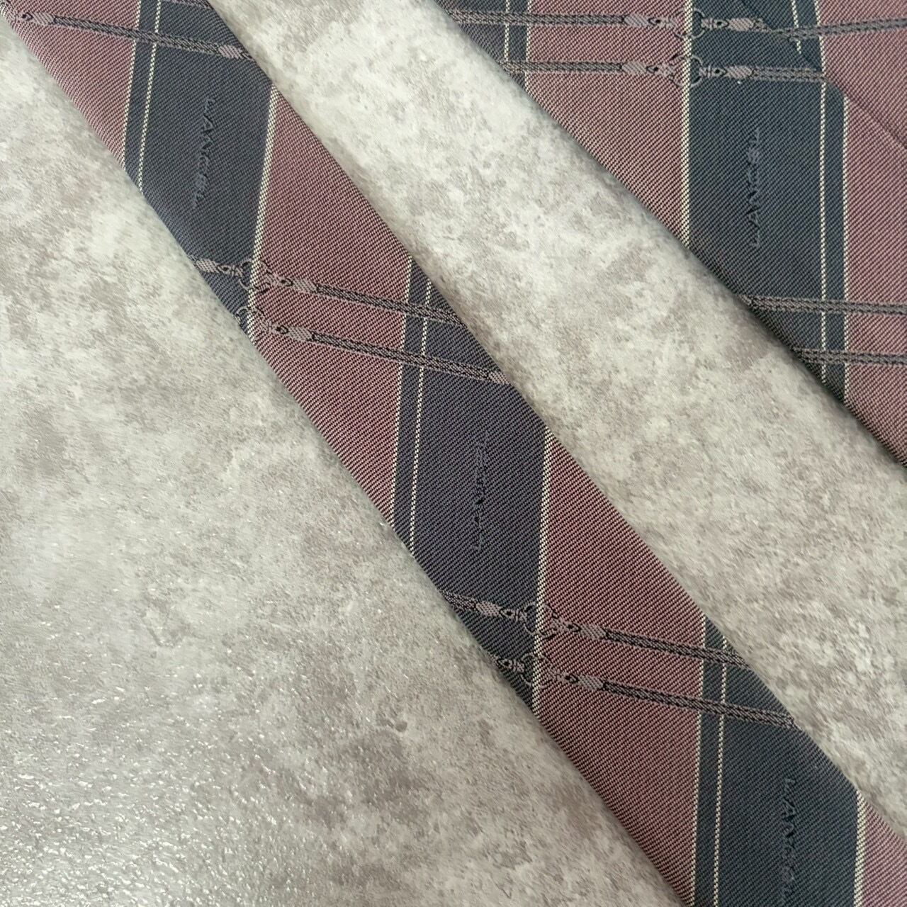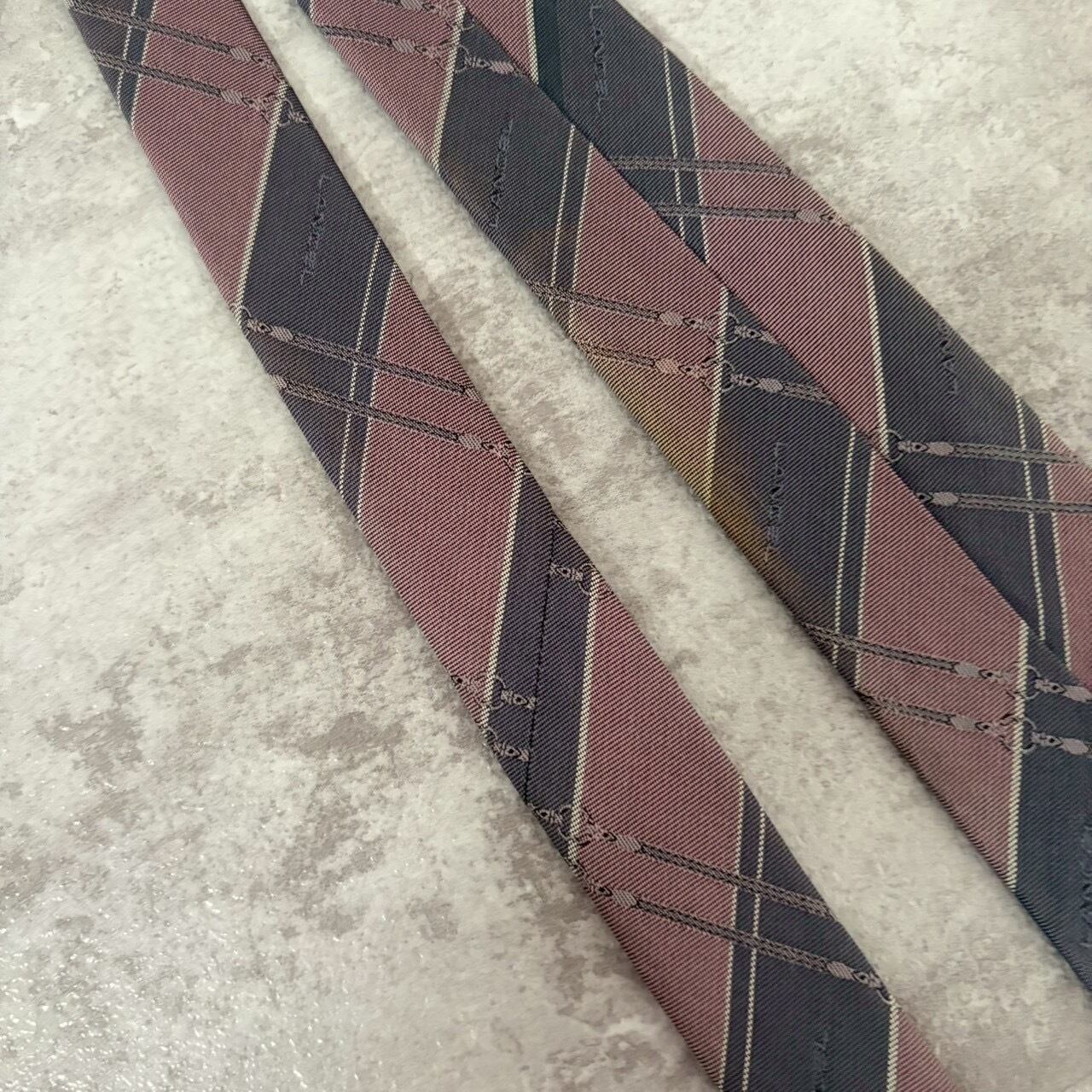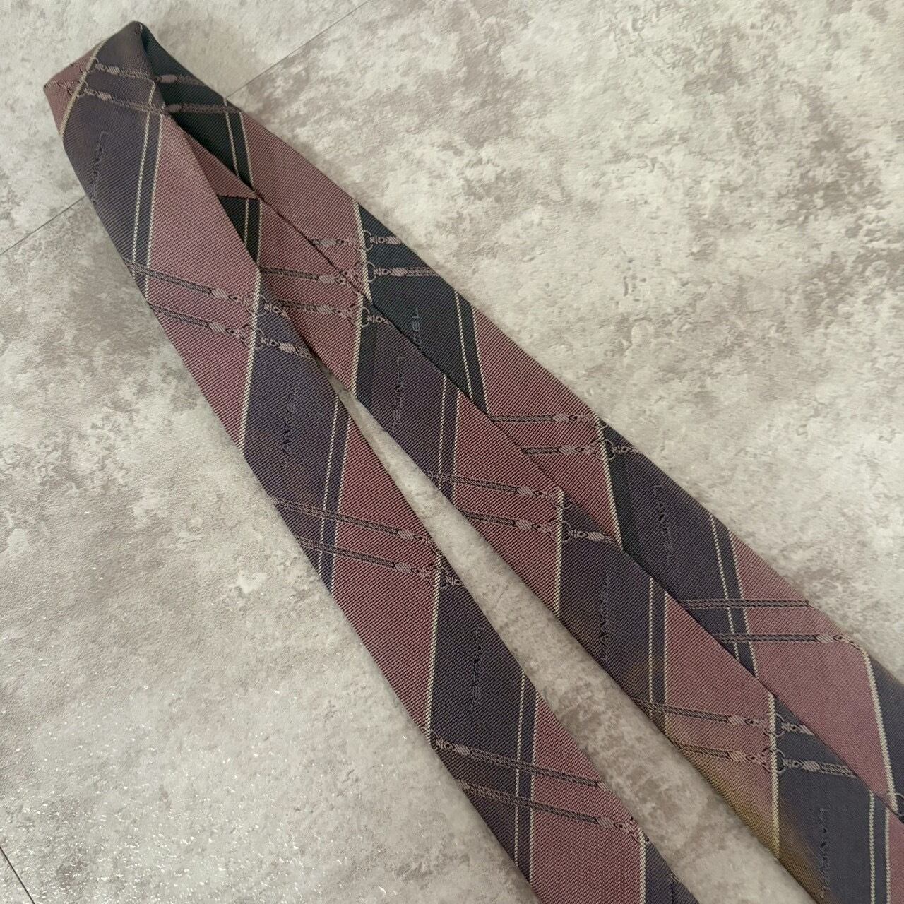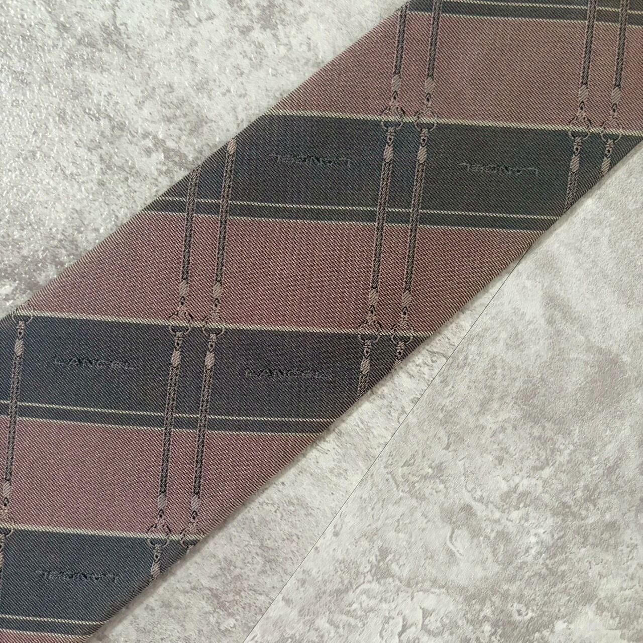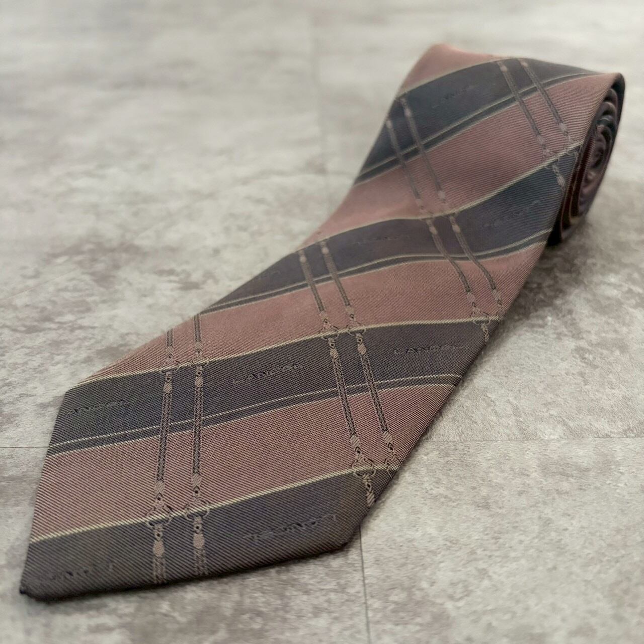 【LANCEL】バイカラーストライプネクタイ グレー ピンク シャドウロゴ チェーン柄