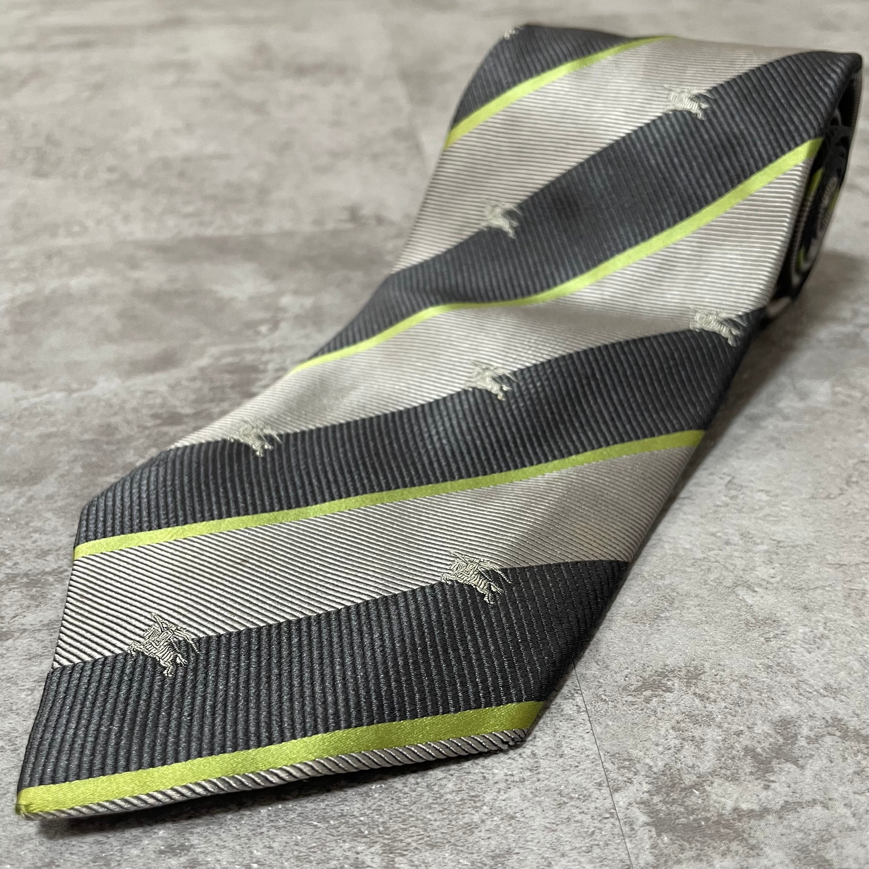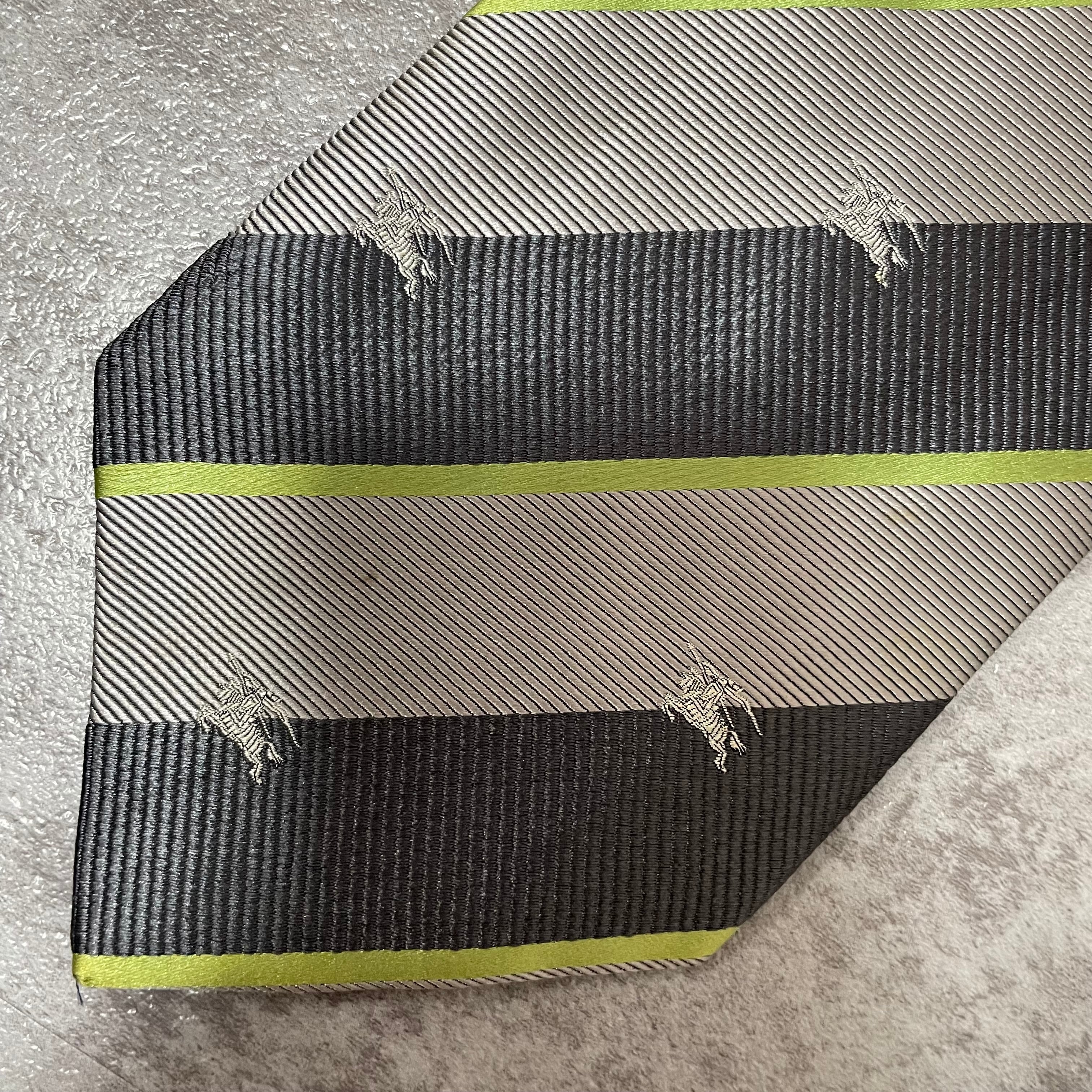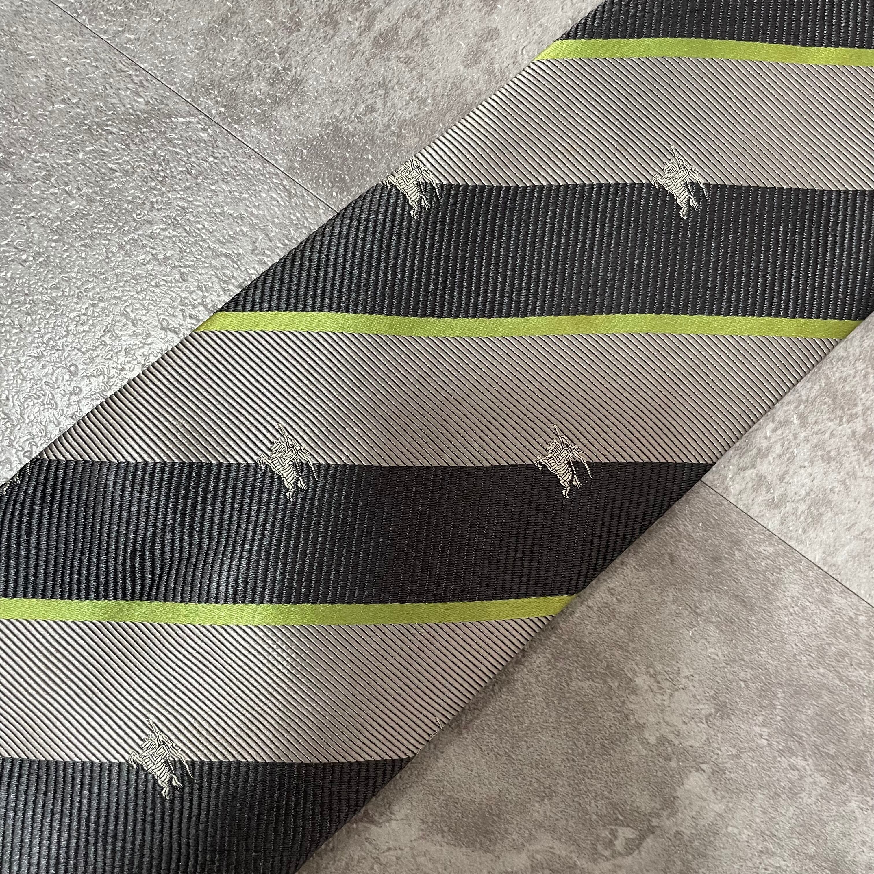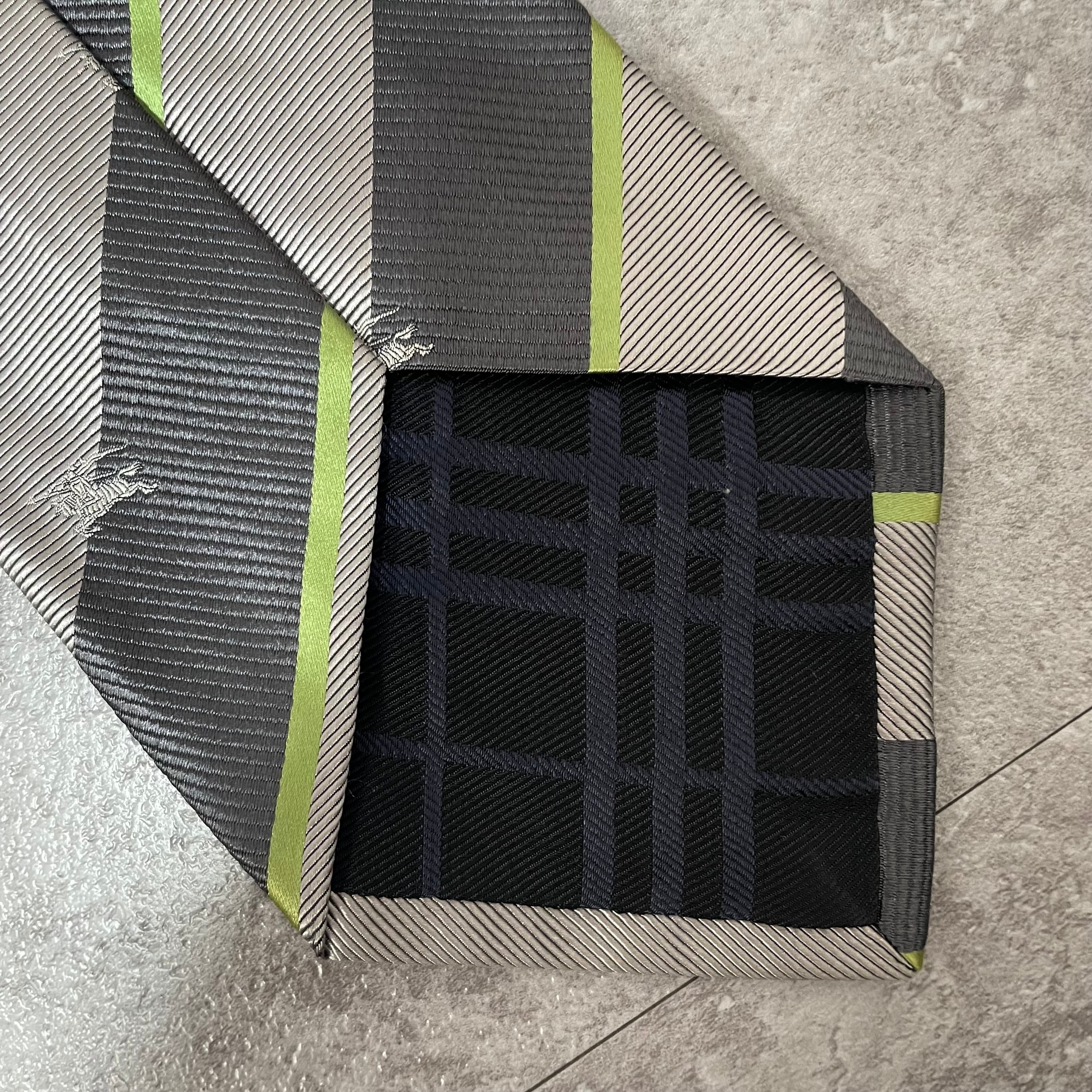 【Burberry】レジメンタルストライプネクタイ ビジネス向け バイカラー グレー 灰色 シルバー 銀色 グリーン 緑 バーバリー ホースロゴ入り
