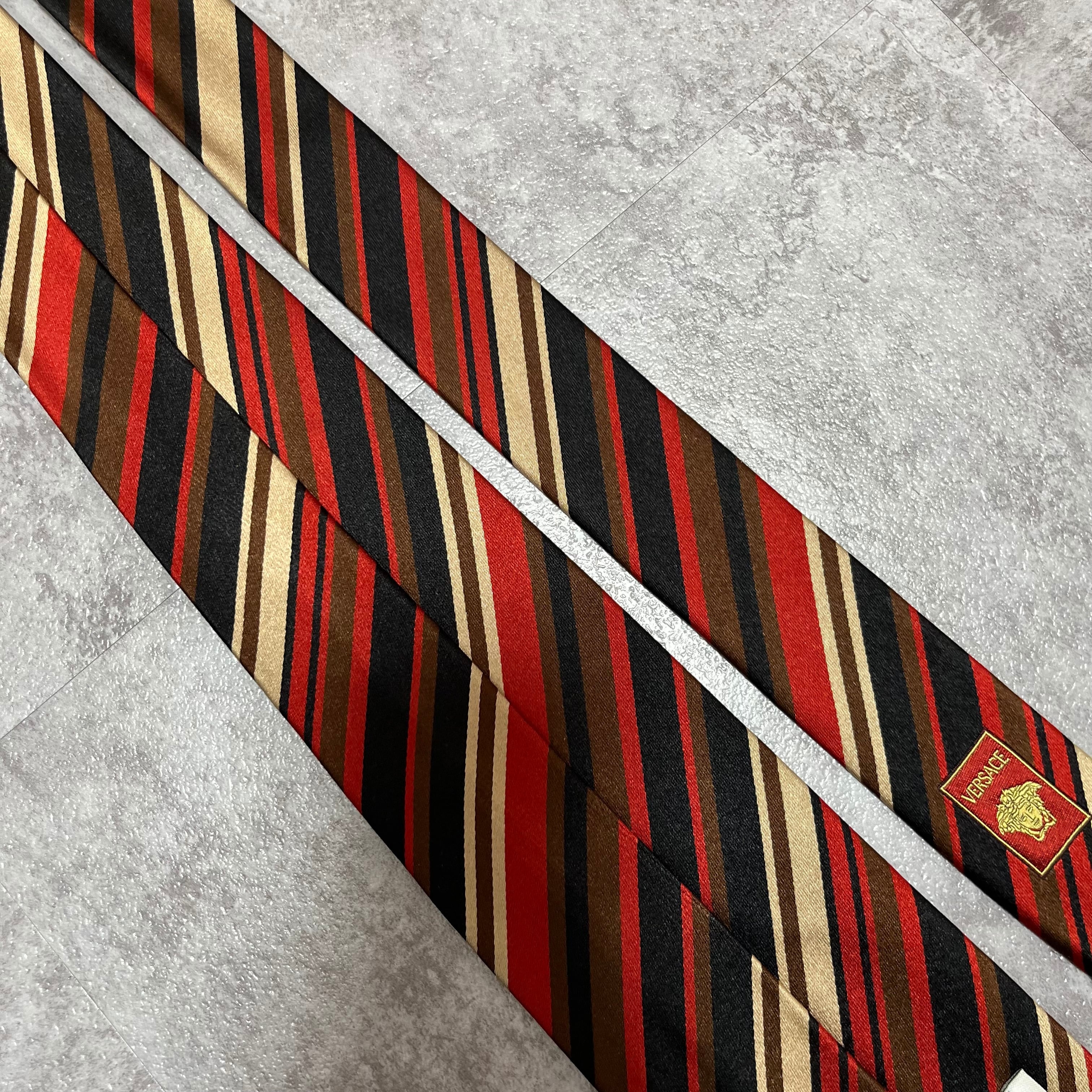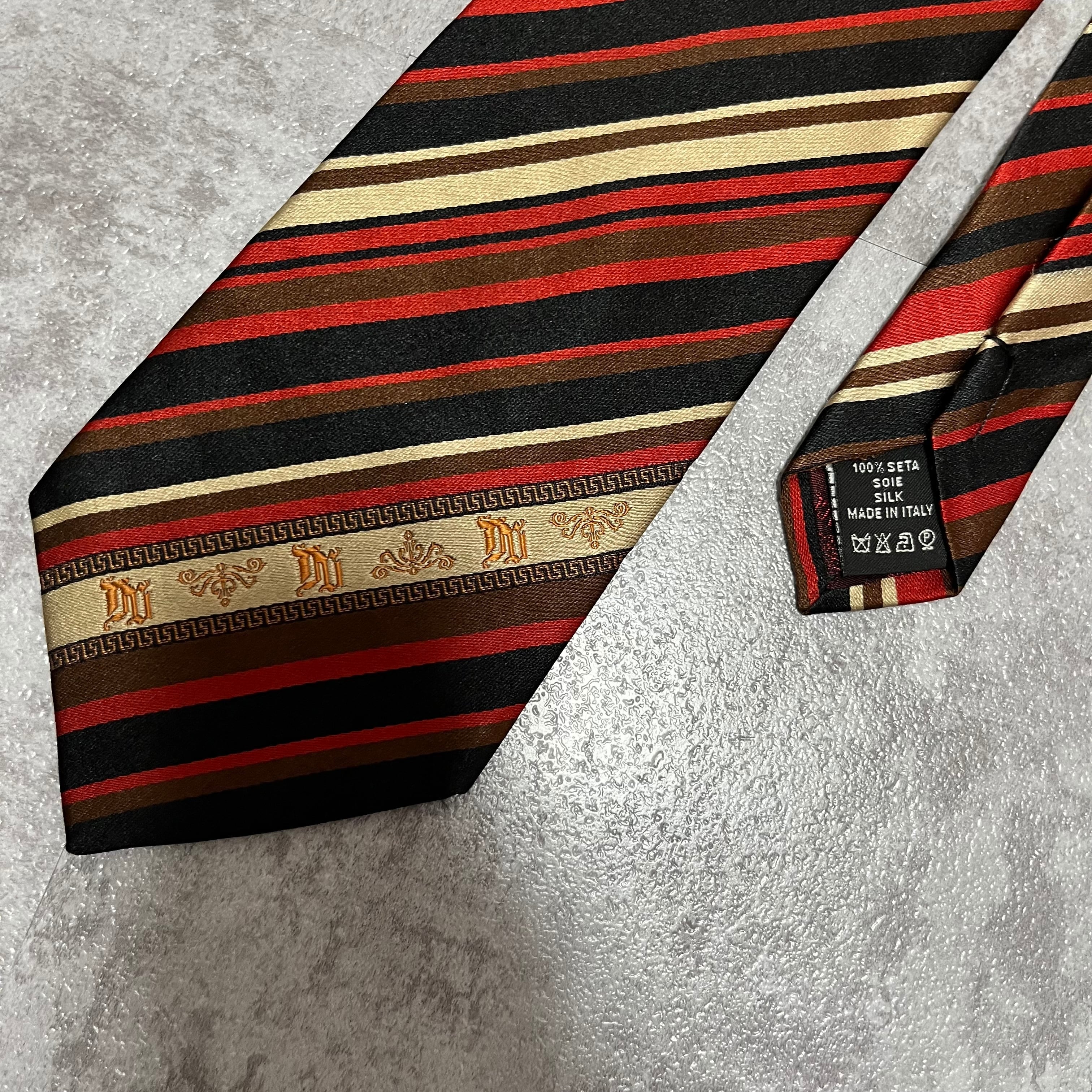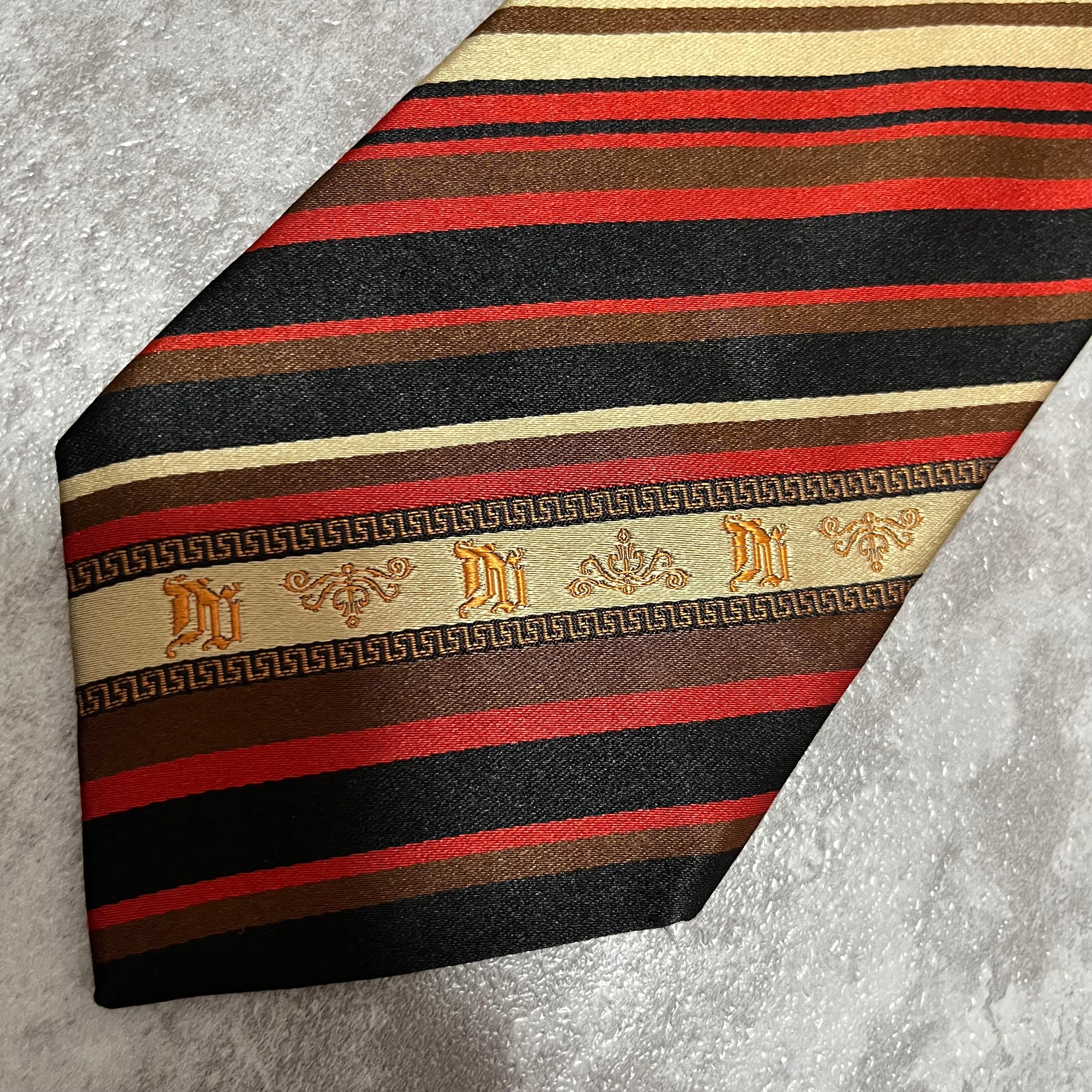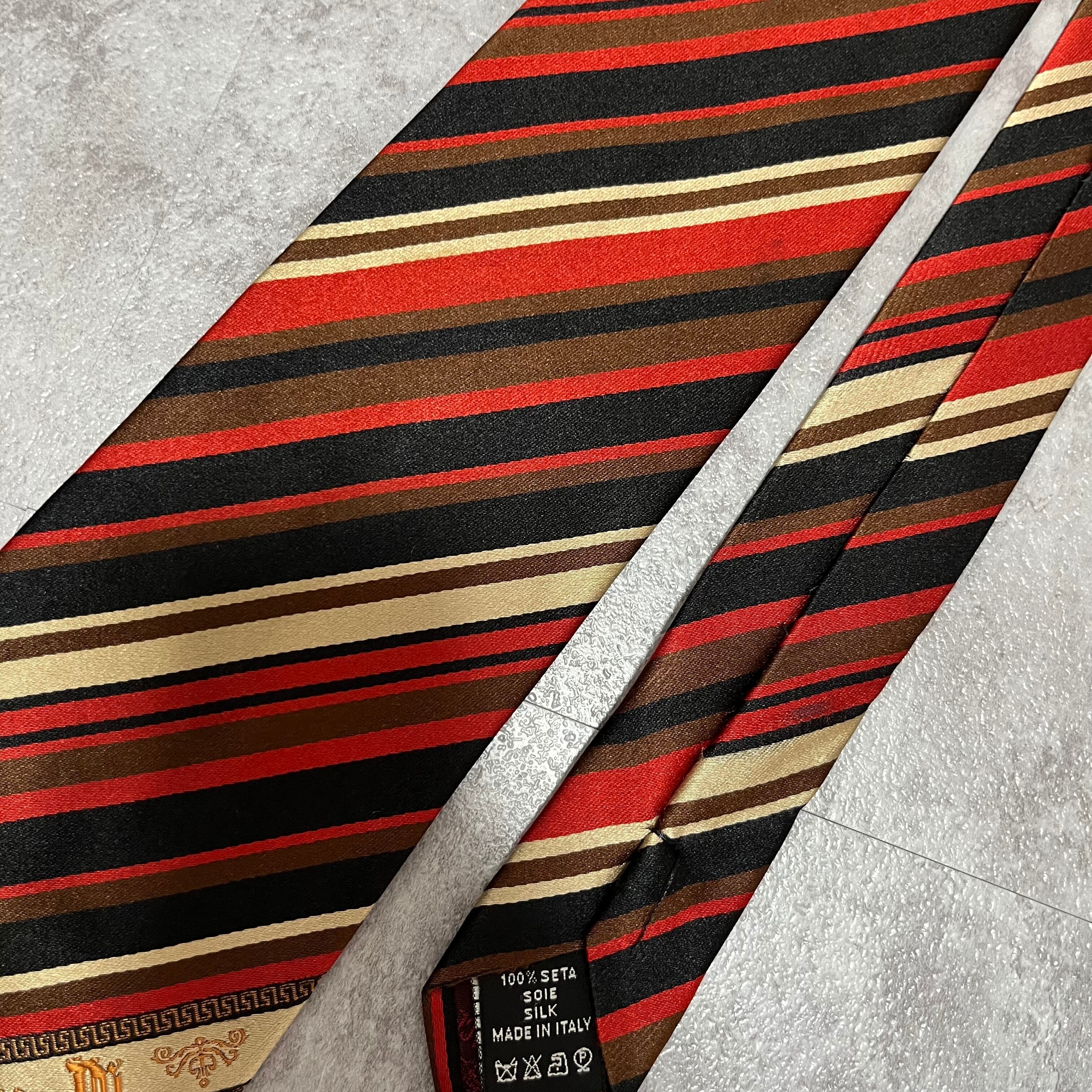 【Versace】レジメンタルストライプネクタイ ビジネス向け バイカラー 黒 橙 金 マルチカラー ブラック オレンジ ゴールド 紋章入り ヴェルサーチェ