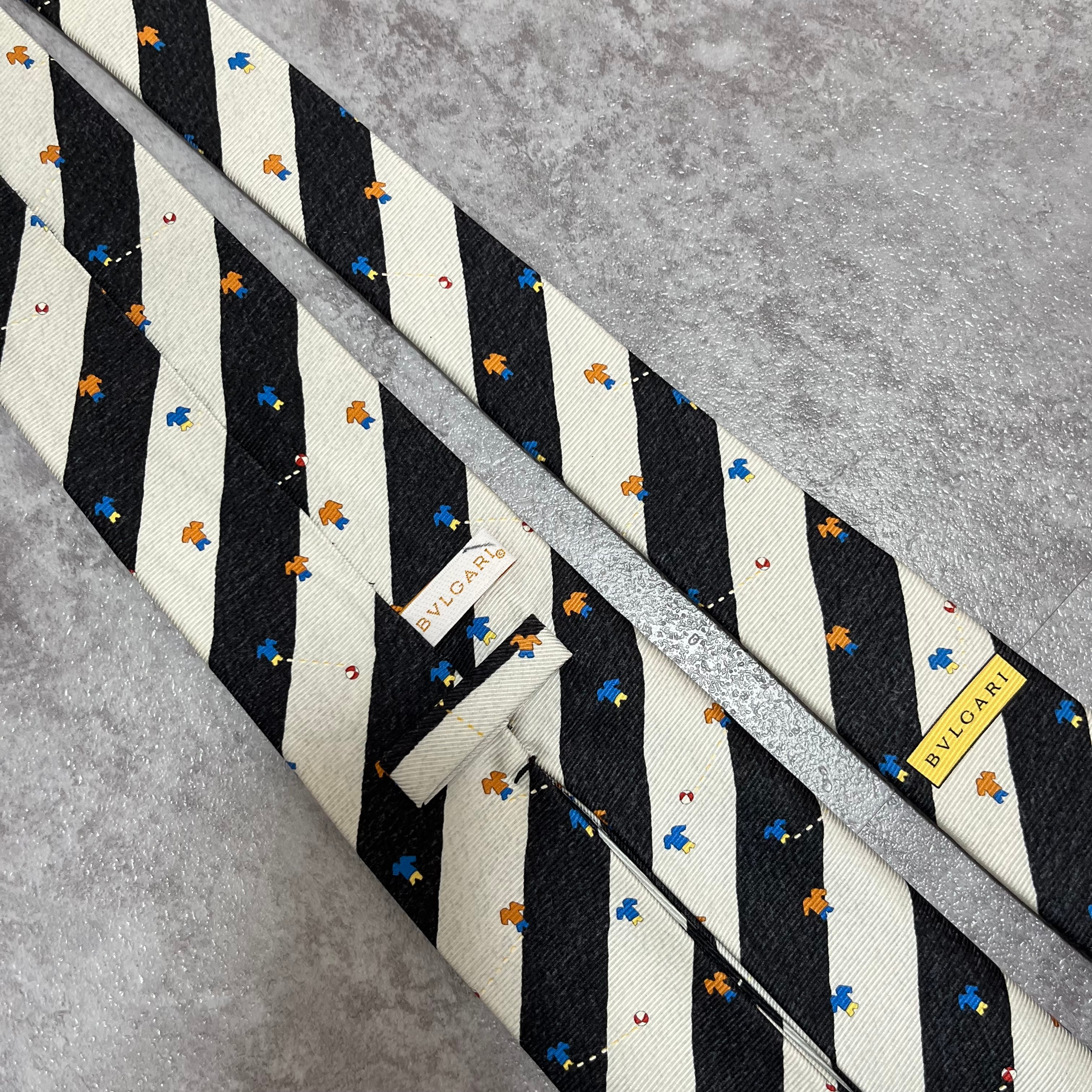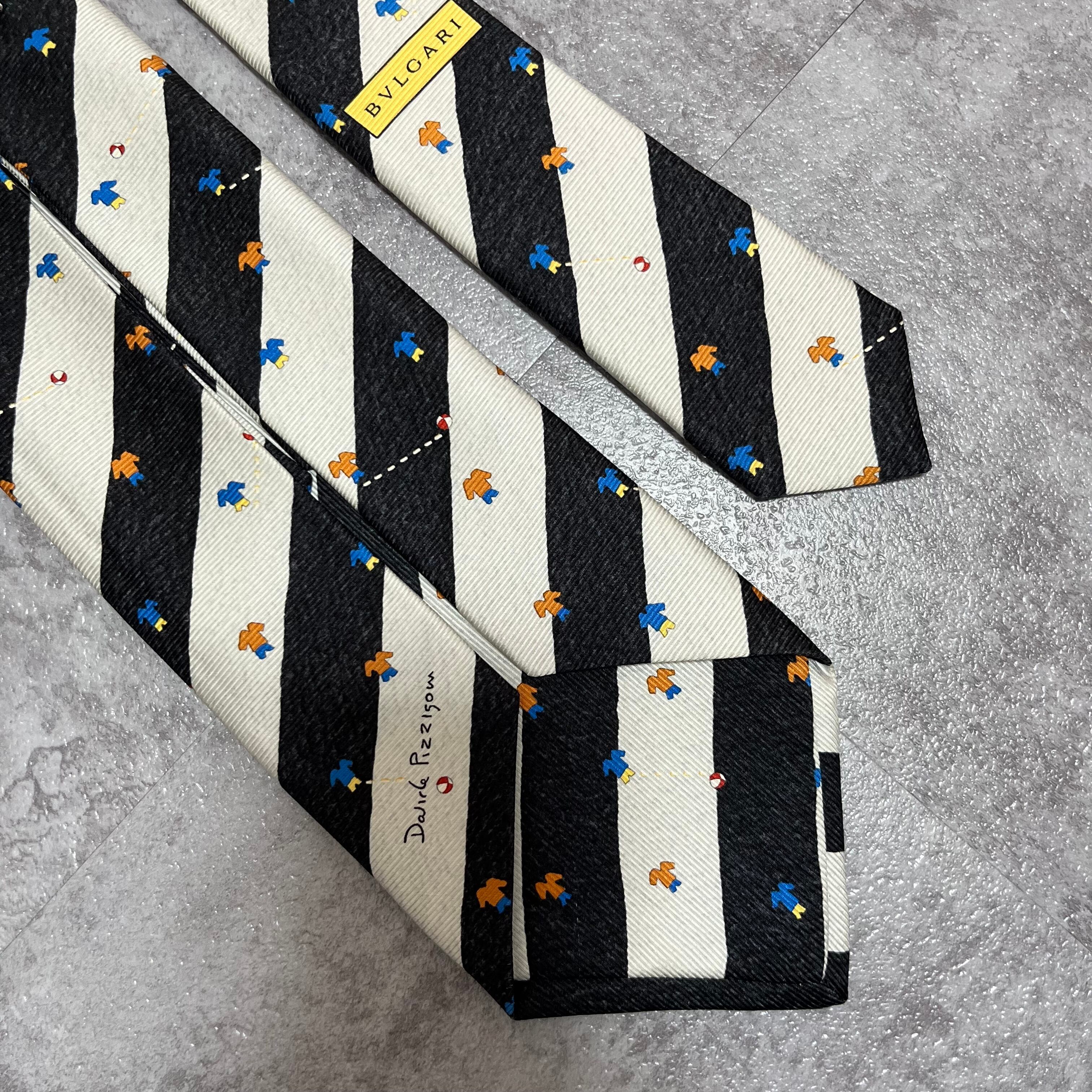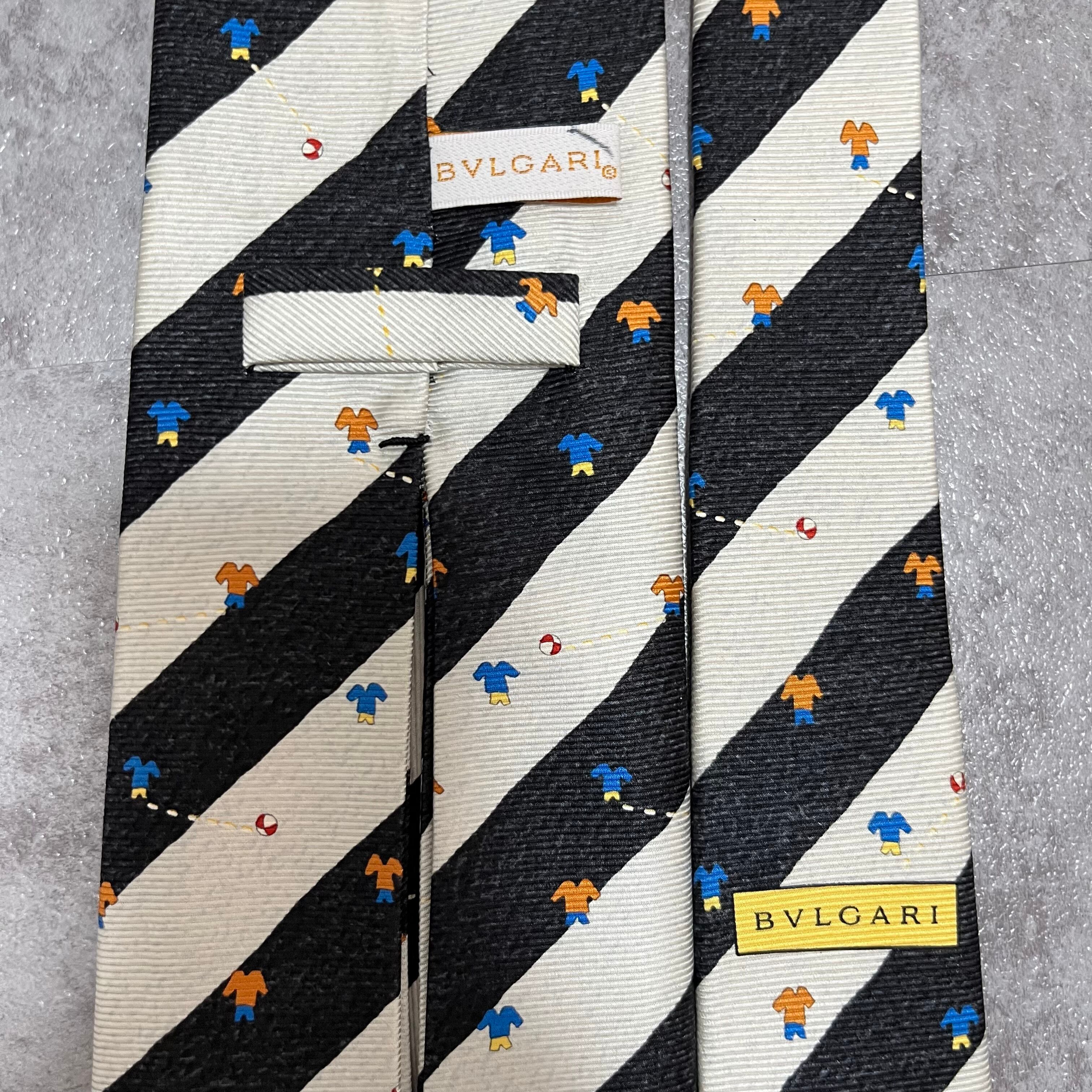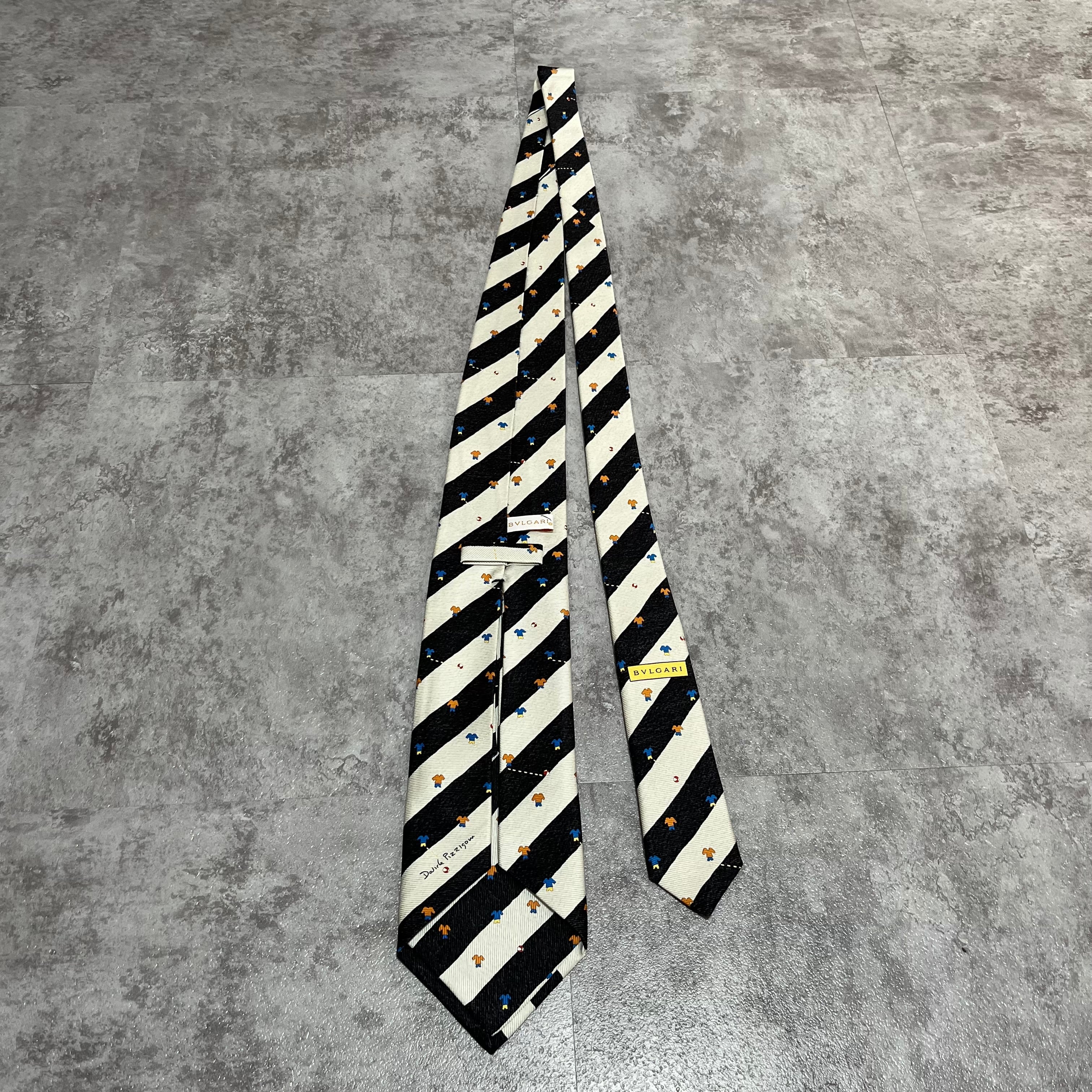 【BVLGARI】レジメンタルストライプネクタイ ビジネス向け バイカラー ブラック ホワイト 子供服モチーフ 黒 白 最高級 セッテピエゲ ブルガリ