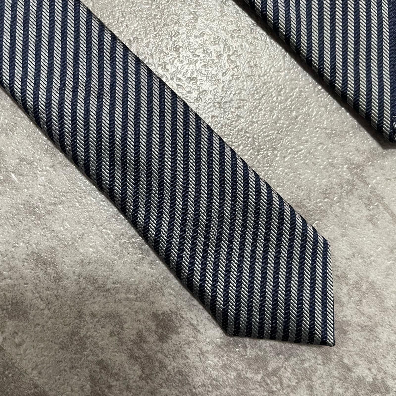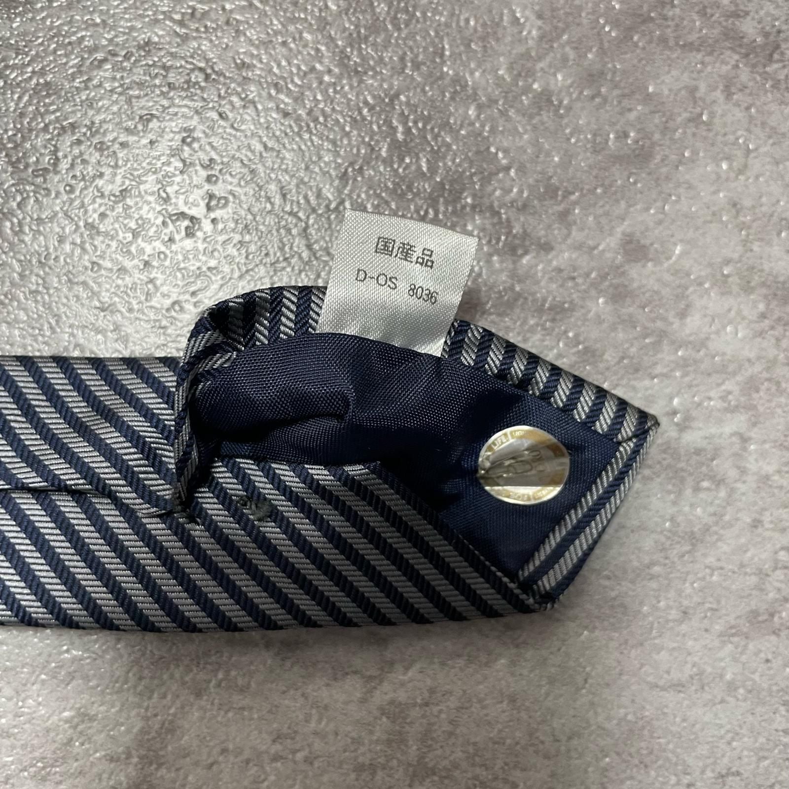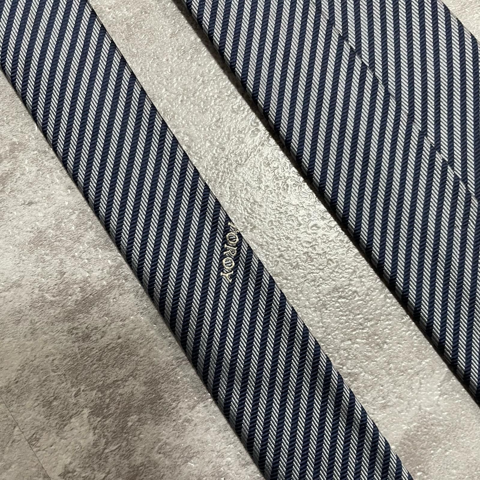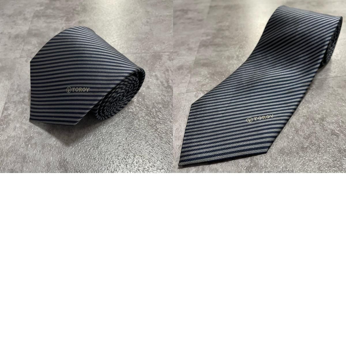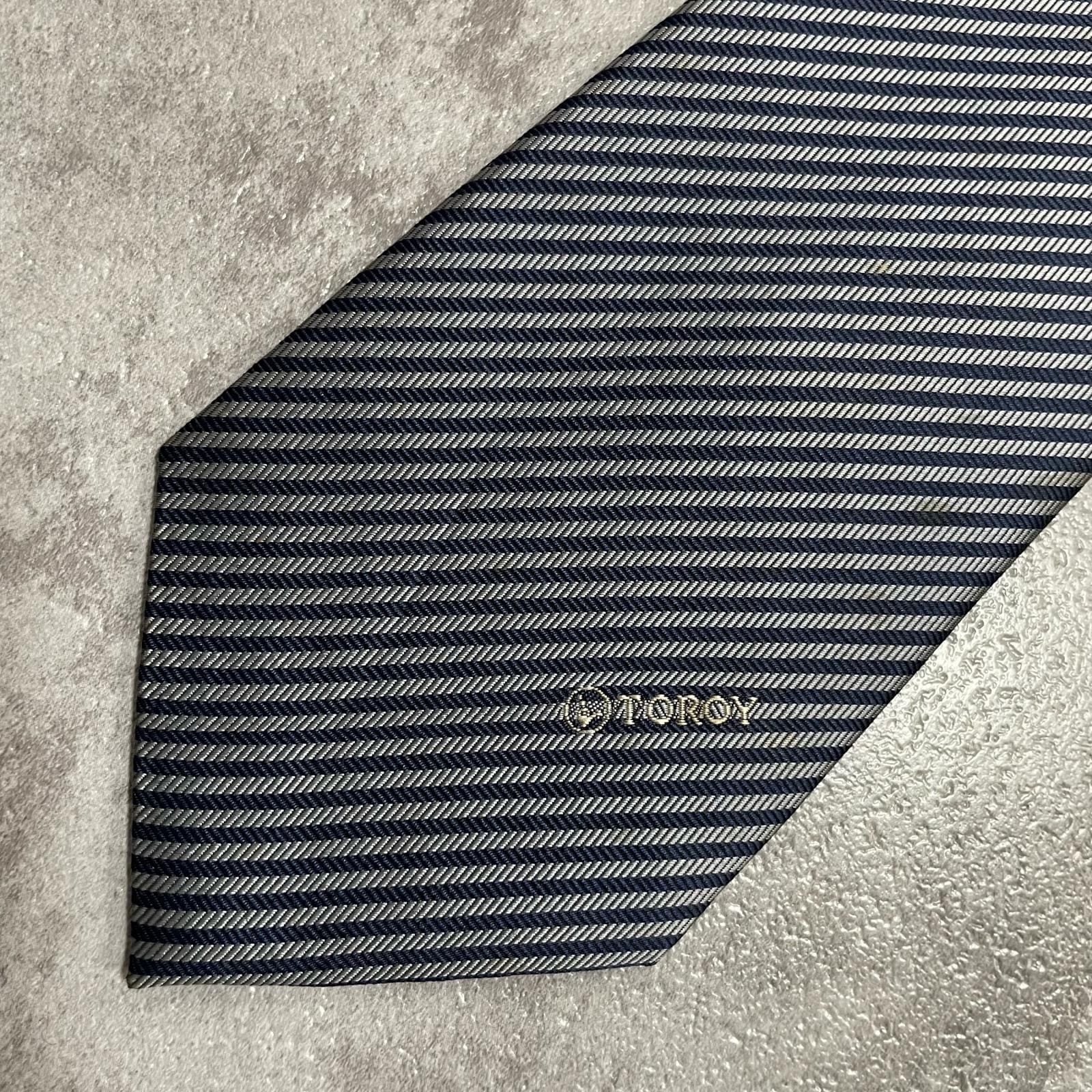 【TOROY】トロイ ロゴ入りストライプ柄ネクタイ シルク/ポリエステル メンズ 日本製 ネイビー 紺色 シルバー 銀色 ブランドロゴ 斜めストライプ スーツスタイル クラシックデザイン