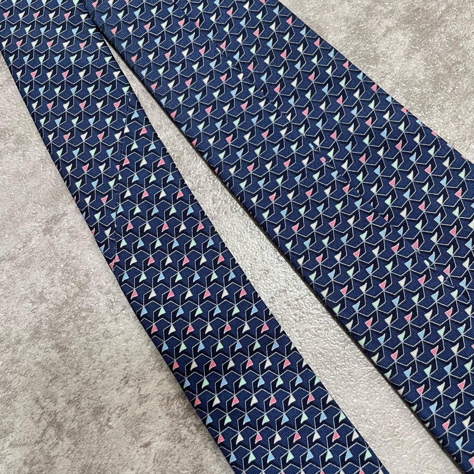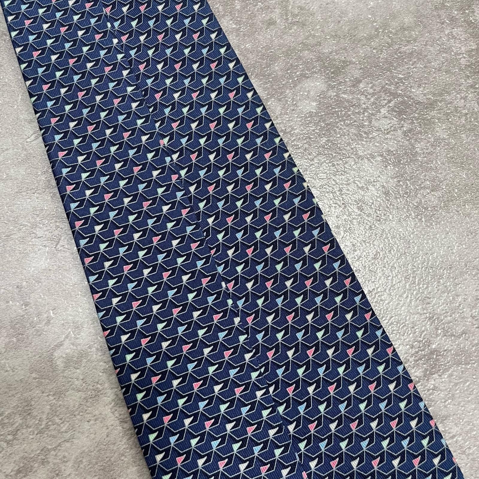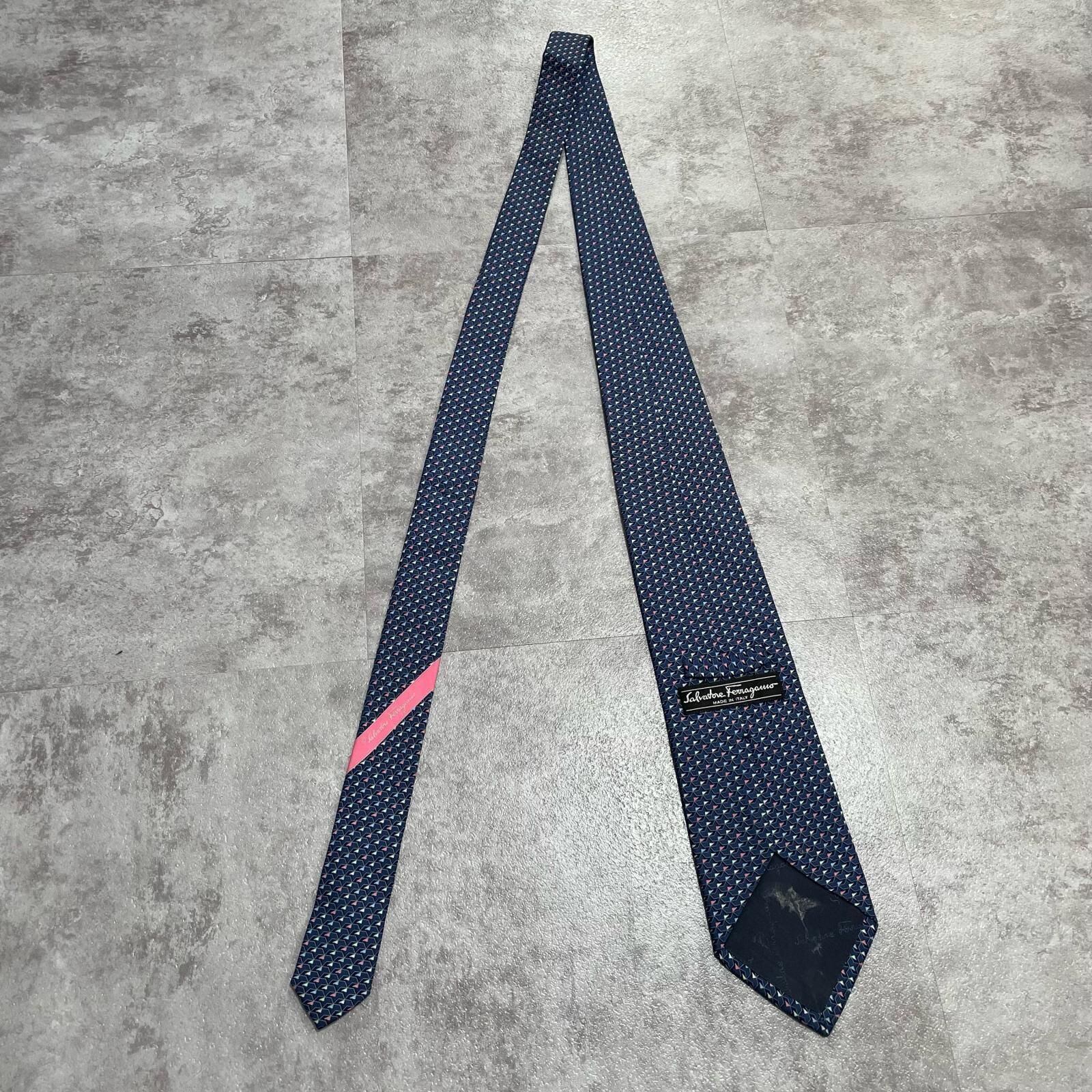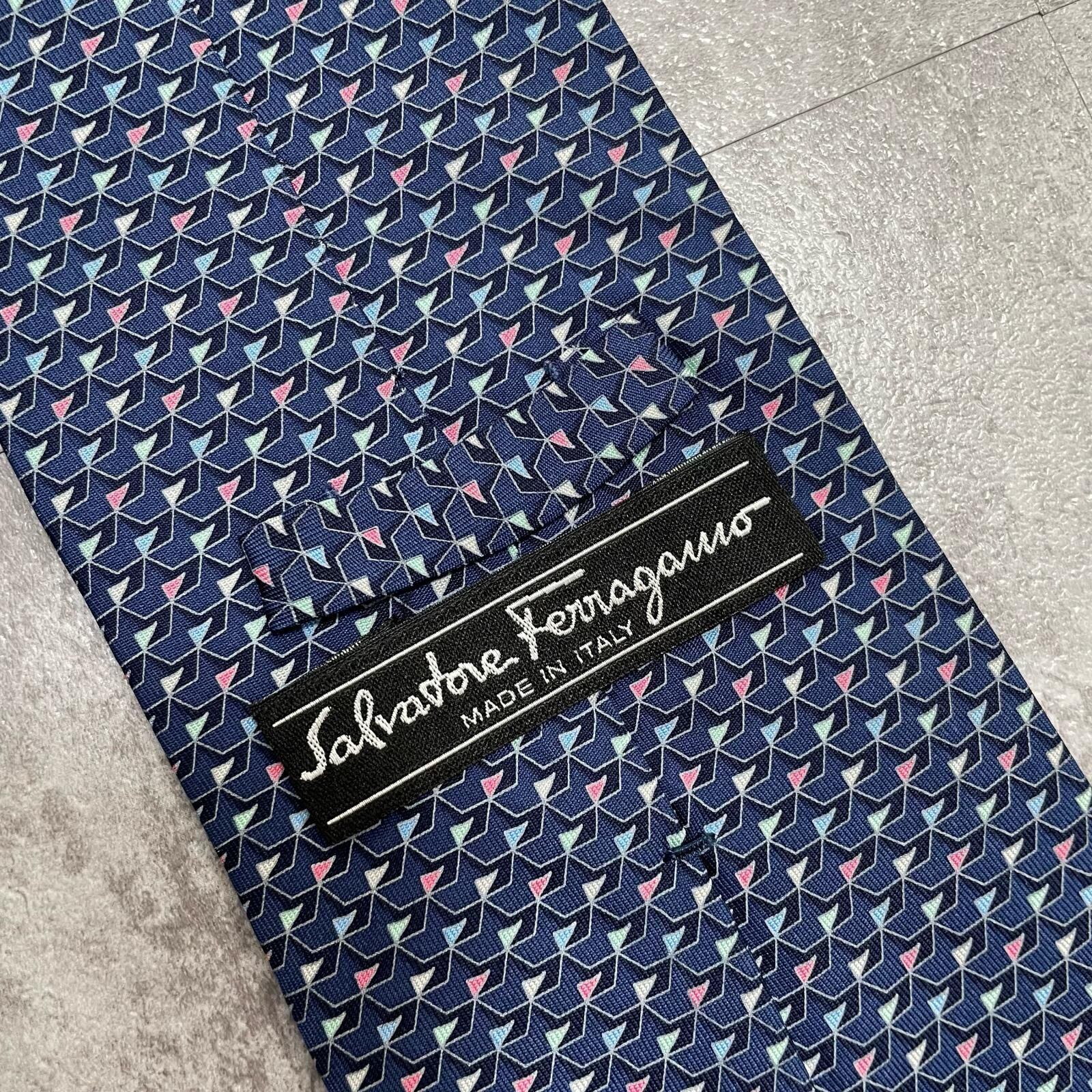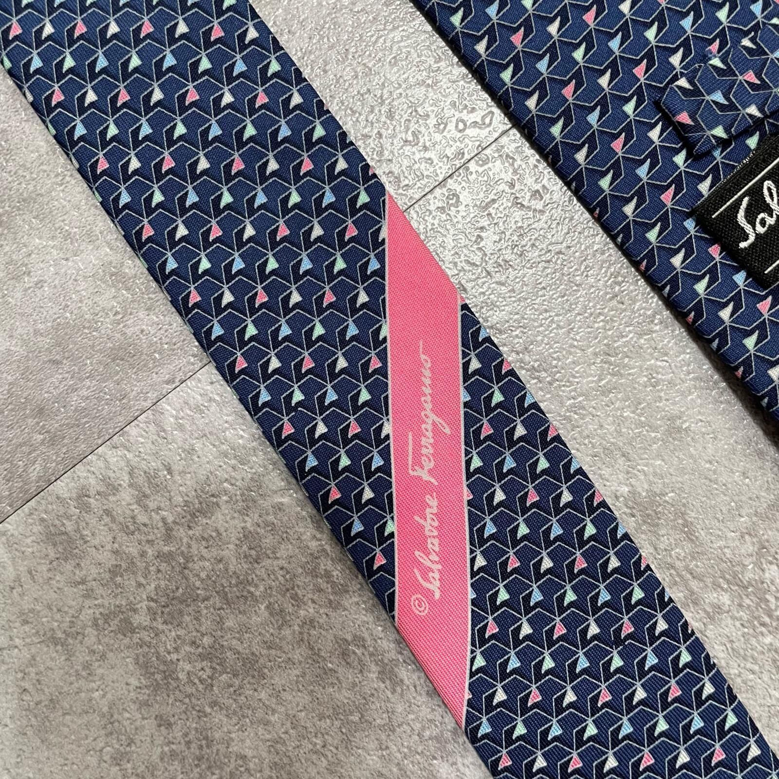 【Salvatore Ferragamo】サルヴァトーレフェラガモ 幾何学柄ネクタイ シルク100% メンズ ネイビー 紺色 バイカラー ピンク 桃色 イタリア製 ビジネス向け