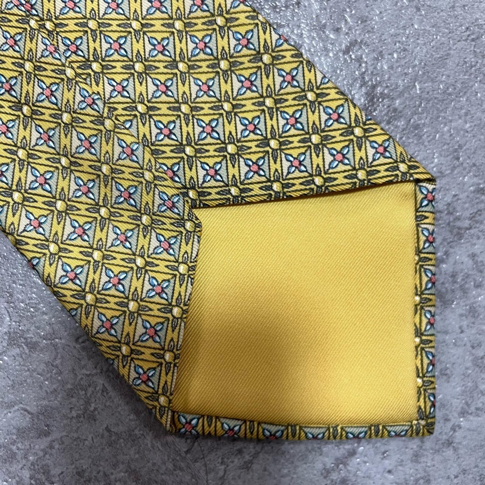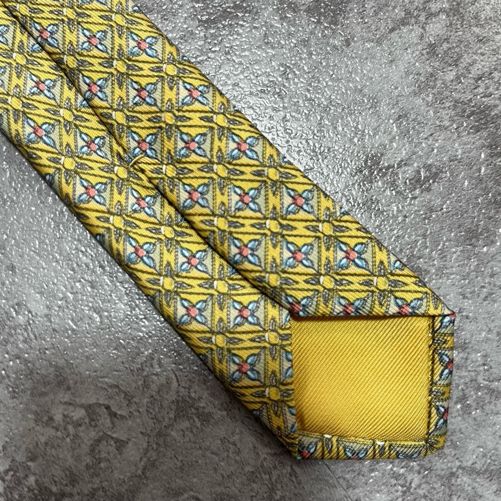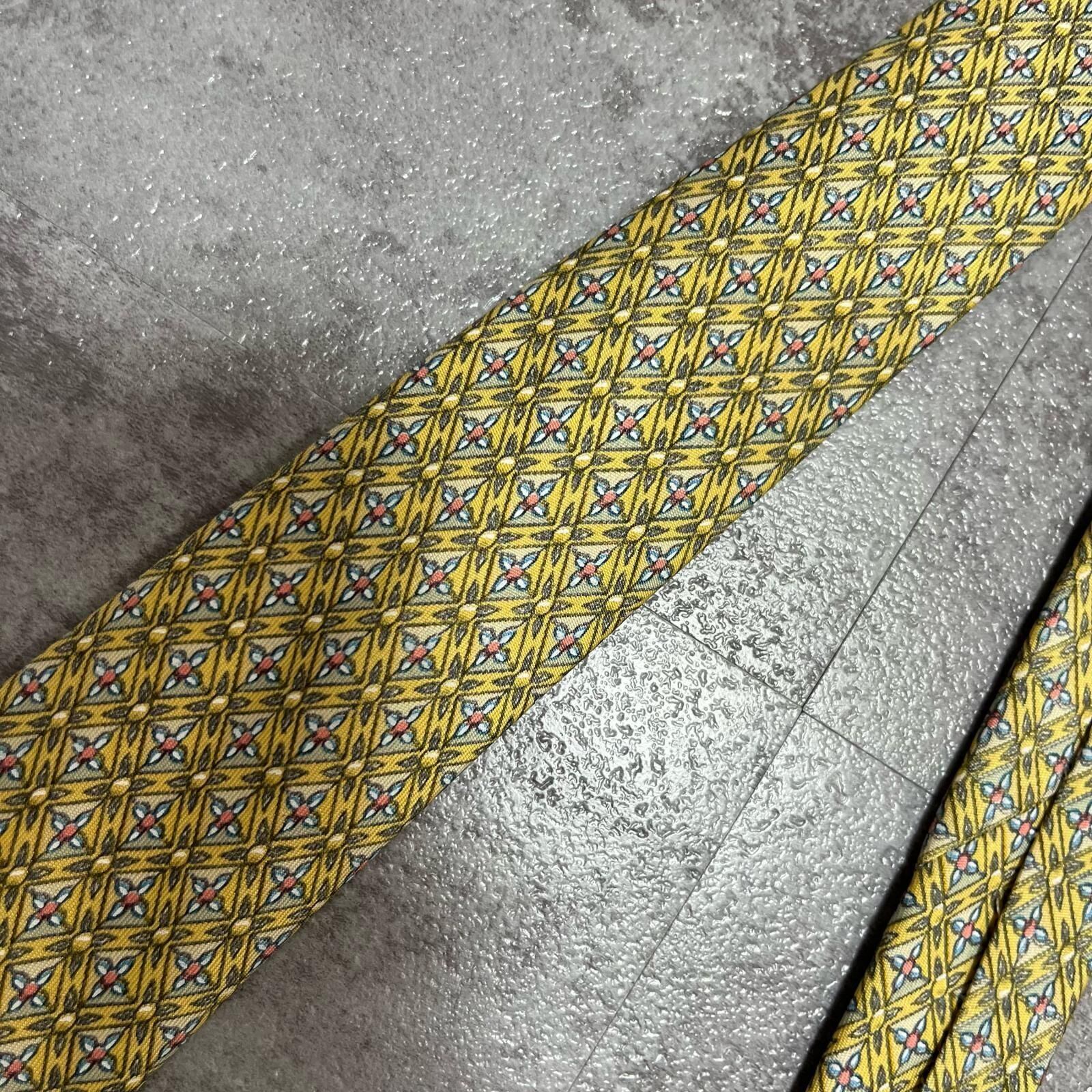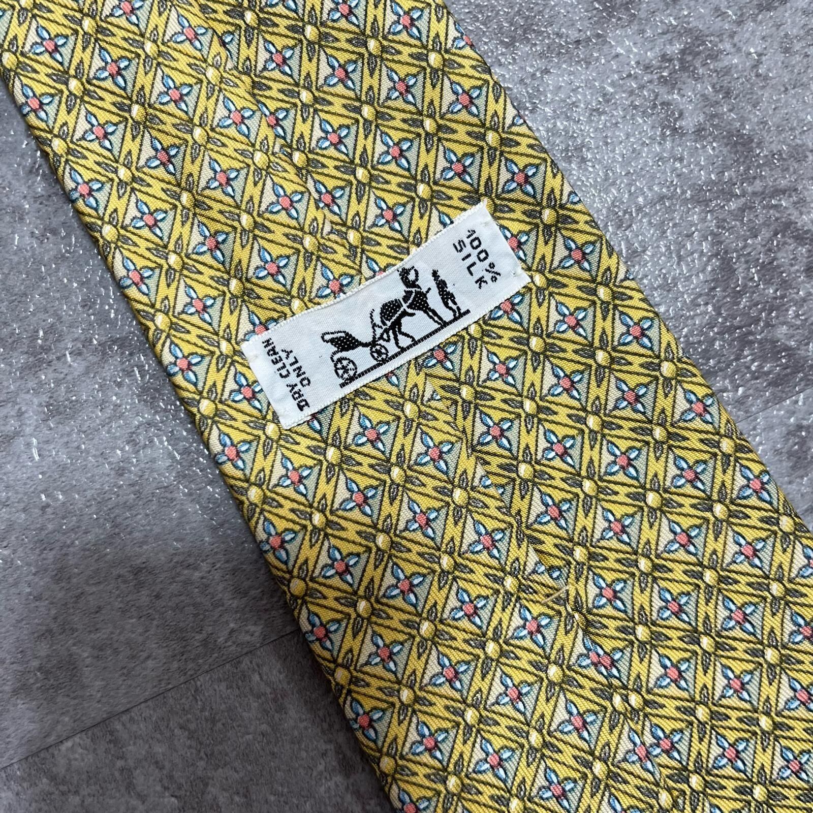 【HERMES】エルメス 総柄ネクタイ シルク100% メンズ フランス製 イエロー 黄色 ブルー 水色 レッド 赤色 幾何学柄 小紋柄 総柄 ビジネス フォーマル スーツスタイル ブランドネクタイ