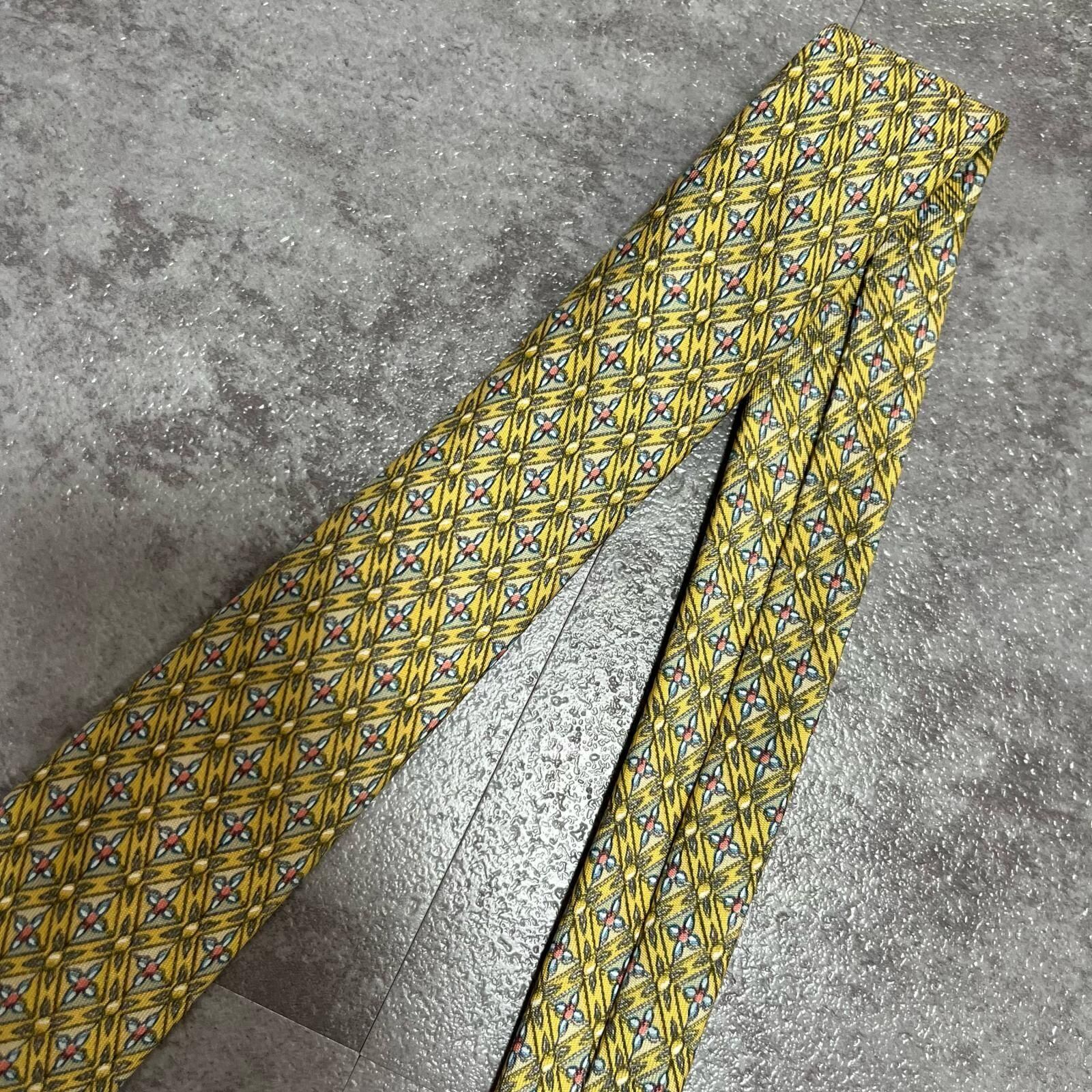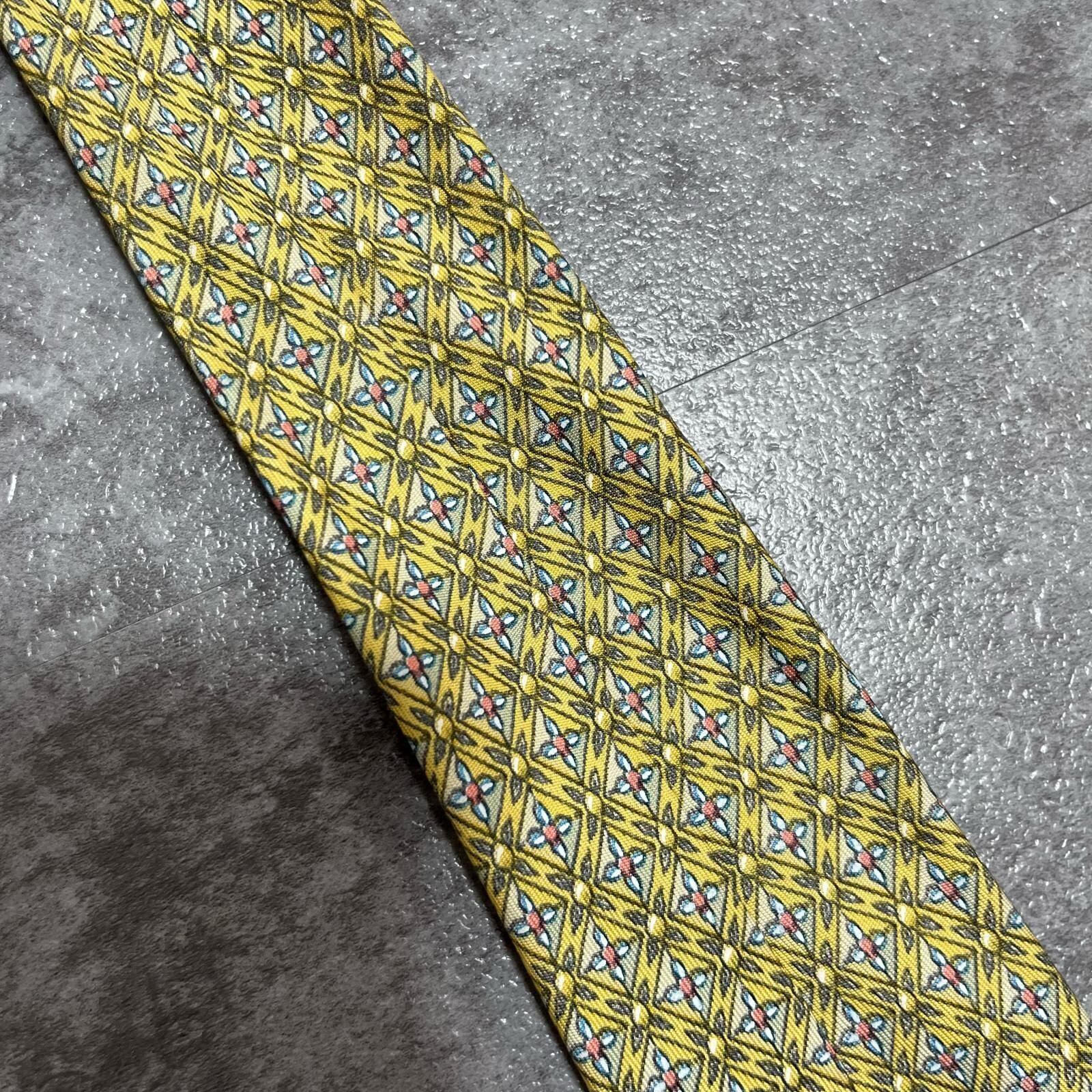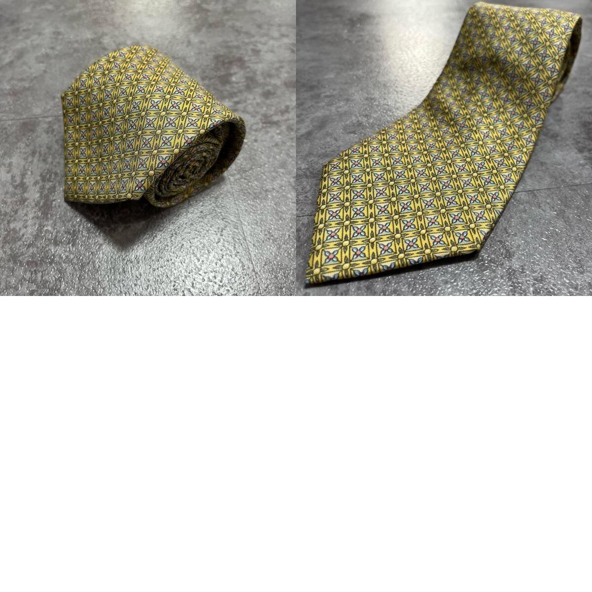 【HERMES】エルメス 総柄ネクタイ シルク100% メンズ フランス製 イエロー 黄色 ブルー 水色 レッド 赤色 幾何学柄 小紋柄 総柄 ビジネス フォーマル スーツスタイル ブランドネクタイ