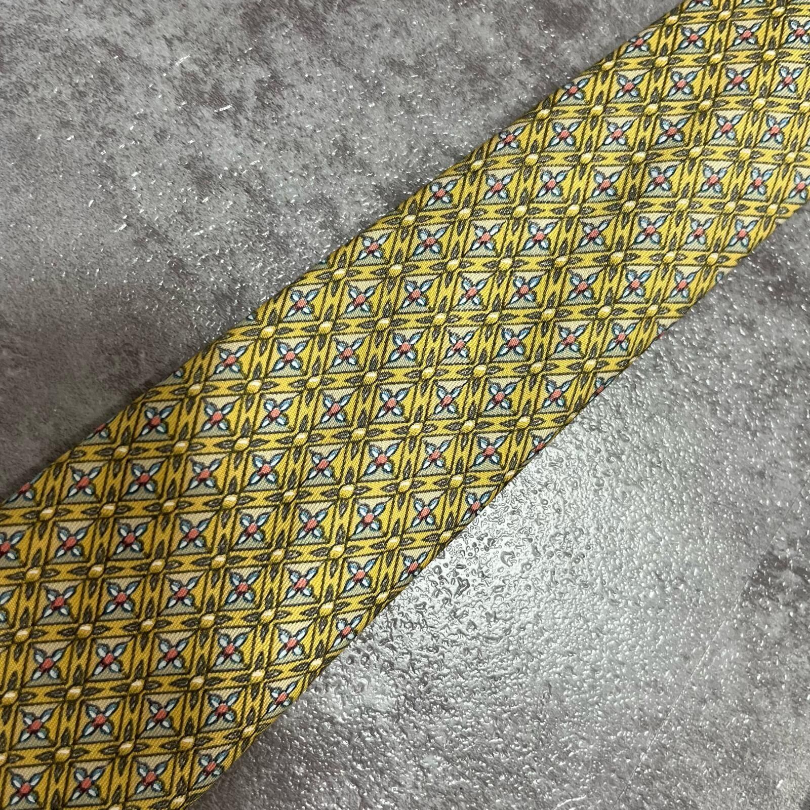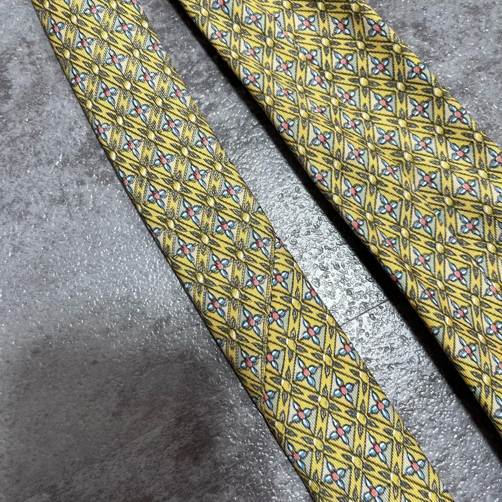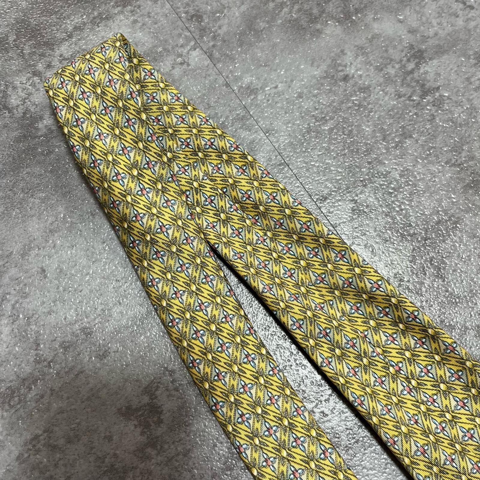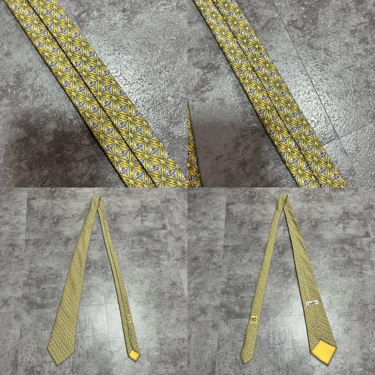 【HERMES】エルメス 総柄ネクタイ シルク100% メンズ フランス製 イエロー 黄色 ブルー 水色 レッド 赤色 幾何学柄 小紋柄 総柄 ビジネス フォーマル スーツスタイル ブランドネクタイ
