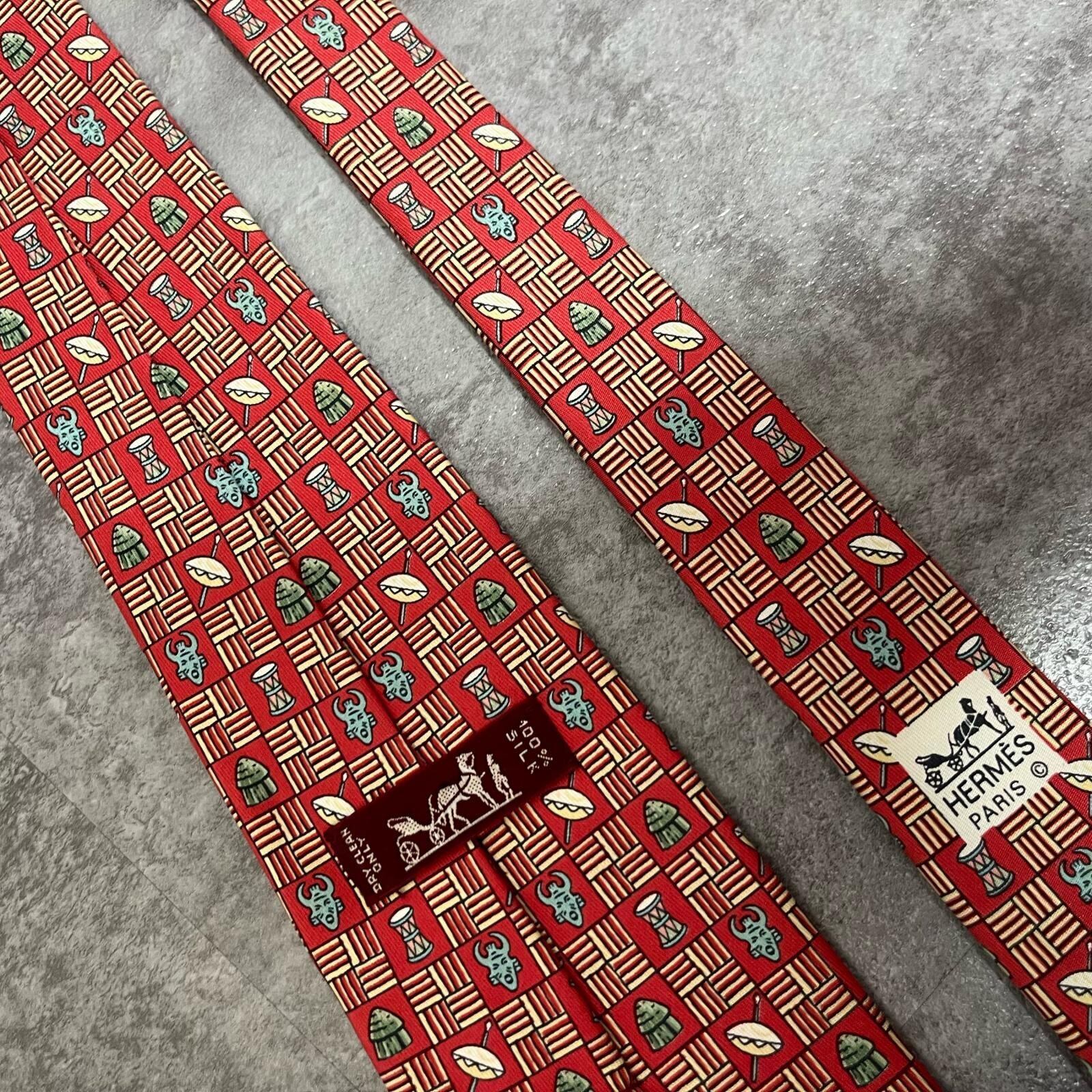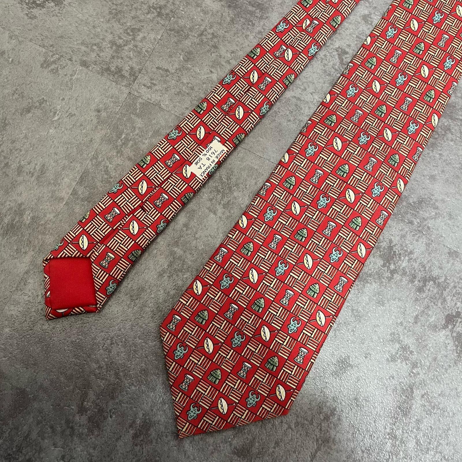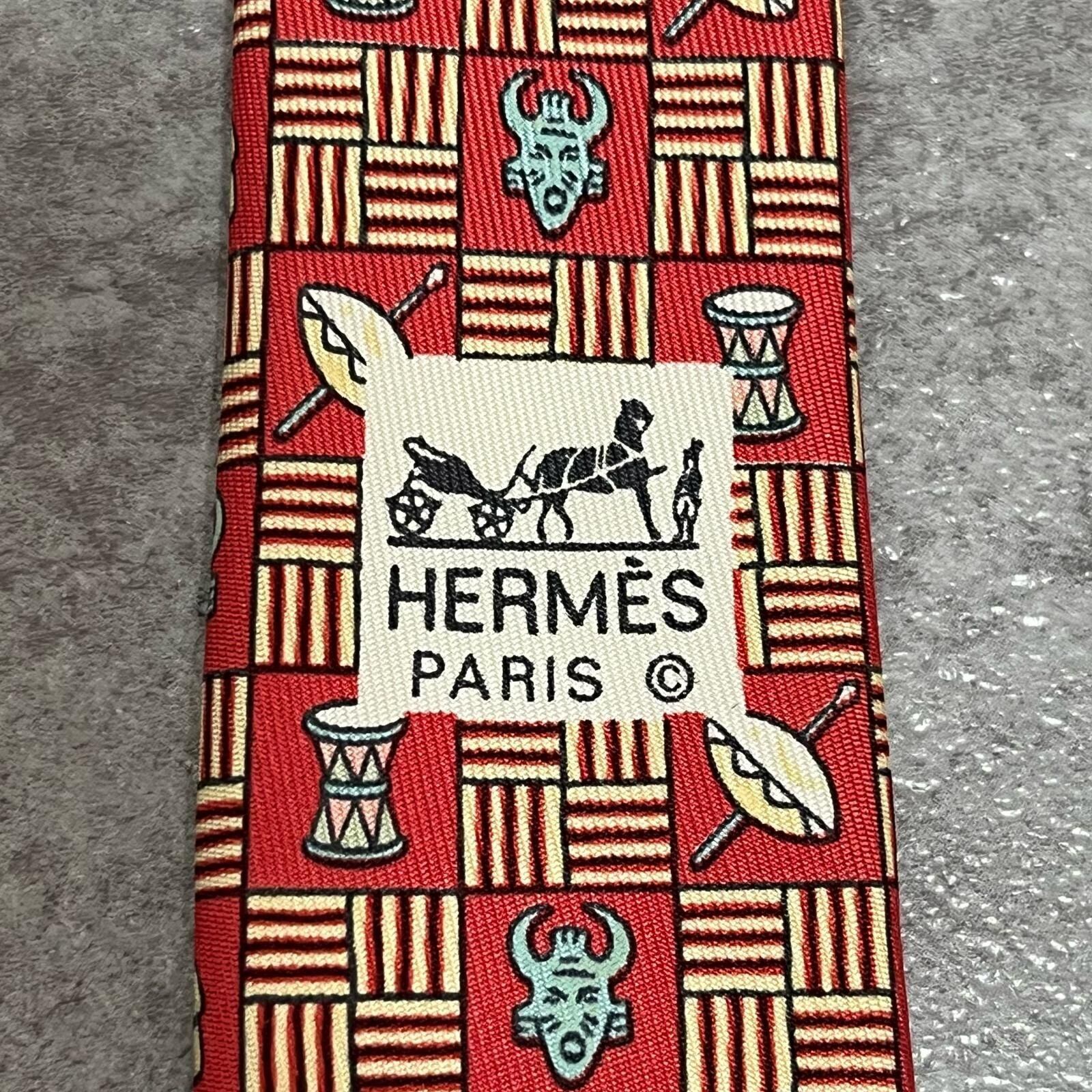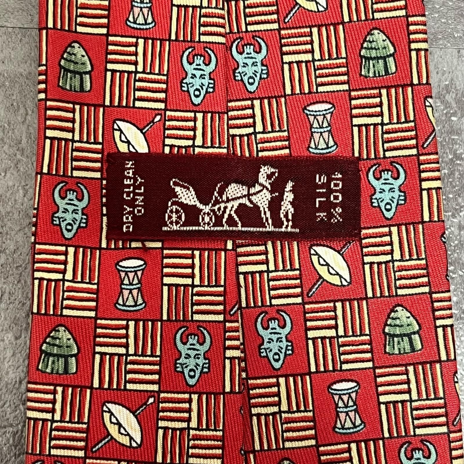 【HERMES】エルメス 民族柄ネクタイ 民族モチーフ シルク100% メンズ フランス製 レッド 赤色 幾何学柄 ビジネスネクタイ ブランドネクタイ フォーマルネクタイ 民族デザイン