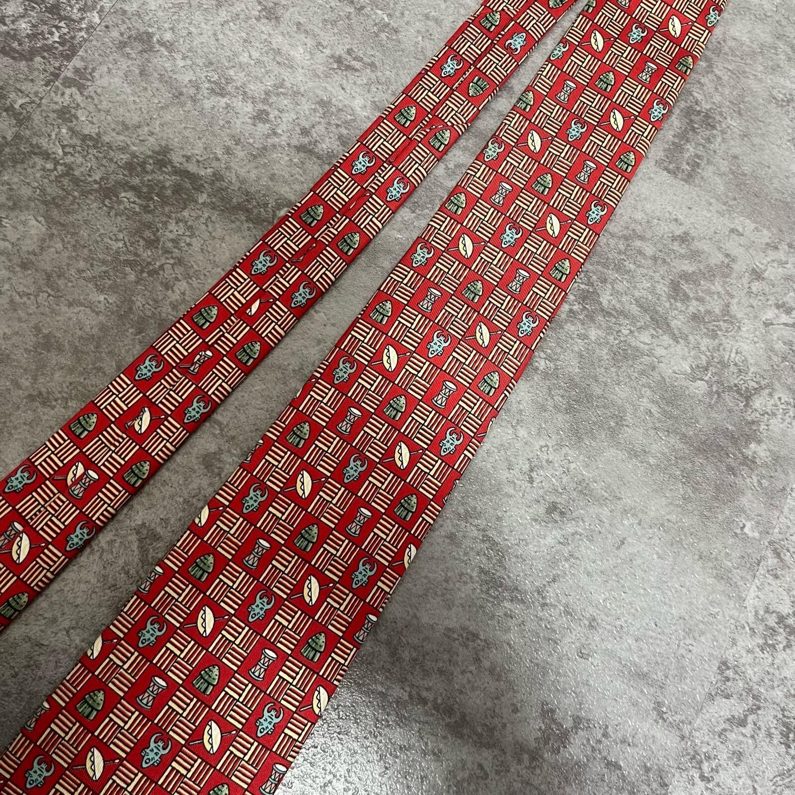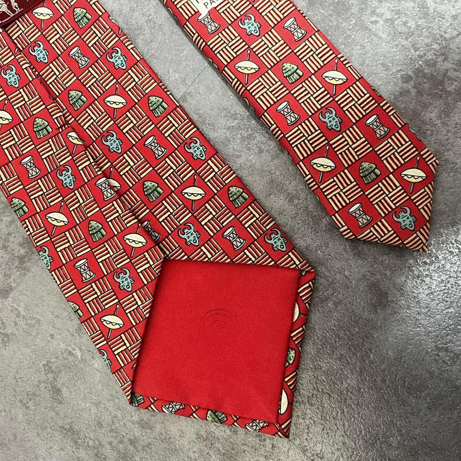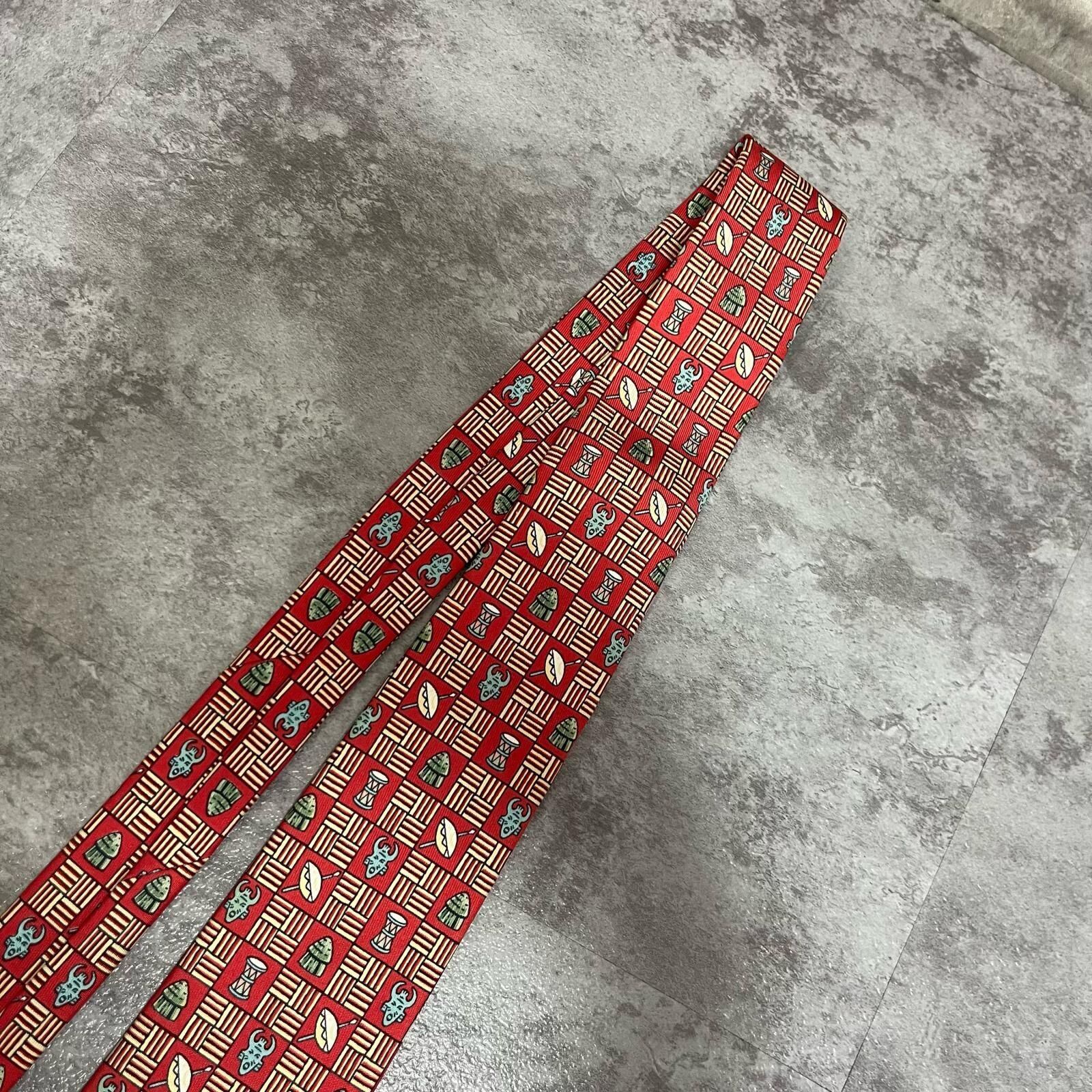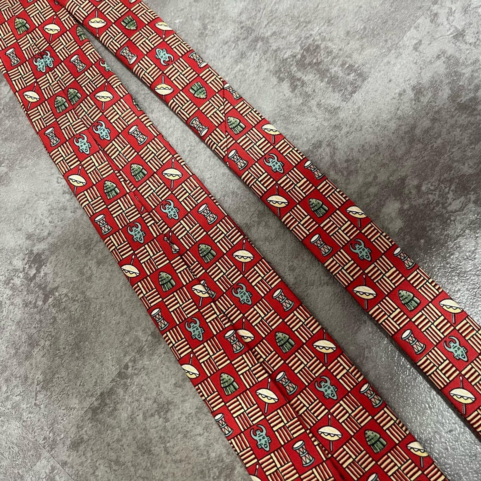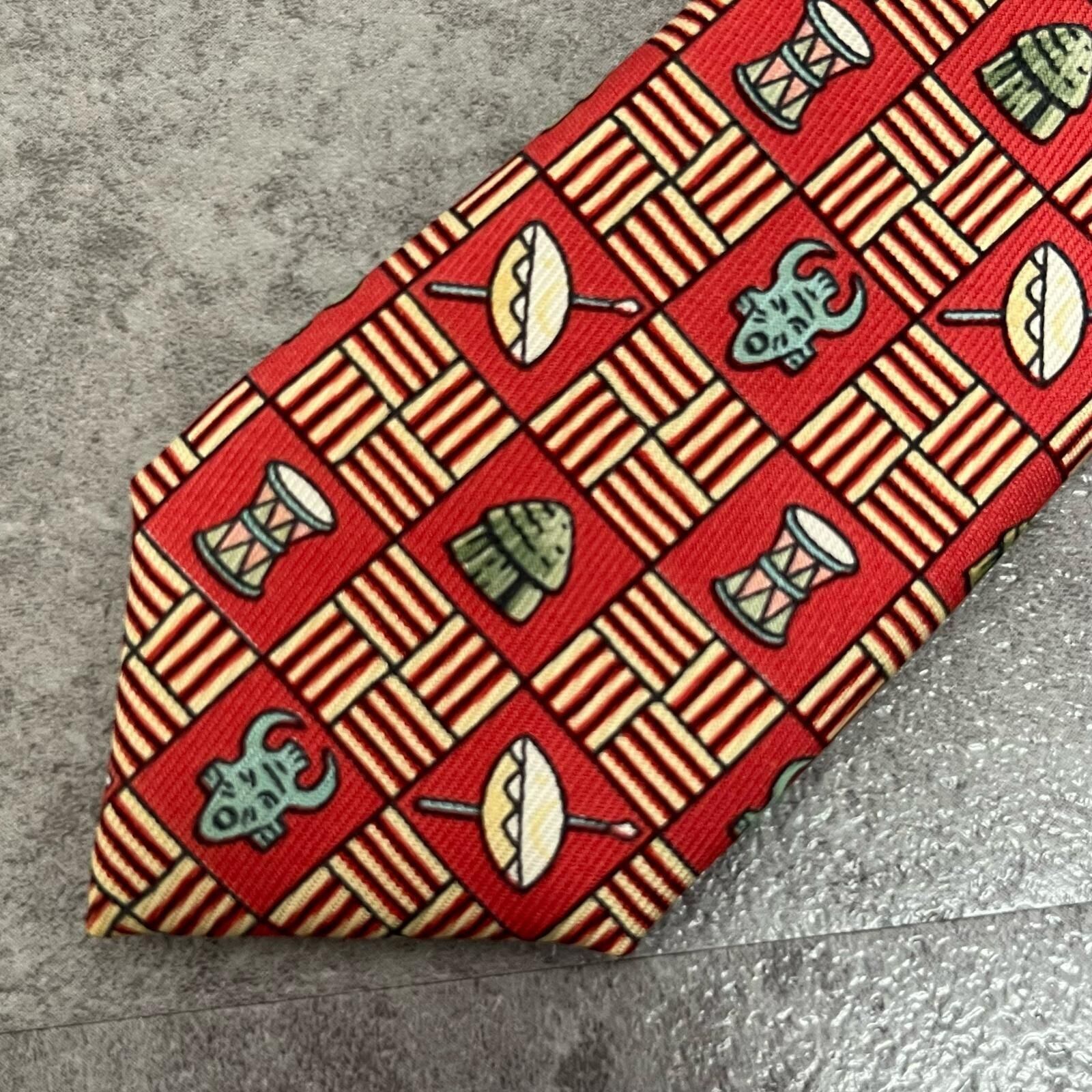 【HERMES】エルメス 民族柄ネクタイ 民族モチーフ シルク100% メンズ フランス製 レッド 赤色 幾何学柄 ビジネスネクタイ ブランドネクタイ フォーマルネクタイ 民族デザイン