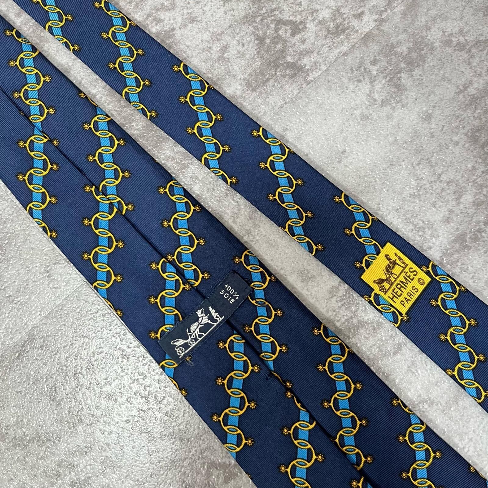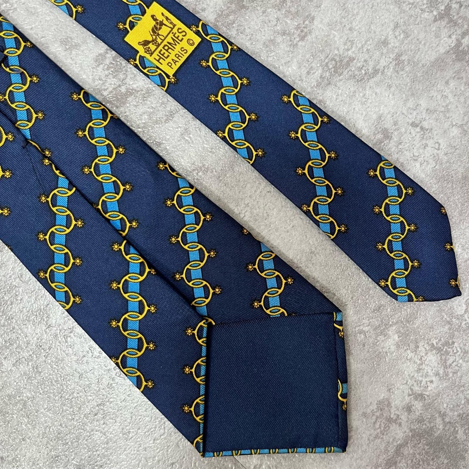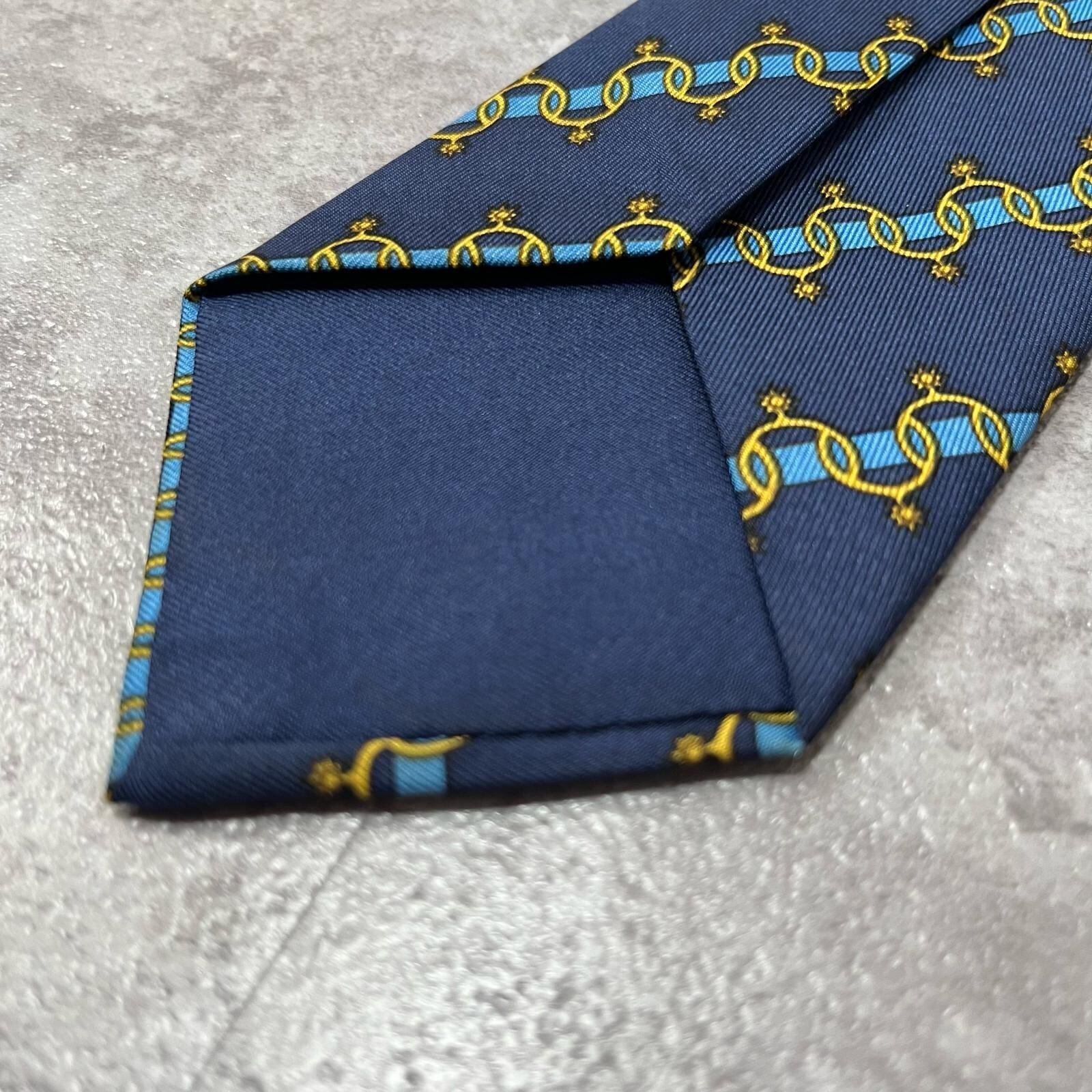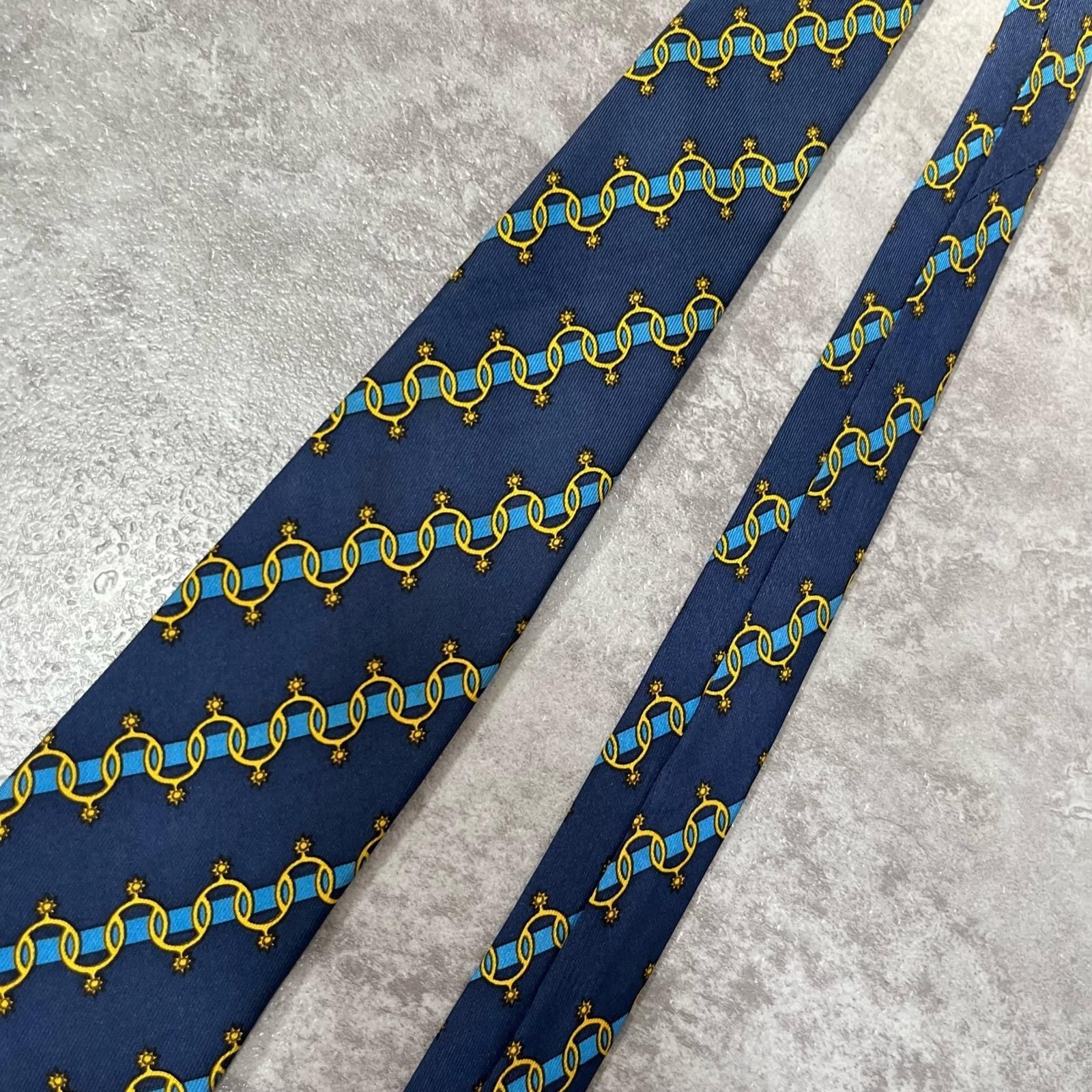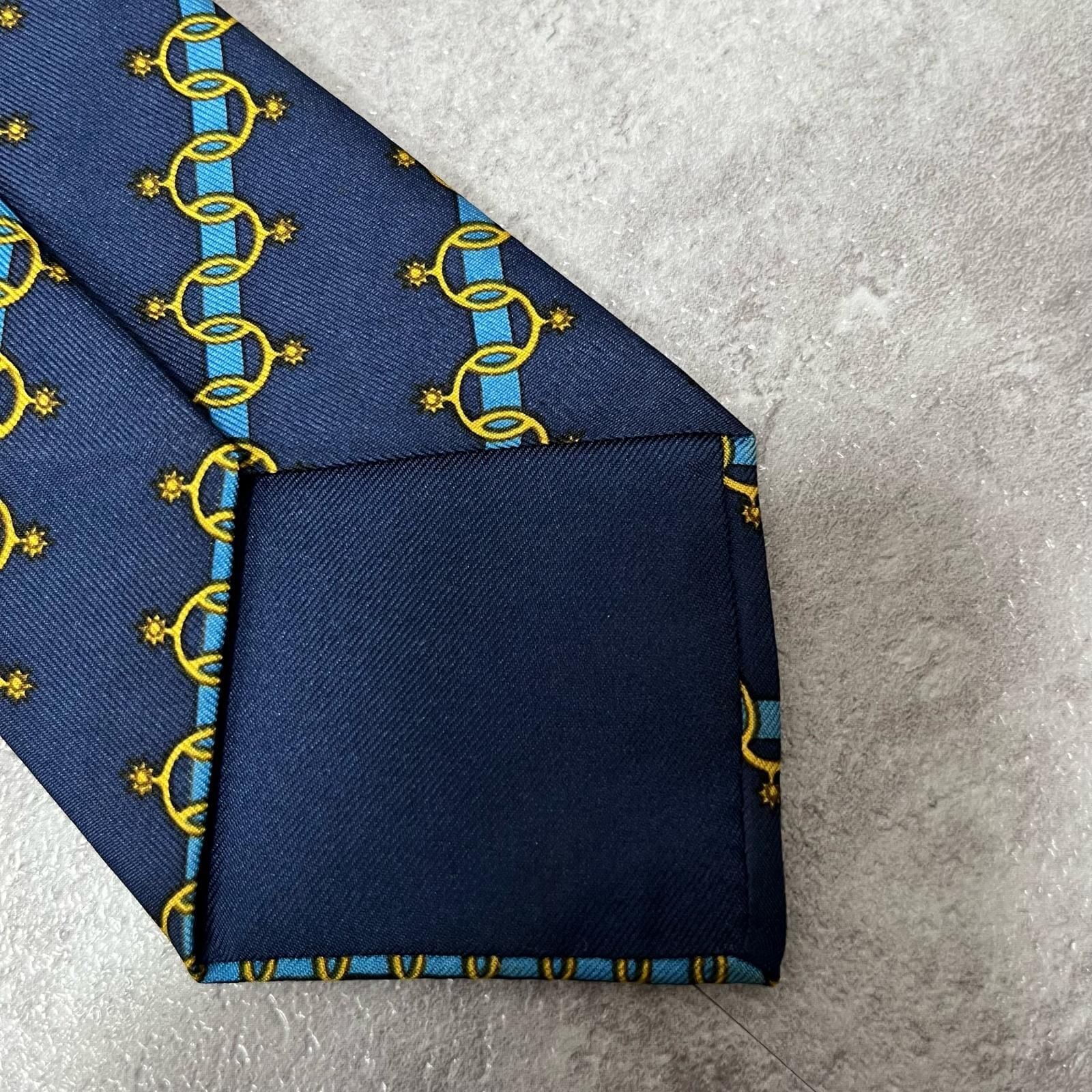 【HERMES】エルメス レジメンタルストライプネクタイ シルク100% メンズ ネイビー チェーンモチーフ チェーン柄 バイカラー 紺 青 ブルー イエロー 黄色 ビジネス向け シンプル フランス製