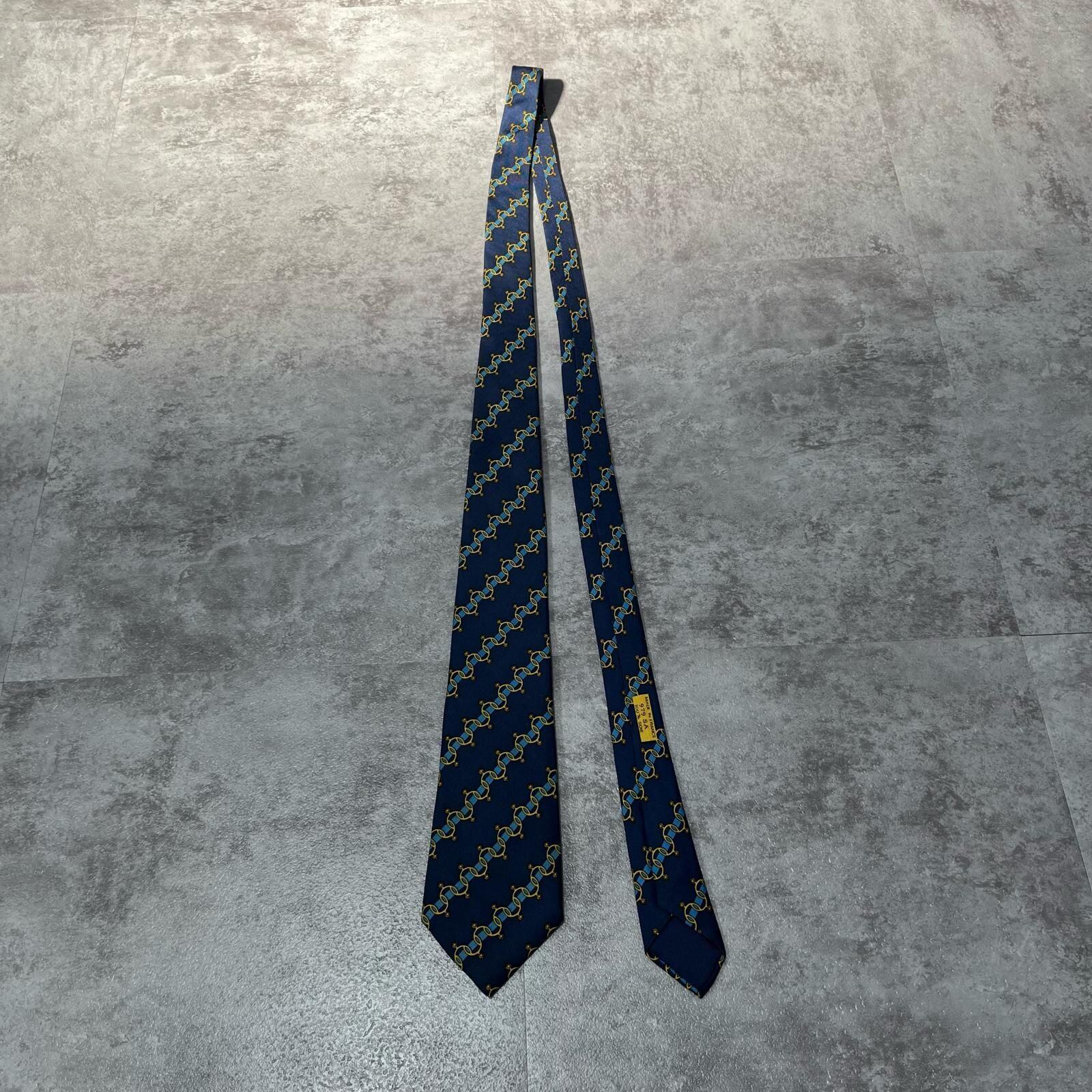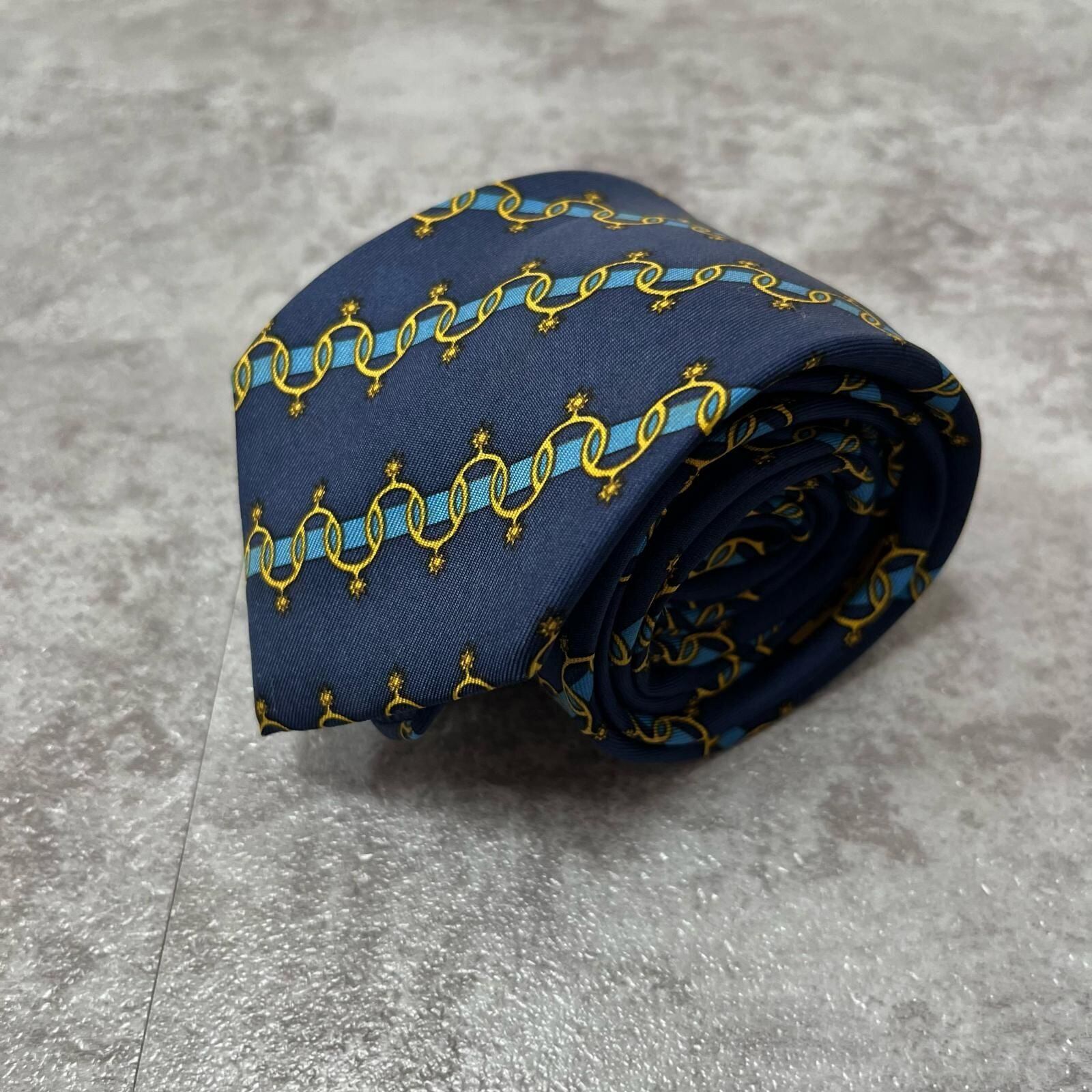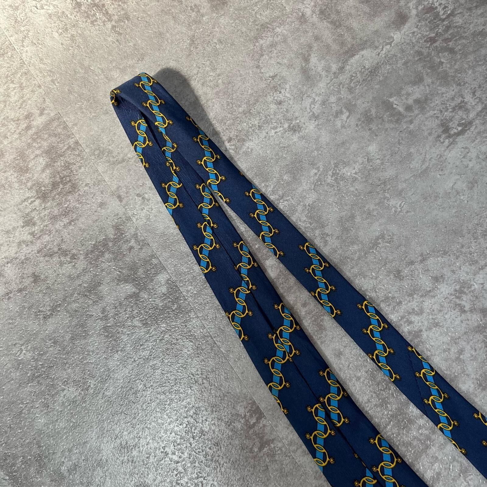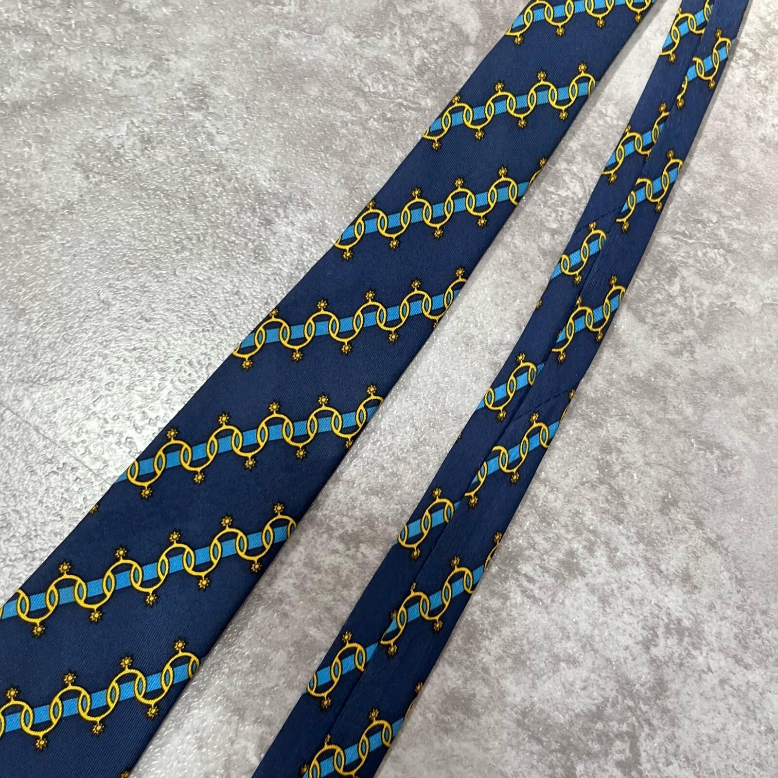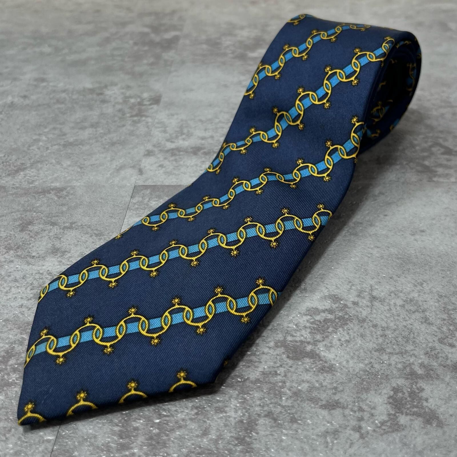 【HERMES】エルメス レジメンタルストライプネクタイ シルク100% メンズ ネイビー チェーンモチーフ チェーン柄 バイカラー 紺 青 ブルー イエロー 黄色 ビジネス向け シンプル フランス製