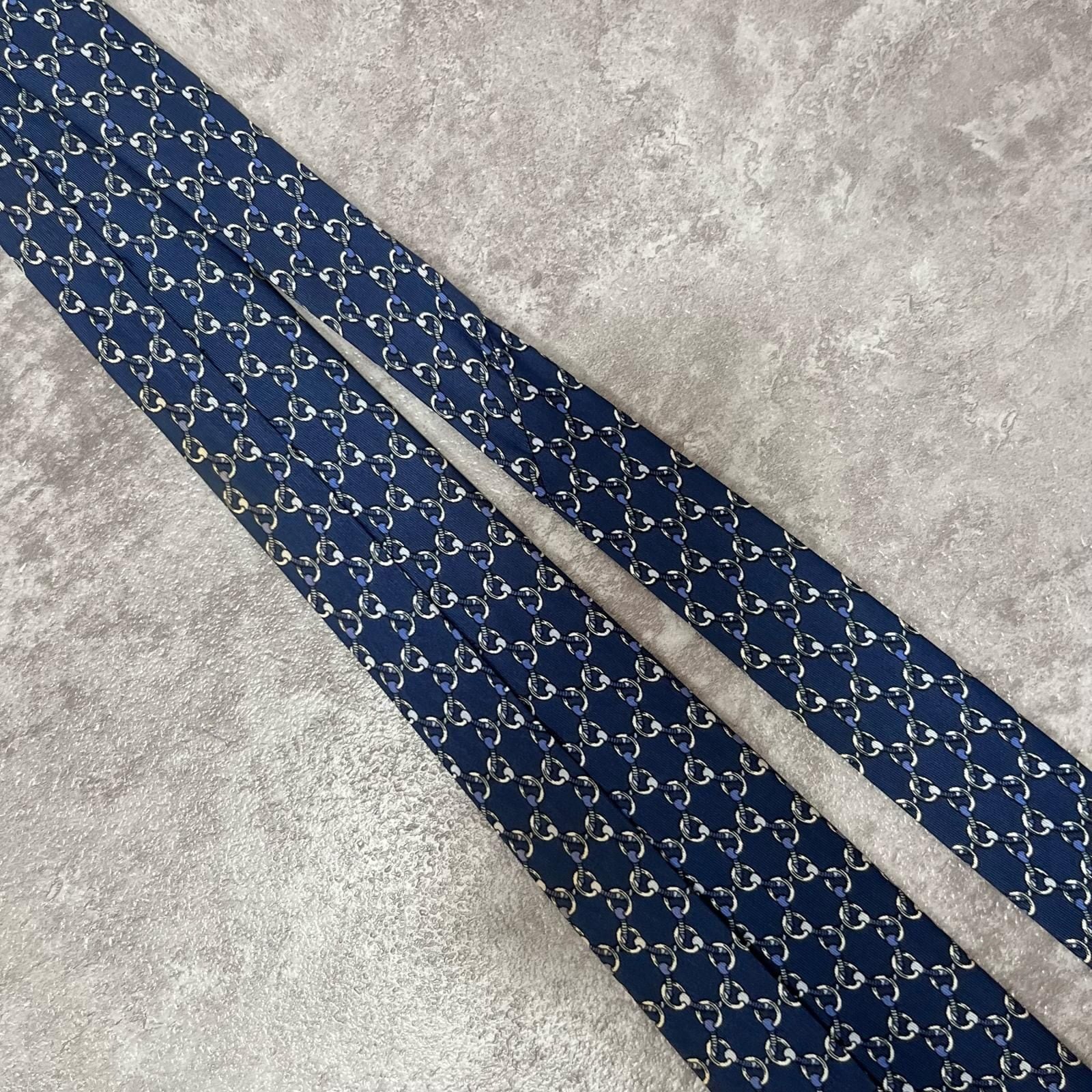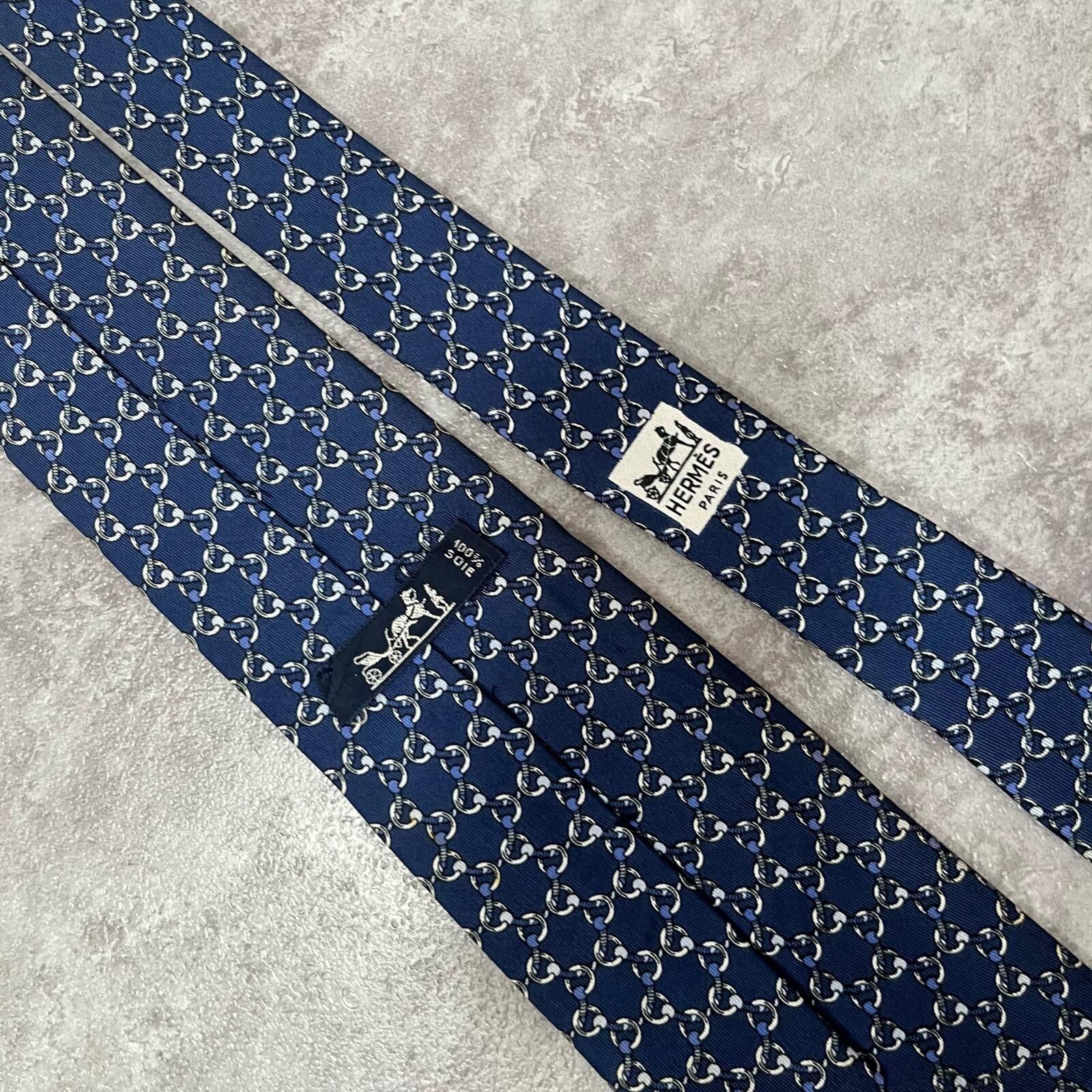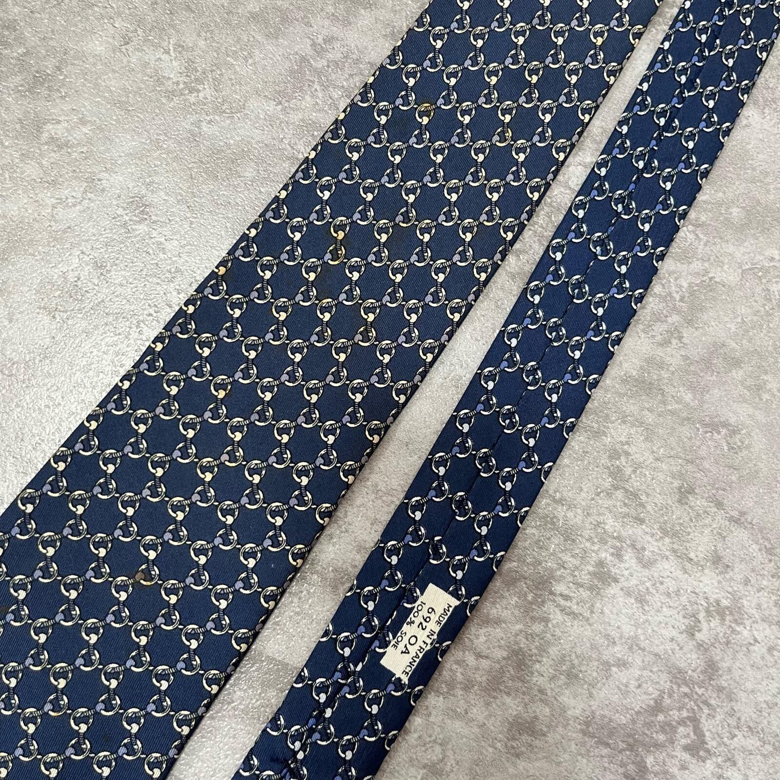 【HERMES】エルメス 特殊チェック柄ネクタイ サークル柄 チェーン柄 紐モチーフ シルク100% フランス製 メンズ ネイビー 紺色 ビジネス向け ヴィンテージエルメス Y2K