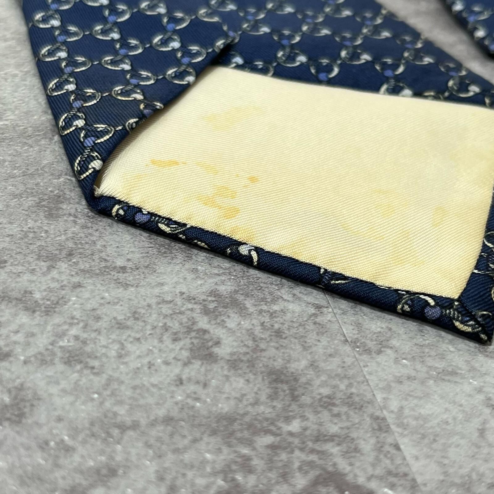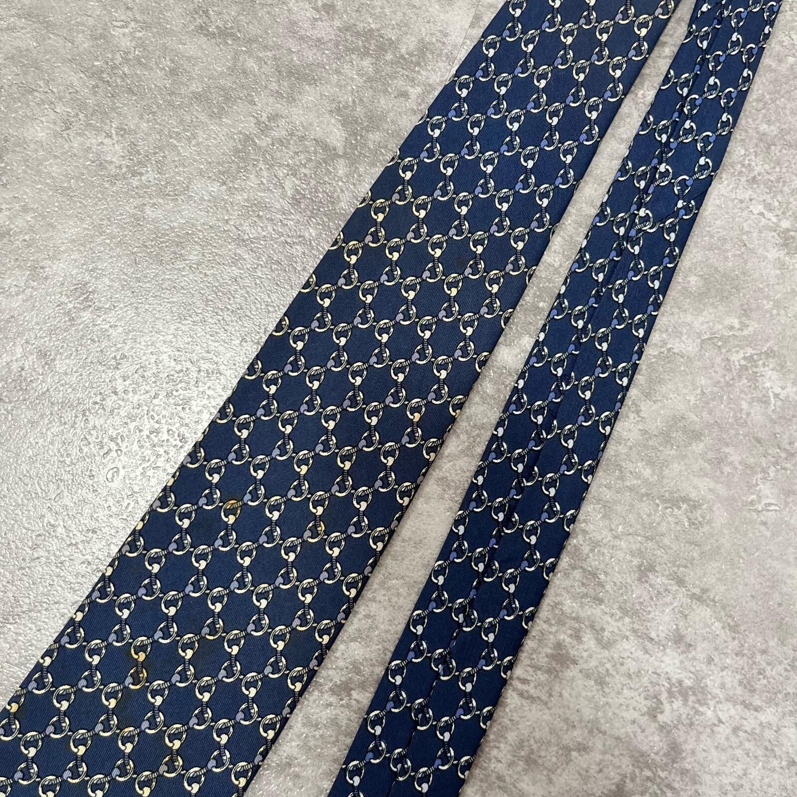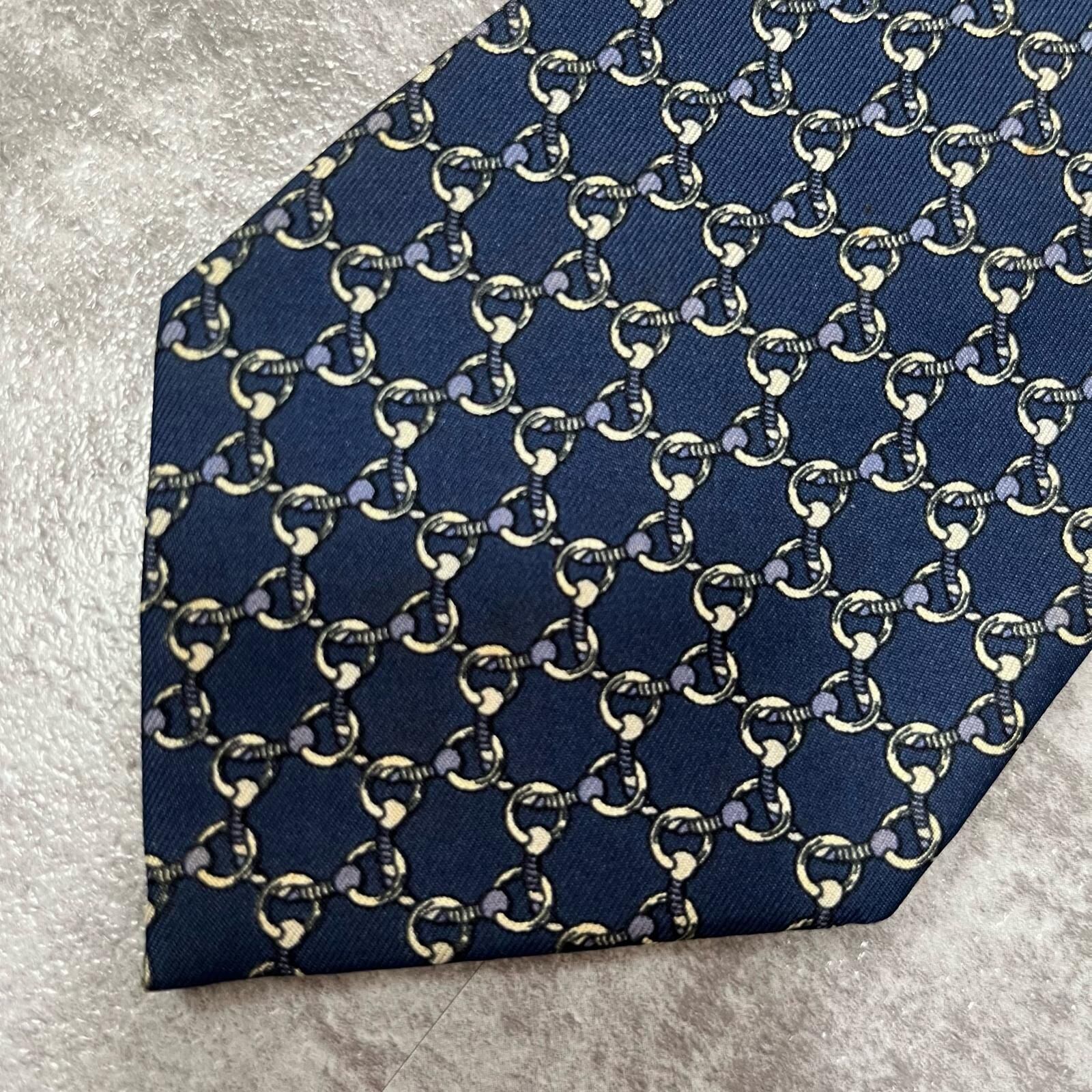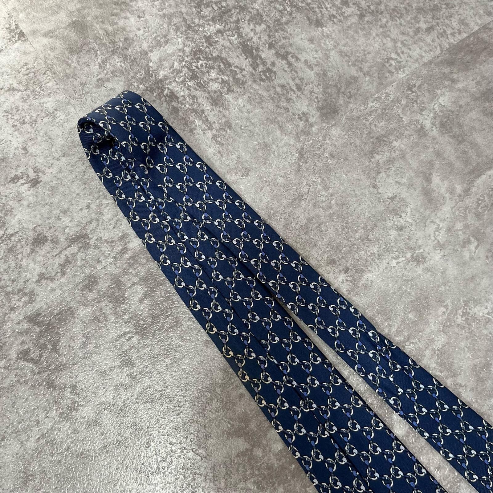 【HERMES】エルメス 特殊チェック柄ネクタイ サークル柄 チェーン柄 紐モチーフ シルク100% フランス製 メンズ ネイビー 紺色 ビジネス向け ヴィンテージエルメス Y2K