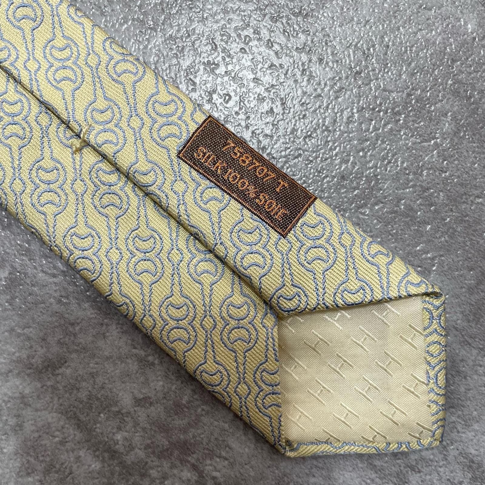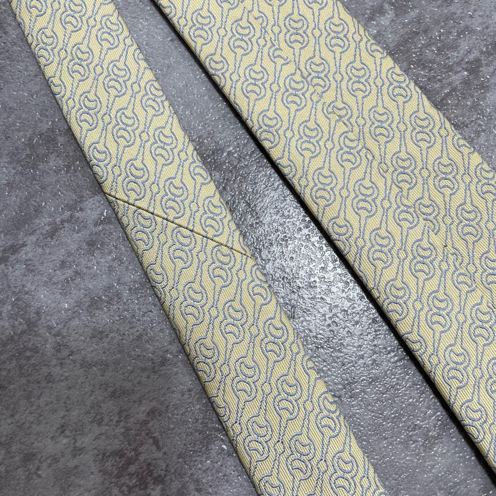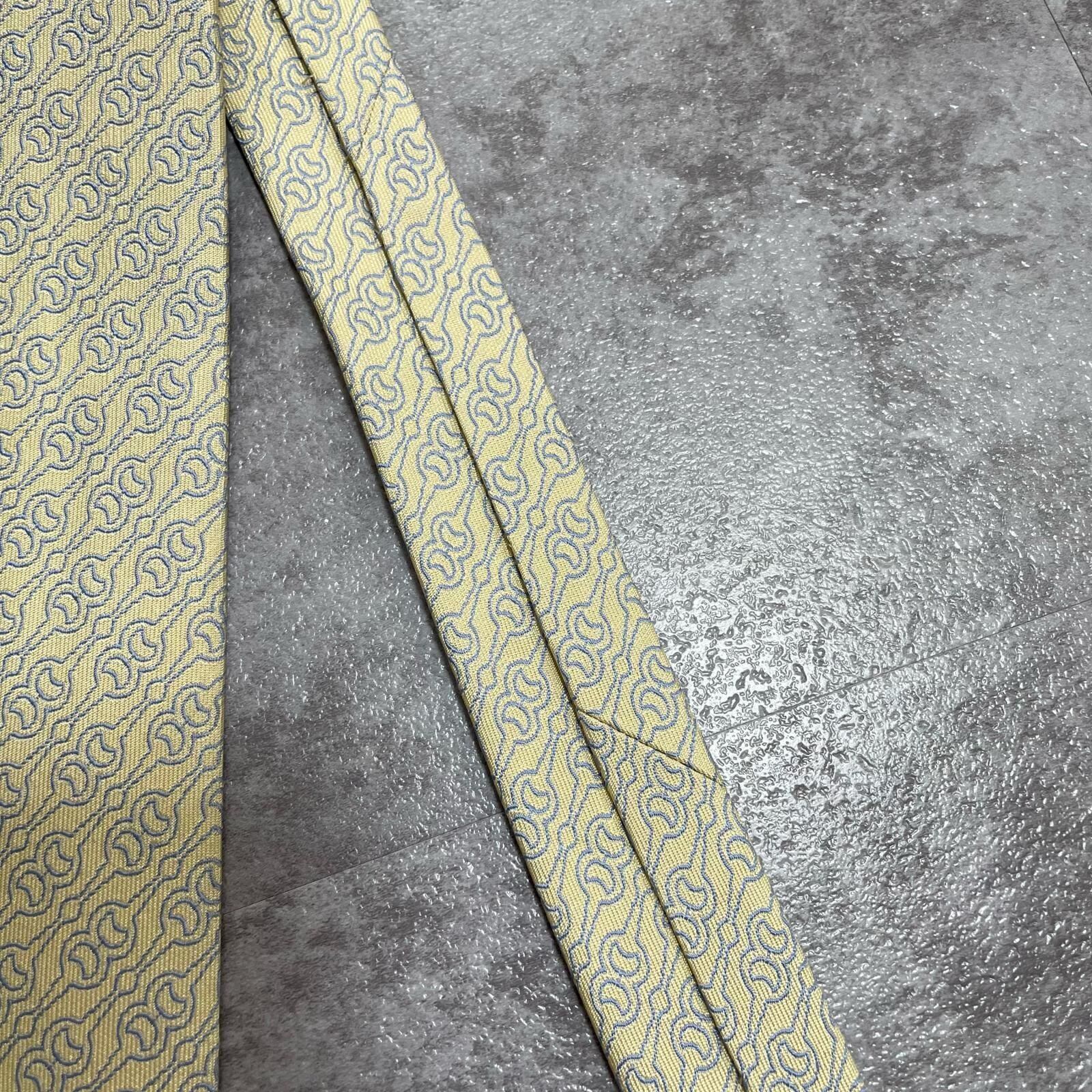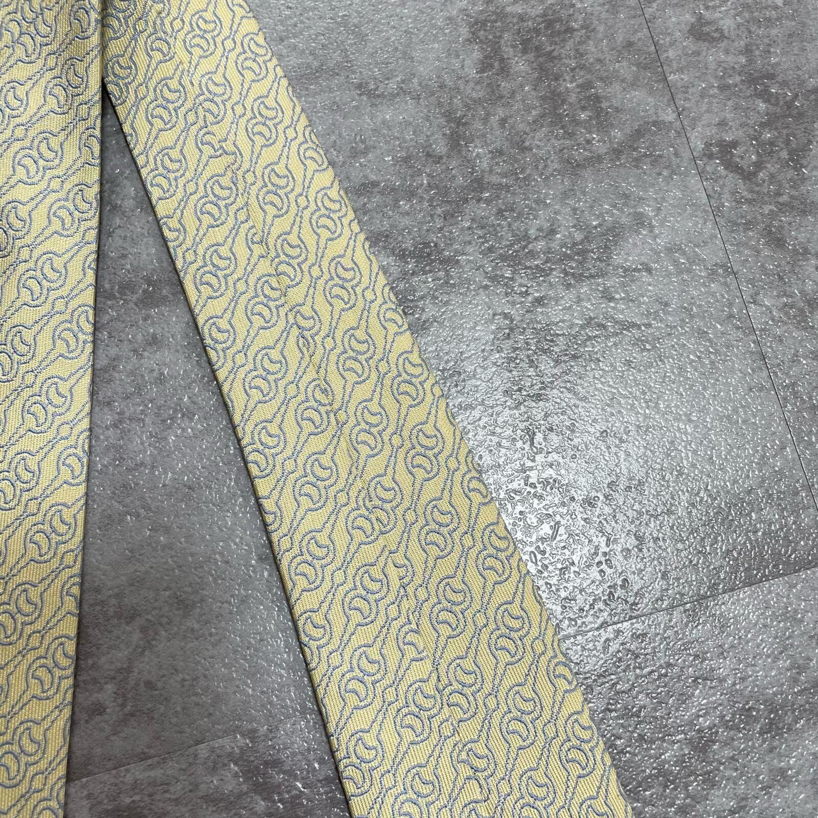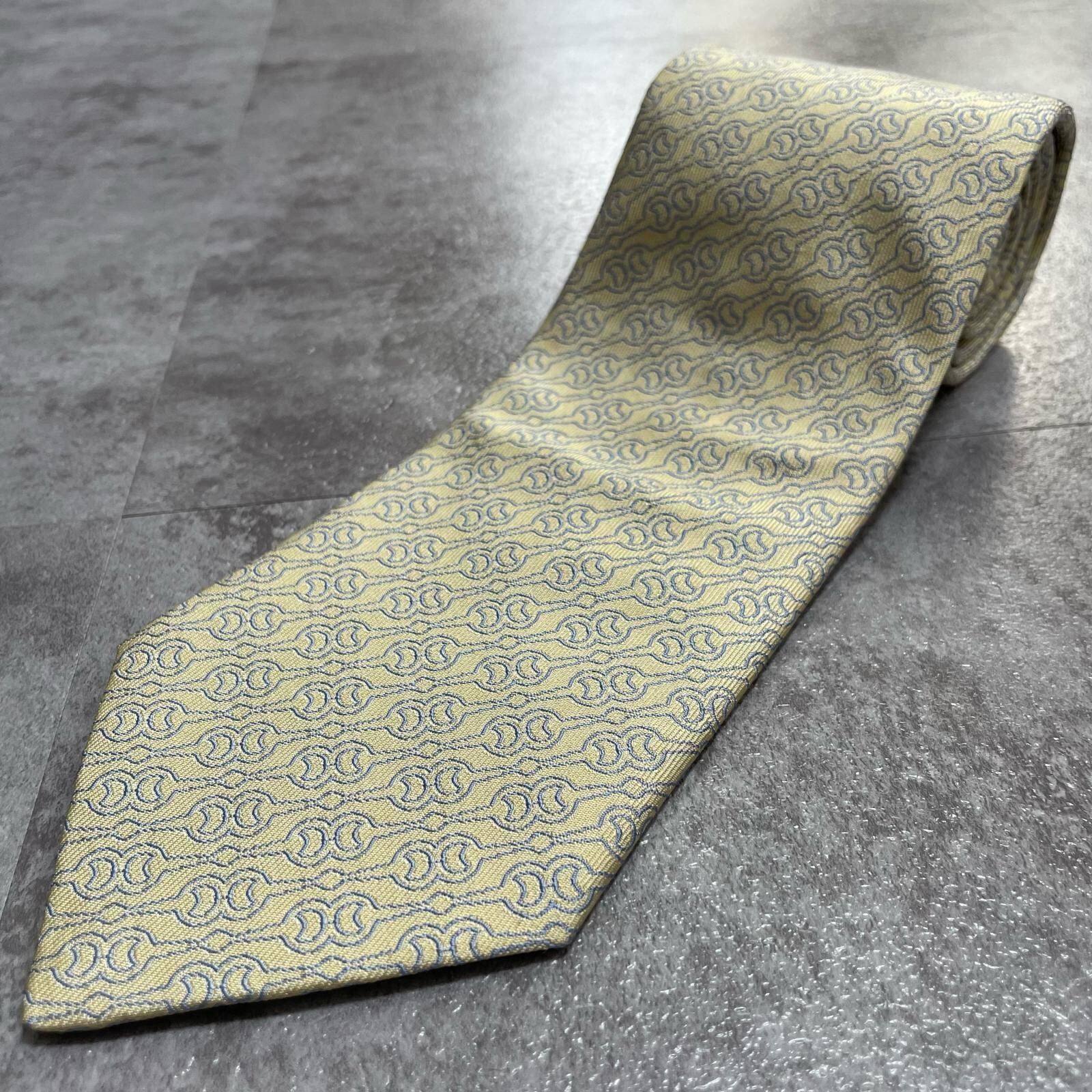 【HERMES】エルメス シェーヌダンクル総柄ネクタイ シルク100% メンズ フランス製 イエロー 黄色 チェーンモチーフ ブランドアイコン ジャガード織 ビジネス向け ヴィンテージ