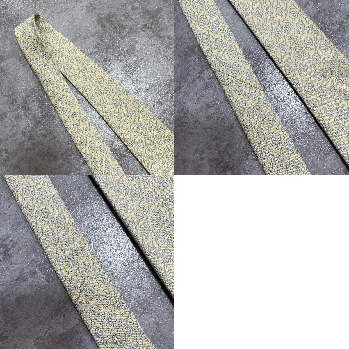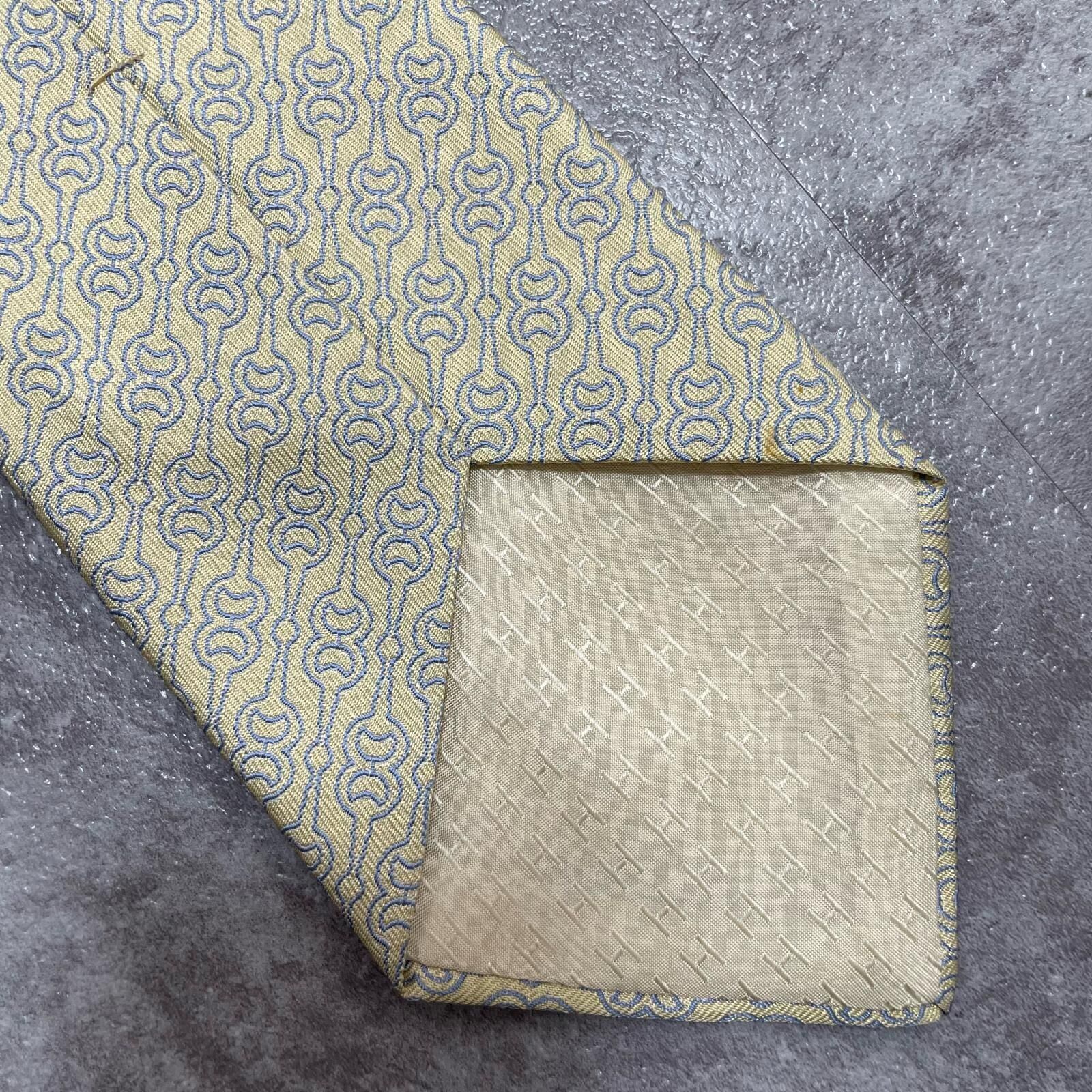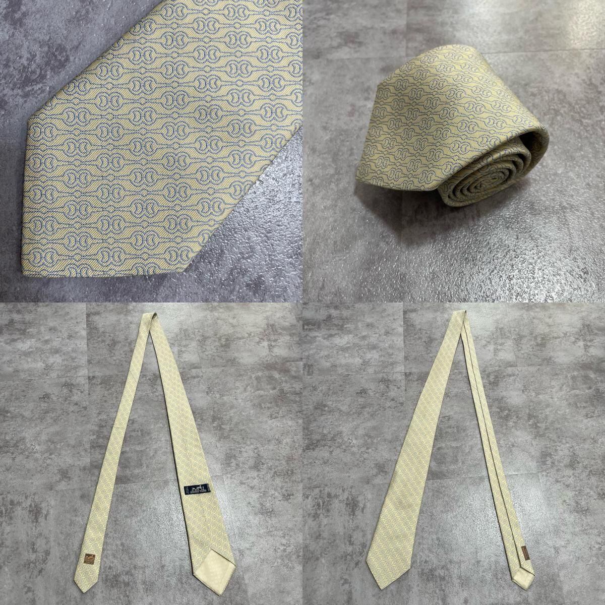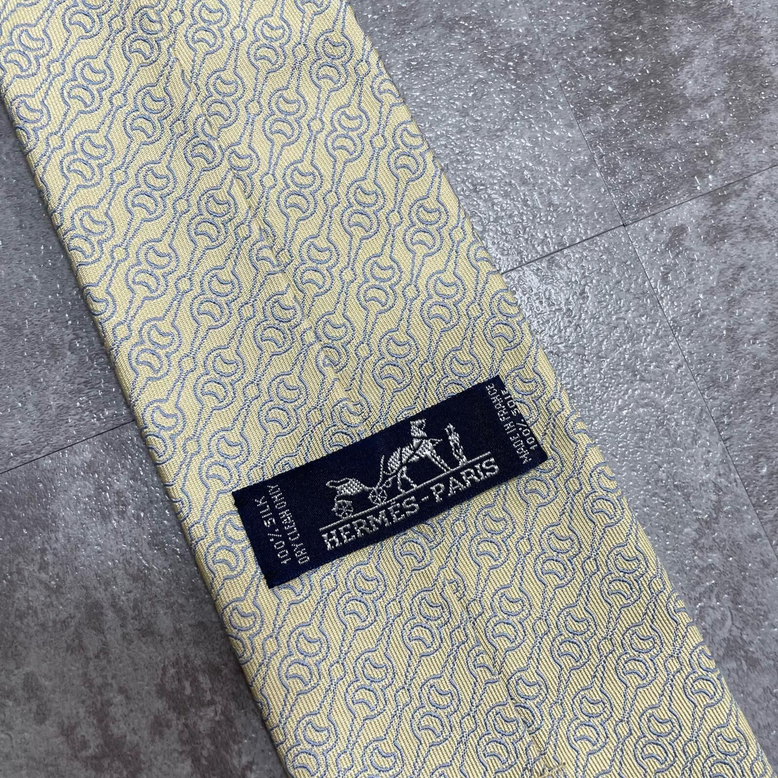 【HERMES】エルメス シェーヌダンクル総柄ネクタイ シルク100% メンズ フランス製 イエロー 黄色 チェーンモチーフ ブランドアイコン ジャガード織 ビジネス向け ヴィンテージ