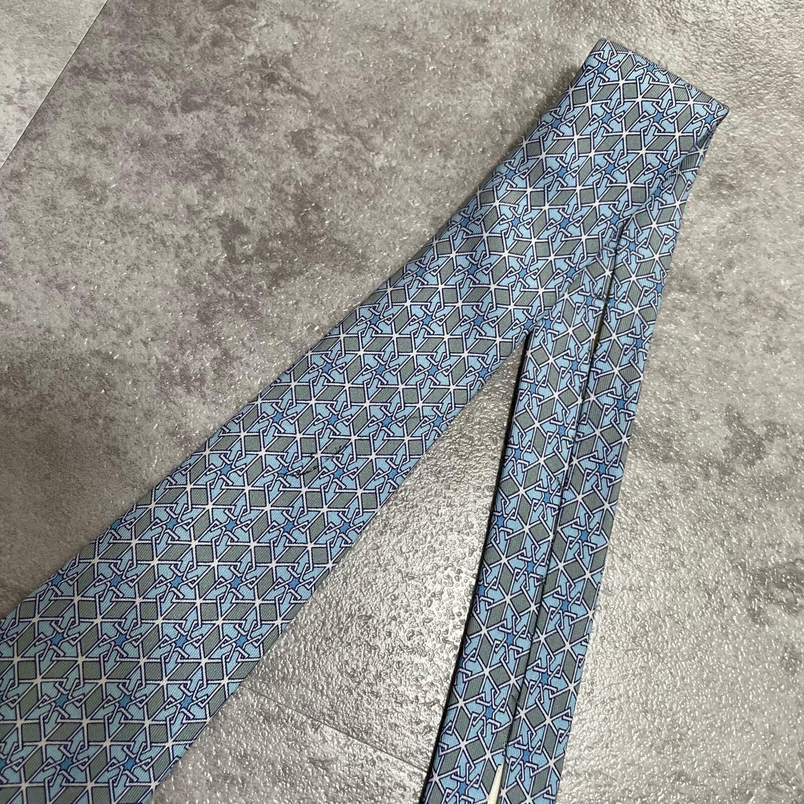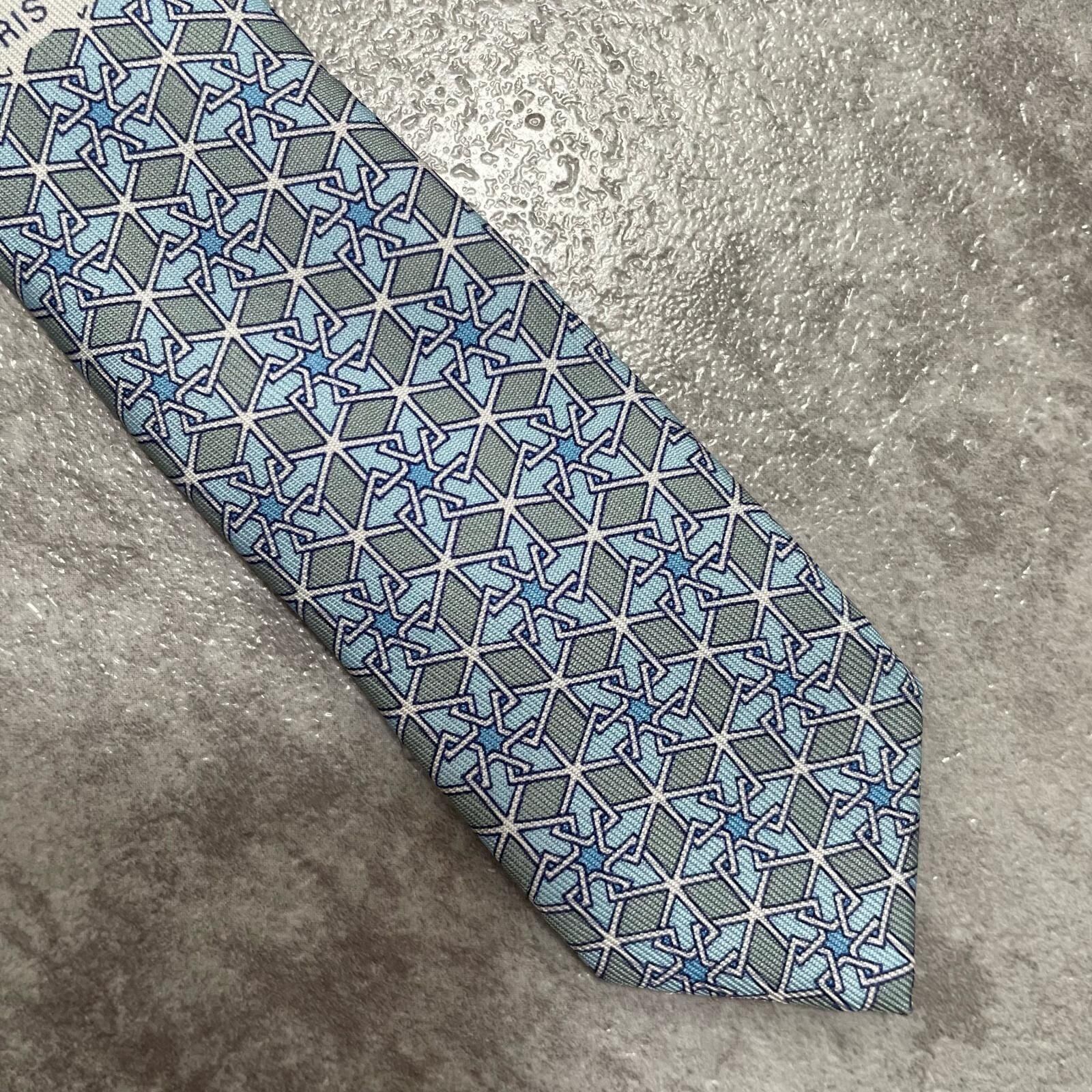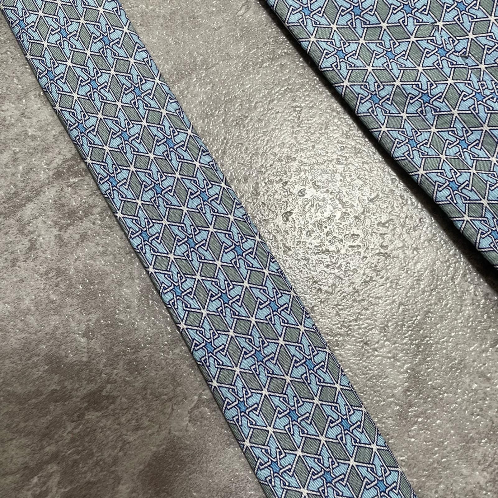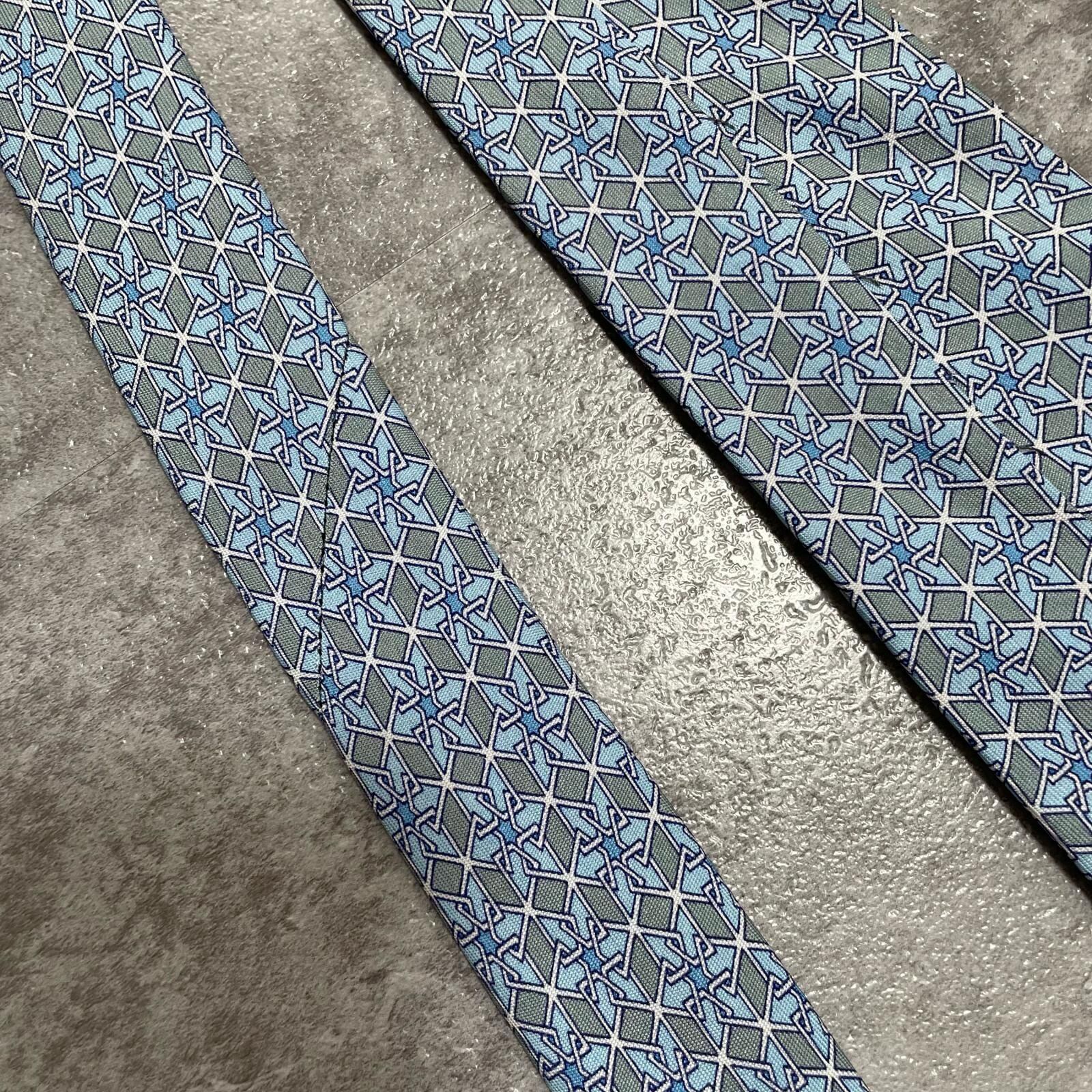 【HERMES】エルメス 幾何学柄ネクタイ シルク100% メンズ ブルー 青 水色 フランス製 ビジネス向け バイカラー